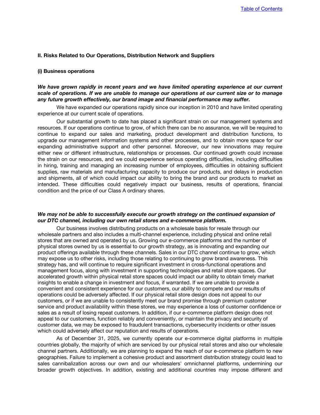 II. Risks Related to Our Operations, Distribution Network and Suppliers (i) Business operations We have grown rapidly in recent years and we have limited operating experience at our current scale of operations. If we are unable to manage our operations at our current size or to manage any future growth effectively, our brand image and financial performance may suffer. We have expanded our operations rapidly since our inception in 2010 and have limited operating experience at our current scale of operations. Our substantial growth to date has placed a significant strain on our management systems and resources. If our operations continue to grow, of which there can be no assurance, we will be required to continue to expand our sales and marketing, product development and distribution functions, to upgrade our management information systems and other processes, and to obtain more space for our expanding administrative support and other personnel. Moreover, our new innovations may require either new or different infrastructure, relationships or processes. Our continued growth could increase the strain on our resources, and we could experience serious operating difficulties, including difficulties in hiring, training and managing an increasing number of employees, difficulties in obtaining sufficient supplies, raw materials and manufacturing capacity to produce our products, and delays in production and shipments, all of which could impact our ability to bring the brand and our products to market as intended. These difficulties could negatively impact our business, results of operations, financial condition and the price of our Class A ordinary shares. We may not be able to successfully execute our growth strategy on the continued expansion of our DTC channel, including our own retail stores and e-commerce platform. Our business involves distributing products on a wholesale basis for resale through our wholesale partners and also includes a multi-channel experience, including physical and online retail stores that are owned and operated by us. Growing our e-commerce platforms and the number of physical stores owned by us is essential to our growth strategy, as is innovating and expanding our product offerings available through these channels. Sales in our DTC channel continue to grow, which may expose us to other risks, including those relating to continuing to grow brand awareness. This strategy has, and will continue to require significant investment in cross-functional operations and management focus, along with investment in supporting technologies and retail store spaces. Our accelerated growth within physical retail store spaces could impact our ability to obtain timely market insights to enable a change in investment and focus, if warranted. If we are unable to provide a convenient and consistent experience for our customers, our ability to compete and our results of operations could be adversely affected. If our physical retail store design does not appeal to our customers, or if we are unable to consistently meet our brand promise through premium customer service and product availability within these stores, we may experience a loss of customer confidence or sales as a result of losing repeat customers. In addition, if our e-commerce platform design does not appeal to our customers, function reliably and conveniently, or maintain the privacy and security of customer data, we may be exposed to fraudulent transactions, cybersecurity incidents or other issues which could adversely affect our reputation and results of operations. As of December 31, 2025, we currently operate our e-commerce digital platforms in multiple countries globally, the majority of which are serviced by our physical retail stores and also our wholesale channel partners. Additionally, we are planning to expand the reach of our e-commerce platform to new geographies. Failure to implement a cohesive product and assortment distribution strategy could lead to sales cannibalization across our own and our wholesalers' omnichannel platforms, undermining our broader growth objectives. In addition, existing and additional countries may impose different and Table of Contents