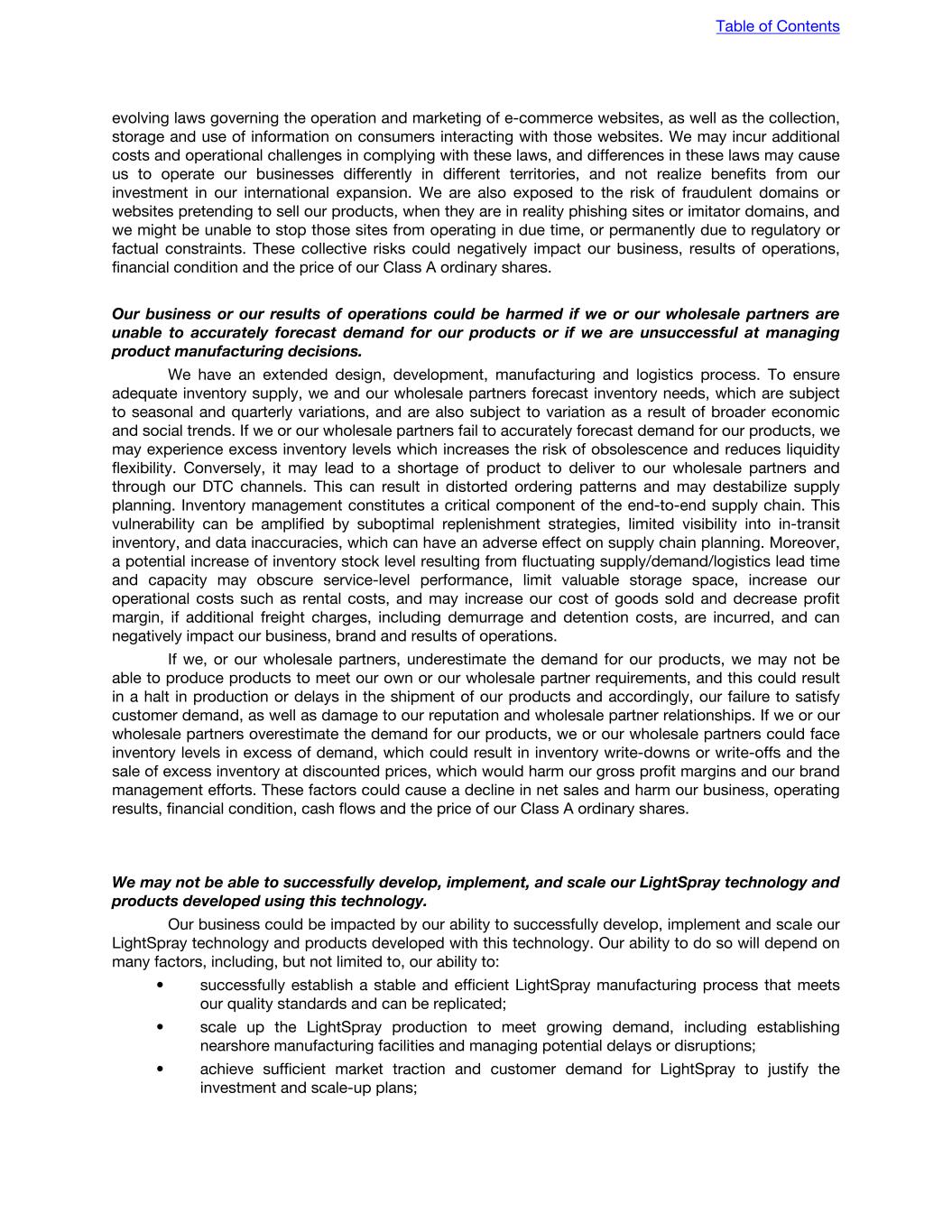 evolving laws governing the operation and marketing of e-commerce websites, as well as the collection, storage and use of information on consumers interacting with those websites. We may incur additional costs and operational challenges in complying with these laws, and differences in these laws may cause us to operate our businesses differently in different territories, and not realize benefits from our investment in our international expansion. We are also exposed to the risk of fraudulent domains or websites pretending to sell our products, when they are in reality phishing sites or imitator domains, and we might be unable to stop those sites from operating in due time, or permanently due to regulatory or factual constraints. These collective risks could negatively impact our business, results of operations, financial condition and the price of our Class A ordinary shares. Our business or our results of operations could be harmed if we or our wholesale partners are unable to accurately forecast demand for our products or if we are unsuccessful at managing product manufacturing decisions. We have an extended design, development, manufacturing and logistics process. To ensure adequate inventory supply, we and our wholesale partners forecast inventory needs, which are subject to seasonal and quarterly variations, and are also subject to variation as a result of broader economic and social trends. If we or our wholesale partners fail to accurately forecast demand for our products, we may experience excess inventory levels which increases the risk of obsolescence and reduces liquidity flexibility. Conversely, it may lead to a shortage of product to deliver to our wholesale partners and through our DTC channels. This can result in distorted ordering patterns and may destabilize supply planning. Inventory management constitutes a critical component of the end-to-end supply chain. This vulnerability can be amplified by suboptimal replenishment strategies, limited visibility into in-transit inventory, and data inaccuracies, which can have an adverse effect on supply chain planning. Moreover, a potential increase of inventory stock level resulting from fluctuating supply/demand/logistics lead time and capacity may obscure service-level performance, limit valuable storage space, increase our operational costs such as rental costs, and may increase our cost of goods sold and decrease profit margin, if additional freight charges, including demurrage and detention costs, are incurred, and can negatively impact our business, brand and results of operations. If we, or our wholesale partners, underestimate the demand for our products, we may not be able to produce products to meet our own or our wholesale partner requirements, and this could result in a halt in production or delays in the shipment of our products and accordingly, our failure to satisfy customer demand, as well as damage to our reputation and wholesale partner relationships. If we or our wholesale partners overestimate the demand for our products, we or our wholesale partners could face inventory levels in excess of demand, which could result in inventory write-downs or write-offs and the sale of excess inventory at discounted prices, which would harm our gross profit margins and our brand management efforts. These factors could cause a decline in net sales and harm our business, operating results, financial condition, cash flows and the price of our Class A ordinary shares. We may not be able to successfully develop, implement, and scale our LightSpray technology and products developed using this technology. Our business could be impacted by our ability to successfully develop, implement and scale our LightSpray technology and products developed with this technology. Our ability to do so will depend on many factors, including, but not limited to, our ability to: • successfully establish a stable and efficient LightSpray manufacturing process that meets our quality standards and can be replicated; • scale up the LightSpray production to meet growing demand, including establishing nearshore manufacturing facilities and managing potential delays or disruptions; • achieve sufficient market traction and customer demand for LightSpray to justify the investment and scale-up plans; Table of Contents
