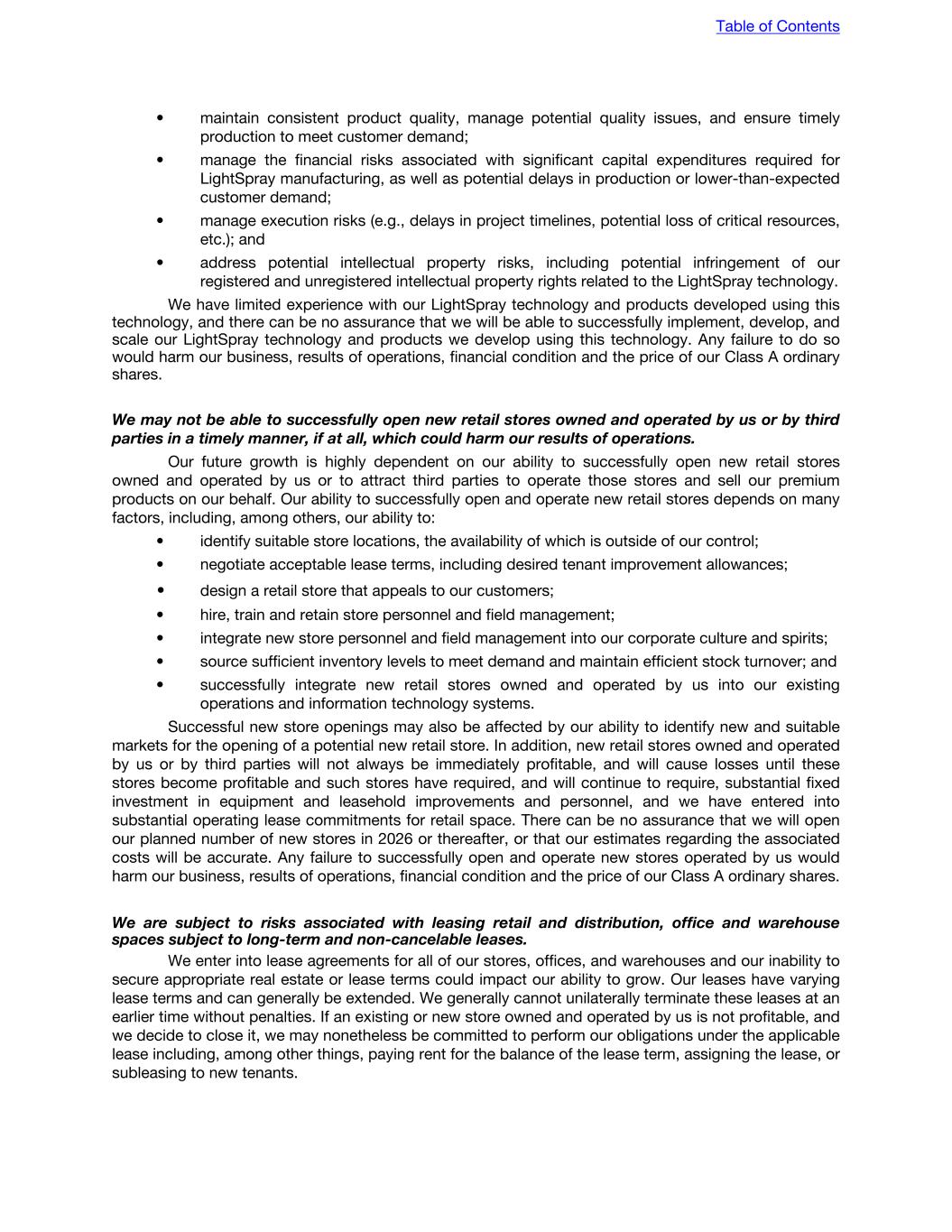 • maintain consistent product quality, manage potential quality issues, and ensure timely production to meet customer demand; • manage the financial risks associated with significant capital expenditures required for LightSpray manufacturing, as well as potential delays in production or lower-than-expected customer demand; • manage execution risks (e.g., delays in project timelines, potential loss of critical resources, etc.); and • address potential intellectual property risks, including potential infringement of our registered and unregistered intellectual property rights related to the LightSpray technology. We have limited experience with our LightSpray technology and products developed using this technology, and there can be no assurance that we will be able to successfully implement, develop, and scale our LightSpray technology and products we develop using this technology. Any failure to do so would harm our business, results of operations, financial condition and the price of our Class A ordinary shares. We may not be able to successfully open new retail stores owned and operated by us or by third parties in a timely manner, if at all, which could harm our results of operations. Our future growth is highly dependent on our ability to successfully open new retail stores owned and operated by us or to attract third parties to operate those stores and sell our premium products on our behalf. Our ability to successfully open and operate new retail stores depends on many factors, including, among others, our ability to: • identify suitable store locations, the availability of which is outside of our control; • negotiate acceptable lease terms, including desired tenant improvement allowances; • design a retail store that appeals to our customers; • hire, train and retain store personnel and field management; • integrate new store personnel and field management into our corporate culture and spirits; • source sufficient inventory levels to meet demand and maintain efficient stock turnover; and • successfully integrate new retail stores owned and operated by us into our existing operations and information technology systems. Successful new store openings may also be affected by our ability to identify new and suitable markets for the opening of a potential new retail store. In addition, new retail stores owned and operated by us or by third parties will not always be immediately profitable, and will cause losses until these stores become profitable and such stores have required, and will continue to require, substantial fixed investment in equipment and leasehold improvements and personnel, and we have entered into substantial operating lease commitments for retail space. There can be no assurance that we will open our planned number of new stores in 2026 or thereafter, or that our estimates regarding the associated costs will be accurate. Any failure to successfully open and operate new stores operated by us would harm our business, results of operations, financial condition and the price of our Class A ordinary shares. We are subject to risks associated with leasing retail and distribution, office and warehouse spaces subject to long-term and non-cancelable leases. We enter into lease agreements for all of our stores, offices, and warehouses and our inability to secure appropriate real estate or lease terms could impact our ability to grow. Our leases have varying lease terms and can generally be extended. We generally cannot unilaterally terminate these leases at an earlier time without penalties. If an existing or new store owned and operated by us is not profitable, and we decide to close it, we may nonetheless be committed to perform our obligations under the applicable lease including, among other things, paying rent for the balance of the lease term, assigning the lease, or subleasing to new tenants. Table of Contents