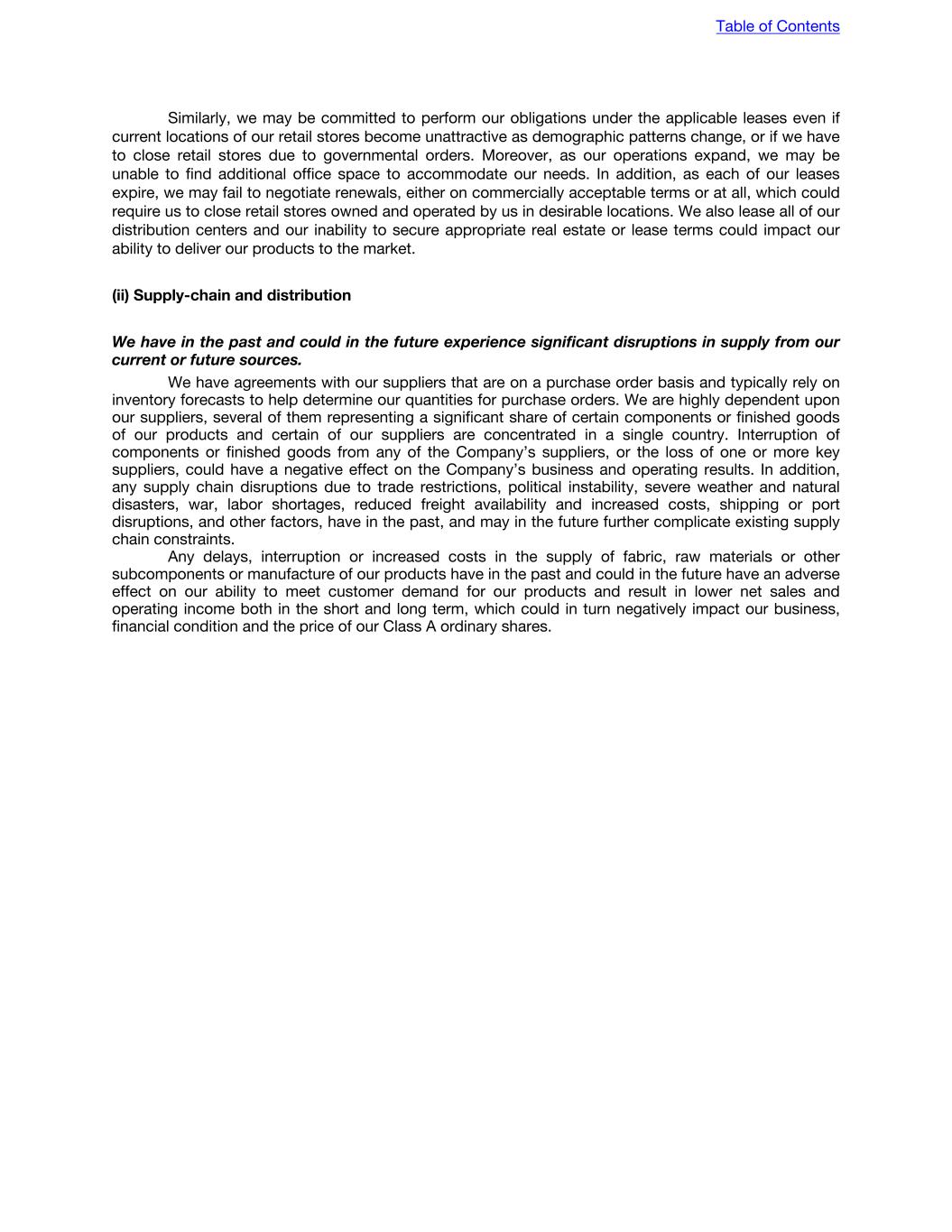 Similarly, we may be committed to perform our obligations under the applicable leases even if current locations of our retail stores become unattractive as demographic patterns change, or if we have to close retail stores due to governmental orders. Moreover, as our operations expand, we may be unable to find additional office space to accommodate our needs. In addition, as each of our leases expire, we may fail to negotiate renewals, either on commercially acceptable terms or at all, which could require us to close retail stores owned and operated by us in desirable locations. We also lease all of our distribution centers and our inability to secure appropriate real estate or lease terms could impact our ability to deliver our products to the market. (ii) Supply-chain and distribution We have in the past and could in the future experience significant disruptions in supply from our current or future sources. We have agreements with our suppliers that are on a purchase order basis and typically rely on inventory forecasts to help determine our quantities for purchase orders. We are highly dependent upon our suppliers, several of them representing a significant share of certain components or finished goods of our products and certain of our suppliers are concentrated in a single country. Interruption of components or finished goods from any of the Company’s suppliers, or the loss of one or more key suppliers, could have a negative effect on the Company’s business and operating results. In addition, any supply chain disruptions due to trade restrictions, political instability, severe weather and natural disasters, war, labor shortages, reduced freight availability and increased costs, shipping or port disruptions, and other factors, have in the past, and may in the future further complicate existing supply chain constraints. Any delays, interruption or increased costs in the supply of fabric, raw materials or other subcomponents or manufacture of our products have in the past and could in the future have an adverse effect on our ability to meet customer demand for our products and result in lower net sales and operating income both in the short and long term, which could in turn negatively impact our business, financial condition and the price of our Class A ordinary shares. Table of Contents