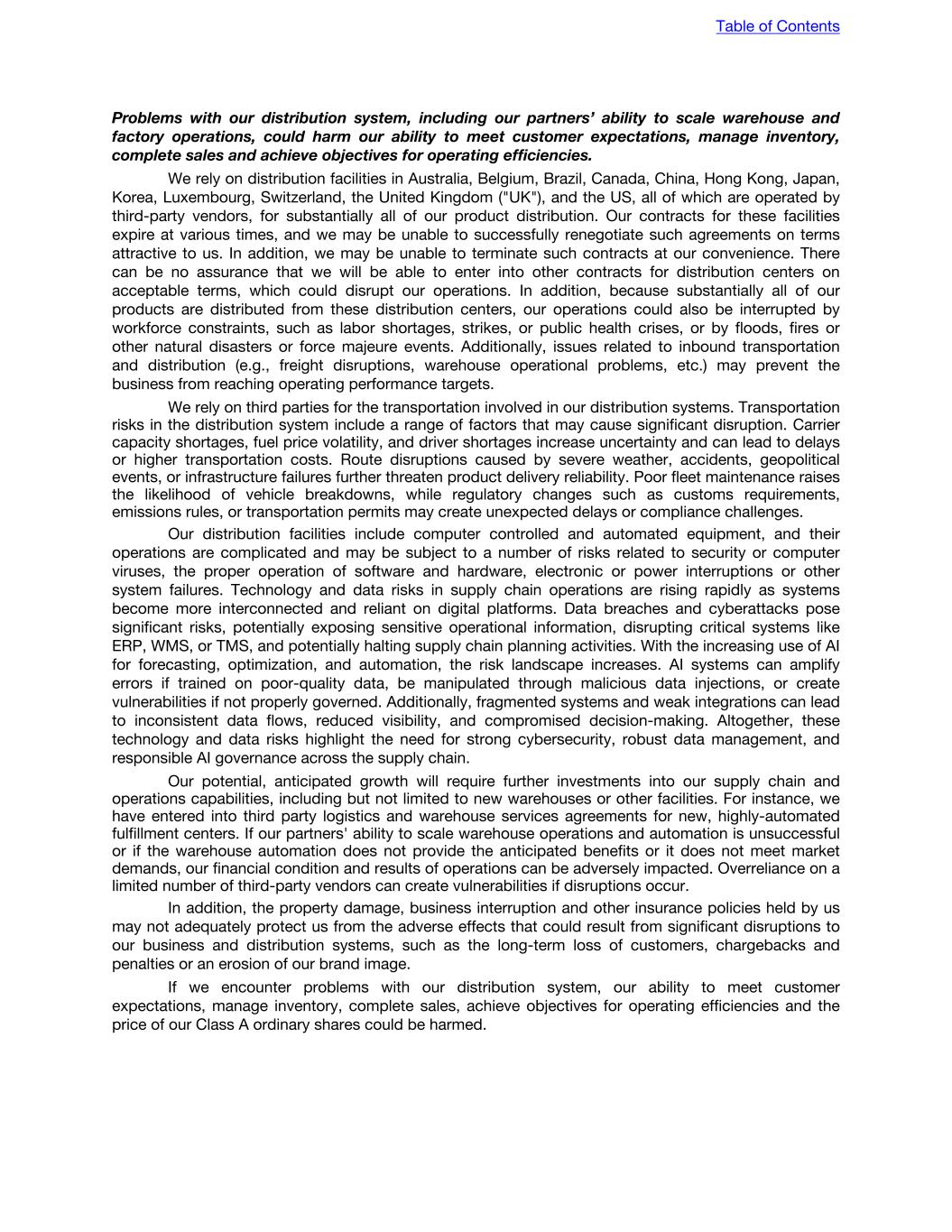 Problems with our distribution system, including our partners’ ability to scale warehouse and factory operations, could harm our ability to meet customer expectations, manage inventory, complete sales and achieve objectives for operating efficiencies. We rely on distribution facilities in Australia, Belgium, Brazil, Canada, China, Hong Kong, Japan, Korea, Luxembourg, Switzerland, the United Kingdom ("UK"), and the US, all of which are operated by third-party vendors, for substantially all of our product distribution. Our contracts for these facilities expire at various times, and we may be unable to successfully renegotiate such agreements on terms attractive to us. In addition, we may be unable to terminate such contracts at our convenience. There can be no assurance that we will be able to enter into other contracts for distribution centers on acceptable terms, which could disrupt our operations. In addition, because substantially all of our products are distributed from these distribution centers, our operations could also be interrupted by workforce constraints, such as labor shortages, strikes, or public health crises, or by floods, fires or other natural disasters or force majeure events. Additionally, issues related to inbound transportation and distribution (e.g., freight disruptions, warehouse operational problems, etc.) may prevent the business from reaching operating performance targets. We rely on third parties for the transportation involved in our distribution systems. Transportation risks in the distribution system include a range of factors that may cause significant disruption. Carrier capacity shortages, fuel price volatility, and driver shortages increase uncertainty and can lead to delays or higher transportation costs. Route disruptions caused by severe weather, accidents, geopolitical events, or infrastructure failures further threaten product delivery reliability. Poor fleet maintenance raises the likelihood of vehicle breakdowns, while regulatory changes such as customs requirements, emissions rules, or transportation permits may create unexpected delays or compliance challenges. Our distribution facilities include computer controlled and automated equipment, and their operations are complicated and may be subject to a number of risks related to security or computer viruses, the proper operation of software and hardware, electronic or power interruptions or other system failures. Technology and data risks in supply chain operations are rising rapidly as systems become more interconnected and reliant on digital platforms. Data breaches and cyberattacks pose significant risks, potentially exposing sensitive operational information, disrupting critical systems like ERP, WMS, or TMS, and potentially halting supply chain planning activities. With the increasing use of AI for forecasting, optimization, and automation, the risk landscape increases. AI systems can amplify errors if trained on poor-quality data, be manipulated through malicious data injections, or create vulnerabilities if not properly governed. Additionally, fragmented systems and weak integrations can lead to inconsistent data flows, reduced visibility, and compromised decision-making. Altogether, these technology and data risks highlight the need for strong cybersecurity, robust data management, and responsible AI governance across the supply chain. Our potential, anticipated growth will require further investments into our supply chain and operations capabilities, including but not limited to new warehouses or other facilities. For instance, we have entered into third party logistics and warehouse services agreements for new, highly-automated fulfillment centers. If our partners' ability to scale warehouse operations and automation is unsuccessful or if the warehouse automation does not provide the anticipated benefits or it does not meet market demands, our financial condition and results of operations can be adversely impacted. Overreliance on a limited number of third-party vendors can create vulnerabilities if disruptions occur. In addition, the property damage, business interruption and other insurance policies held by us may not adequately protect us from the adverse effects that could result from significant disruptions to our business and distribution systems, such as the long-term loss of customers, chargebacks and penalties or an erosion of our brand image. If we encounter problems with our distribution system, our ability to meet customer expectations, manage inventory, complete sales, achieve objectives for operating efficiencies and the price of our Class A ordinary shares could be harmed. Table of Contents
