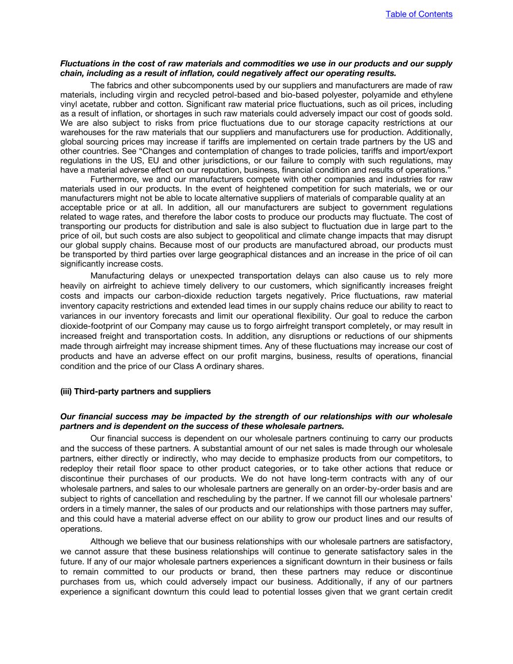 Fluctuations in the cost of raw materials and commodities we use in our products and our supply chain, including as a result of inflation, could negatively affect our operating results. The fabrics and other subcomponents used by our suppliers and manufacturers are made of raw materials, including virgin and recycled petrol-based and bio-based polyester, polyamide and ethylene vinyl acetate, rubber and cotton. Significant raw material price fluctuations, such as oil prices, including as a result of inflation, or shortages in such raw materials could adversely impact our cost of goods sold. We are also subject to risks from price fluctuations due to our storage capacity restrictions at our warehouses for the raw materials that our suppliers and manufacturers use for production. Additionally, global sourcing prices may increase if tariffs are implemented on certain trade partners by the US and other countries. See “Changes and contemplation of changes to trade policies, tariffs and import/export regulations in the US, EU and other jurisdictions, or our failure to comply with such regulations, may have a material adverse effect on our reputation, business, financial condition and results of operations.” Furthermore, we and our manufacturers compete with other companies and industries for raw materials used in our products. In the event of heightened competition for such materials, we or our manufacturers might not be able to locate alternative suppliers of materials of comparable quality at an acceptable price or at all. In addition, all our manufacturers are subject to government regulations related to wage rates, and therefore the labor costs to produce our products may fluctuate. The cost of transporting our products for distribution and sale is also subject to fluctuation due in large part to the price of oil, but such costs are also subject to geopolitical and climate change impacts that may disrupt our global supply chains. Because most of our products are manufactured abroad, our products must be transported by third parties over large geographical distances and an increase in the price of oil can significantly increase costs. Manufacturing delays or unexpected transportation delays can also cause us to rely more heavily on airfreight to achieve timely delivery to our customers, which significantly increases freight costs and impacts our carbon-dioxide reduction targets negatively. Price fluctuations, raw material inventory capacity restrictions and extended lead times in our supply chains reduce our ability to react to variances in our inventory forecasts and limit our operational flexibility. Our goal to reduce the carbon dioxide-footprint of our Company may cause us to forgo airfreight transport completely, or may result in increased freight and transportation costs. In addition, any disruptions or reductions of our shipments made through airfreight may increase shipment times. Any of these fluctuations may increase our cost of products and have an adverse effect on our profit margins, business, results of operations, financial condition and the price of our Class A ordinary shares. (iii) Third-party partners and suppliers Our financial success may be impacted by the strength of our relationships with our wholesale partners and is dependent on the success of these wholesale partners. Our financial success is dependent on our wholesale partners continuing to carry our products and the success of these partners. A substantial amount of our net sales is made through our wholesale partners, either directly or indirectly, who may decide to emphasize products from our competitors, to redeploy their retail floor space to other product categories, or to take other actions that reduce or discontinue their purchases of our products. We do not have long-term contracts with any of our wholesale partners, and sales to our wholesale partners are generally on an order-by-order basis and are subject to rights of cancellation and rescheduling by the partner. If we cannot fill our wholesale partners’ orders in a timely manner, the sales of our products and our relationships with those partners may suffer, and this could have a material adverse effect on our ability to grow our product lines and our results of operations. Although we believe that our business relationships with our wholesale partners are satisfactory, we cannot assure that these business relationships will continue to generate satisfactory sales in the future. If any of our major wholesale partners experiences a significant downturn in their business or fails to remain committed to our products or brand, then these partners may reduce or discontinue purchases from us, which could adversely impact our business. Additionally, if any of our partners experience a significant downturn this could lead to potential losses given that we grant certain credit Table of Contents