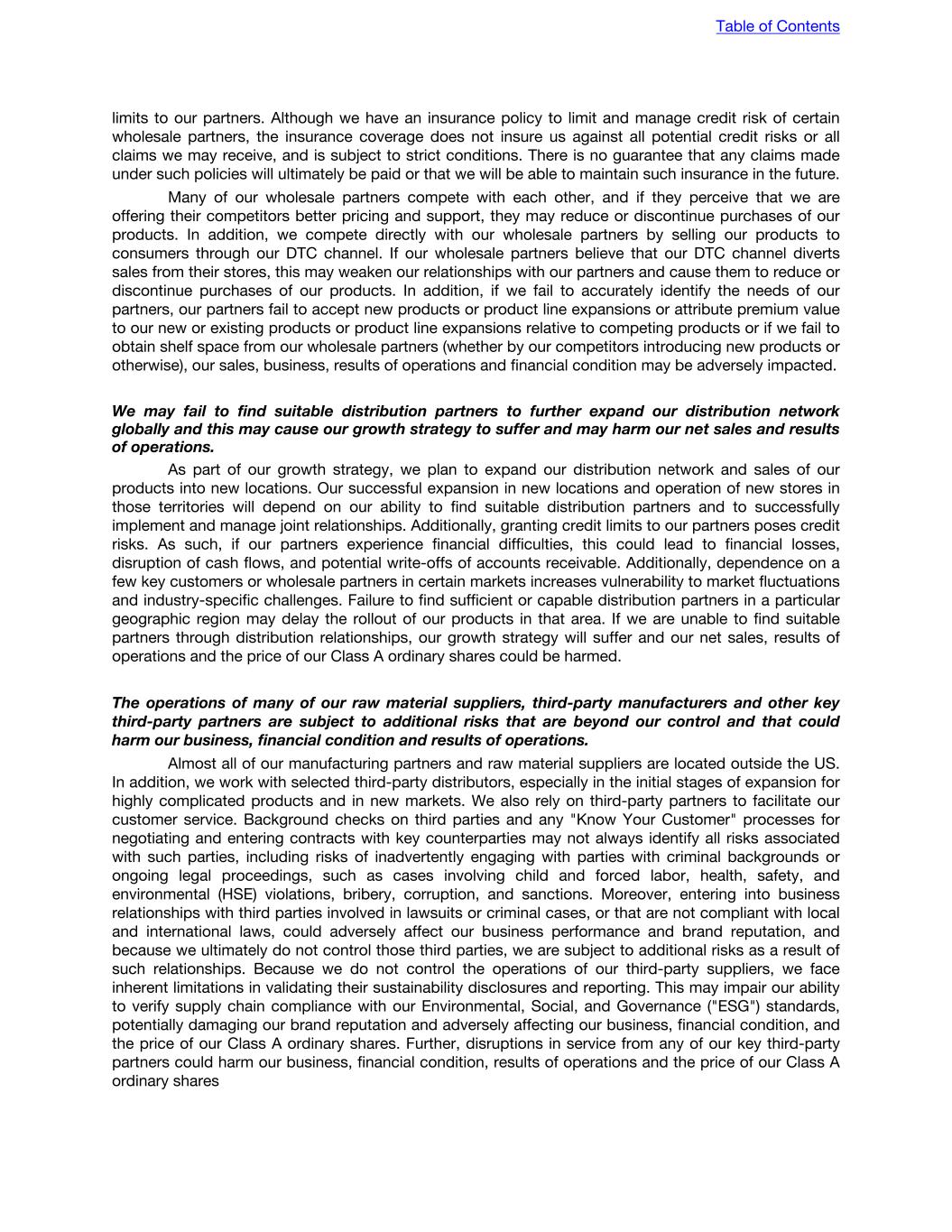 limits to our partners. Although we have an insurance policy to limit and manage credit risk of certain wholesale partners, the insurance coverage does not insure us against all potential credit risks or all claims we may receive, and is subject to strict conditions. There is no guarantee that any claims made under such policies will ultimately be paid or that we will be able to maintain such insurance in the future. Many of our wholesale partners compete with each other, and if they perceive that we are offering their competitors better pricing and support, they may reduce or discontinue purchases of our products. In addition, we compete directly with our wholesale partners by selling our products to consumers through our DTC channel. If our wholesale partners believe that our DTC channel diverts sales from their stores, this may weaken our relationships with our partners and cause them to reduce or discontinue purchases of our products. In addition, if we fail to accurately identify the needs of our partners, our partners fail to accept new products or product line expansions or attribute premium value to our new or existing products or product line expansions relative to competing products or if we fail to obtain shelf space from our wholesale partners (whether by our competitors introducing new products or otherwise), our sales, business, results of operations and financial condition may be adversely impacted. We may fail to find suitable distribution partners to further expand our distribution network globally and this may cause our growth strategy to suffer and may harm our net sales and results of operations. As part of our growth strategy, we plan to expand our distribution network and sales of our products into new locations. Our successful expansion in new locations and operation of new stores in those territories will depend on our ability to find suitable distribution partners and to successfully implement and manage joint relationships. Additionally, granting credit limits to our partners poses credit risks. As such, if our partners experience financial difficulties, this could lead to financial losses, disruption of cash flows, and potential write-offs of accounts receivable. Additionally, dependence on a few key customers or wholesale partners in certain markets increases vulnerability to market fluctuations and industry-specific challenges. Failure to find sufficient or capable distribution partners in a particular geographic region may delay the rollout of our products in that area. If we are unable to find suitable partners through distribution relationships, our growth strategy will suffer and our net sales, results of operations and the price of our Class A ordinary shares could be harmed. The operations of many of our raw material suppliers, third-party manufacturers and other key third-party partners are subject to additional risks that are beyond our control and that could harm our business, financial condition and results of operations. Almost all of our manufacturing partners and raw material suppliers are located outside the US. In addition, we work with selected third-party distributors, especially in the initial stages of expansion for highly complicated products and in new markets. We also rely on third-party partners to facilitate our customer service. Background checks on third parties and any "Know Your Customer" processes for negotiating and entering contracts with key counterparties may not always identify all risks associated with such parties, including risks of inadvertently engaging with parties with criminal backgrounds or ongoing legal proceedings, such as cases involving child and forced labor, health, safety, and environmental (HSE) violations, bribery, corruption, and sanctions. Moreover, entering into business relationships with third parties involved in lawsuits or criminal cases, or that are not compliant with local and international laws, could adversely affect our business performance and brand reputation, and because we ultimately do not control those third parties, we are subject to additional risks as a result of such relationships. Because we do not control the operations of our third-party suppliers, we face inherent limitations in validating their sustainability disclosures and reporting. This may impair our ability to verify supply chain compliance with our Environmental, Social, and Governance ("ESG") standards, potentially damaging our brand reputation and adversely affecting our business, financial condition, and the price of our Class A ordinary shares. Further, disruptions in service from any of our key third-party partners could harm our business, financial condition, results of operations and the price of our Class A ordinary shares Table of Contents