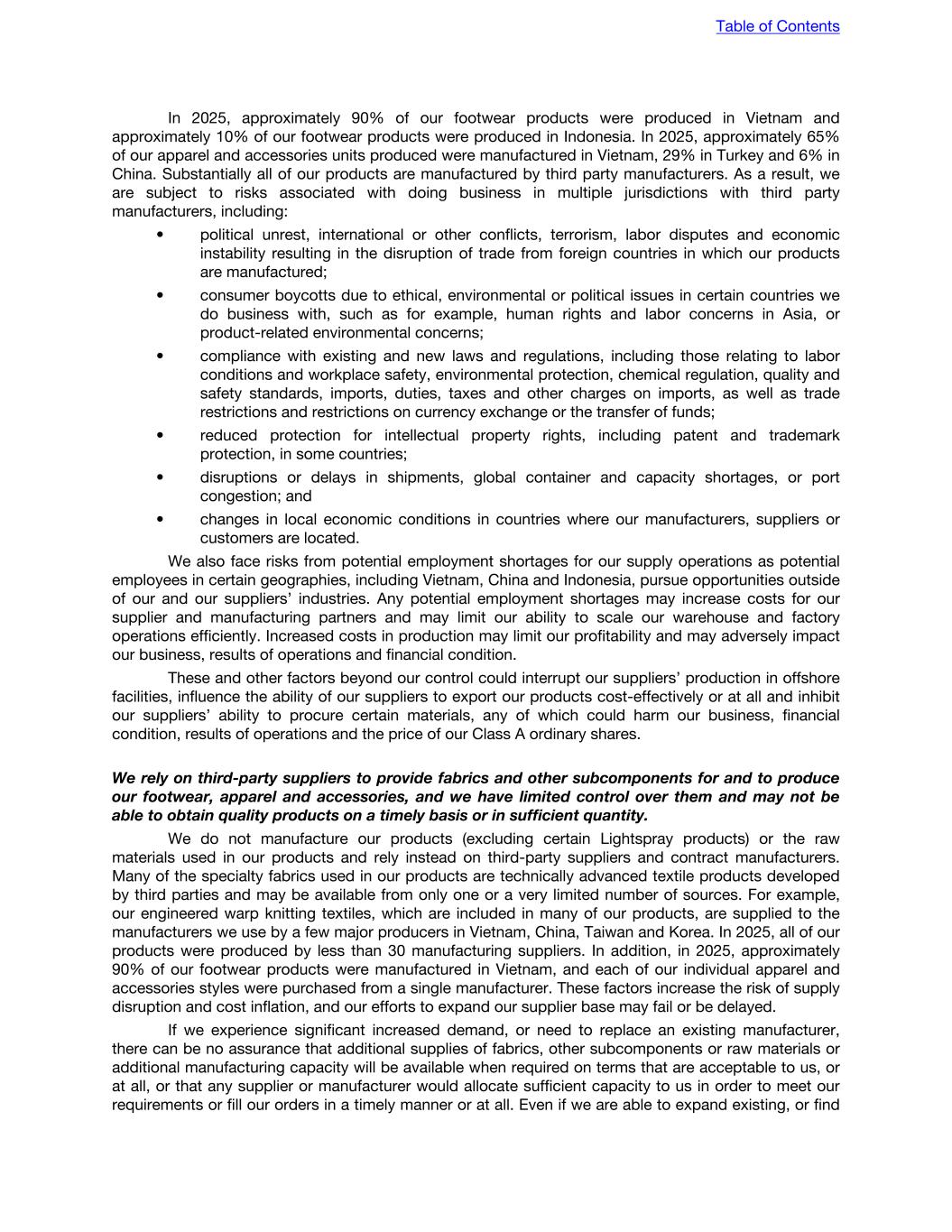 In 2025, approximately 90% of our footwear products were produced in Vietnam and approximately 10% of our footwear products were produced in Indonesia. In 2025, approximately 65% of our apparel and accessories units produced were manufactured in Vietnam, 29% in Turkey and 6% in China. Substantially all of our products are manufactured by third party manufacturers. As a result, we are subject to risks associated with doing business in multiple jurisdictions with third party manufacturers, including: • political unrest, international or other conflicts, terrorism, labor disputes and economic instability resulting in the disruption of trade from foreign countries in which our products are manufactured; • consumer boycotts due to ethical, environmental or political issues in certain countries we do business with, such as for example, human rights and labor concerns in Asia, or product-related environmental concerns; • compliance with existing and new laws and regulations, including those relating to labor conditions and workplace safety, environmental protection, chemical regulation, quality and safety standards, imports, duties, taxes and other charges on imports, as well as trade restrictions and restrictions on currency exchange or the transfer of funds; • reduced protection for intellectual property rights, including patent and trademark protection, in some countries; • disruptions or delays in shipments, global container and capacity shortages, or port congestion; and • changes in local economic conditions in countries where our manufacturers, suppliers or customers are located. We also face risks from potential employment shortages for our supply operations as potential employees in certain geographies, including Vietnam, China and Indonesia, pursue opportunities outside of our and our suppliers’ industries. Any potential employment shortages may increase costs for our supplier and manufacturing partners and may limit our ability to scale our warehouse and factory operations efficiently. Increased costs in production may limit our profitability and may adversely impact our business, results of operations and financial condition. These and other factors beyond our control could interrupt our suppliers’ production in offshore facilities, influence the ability of our suppliers to export our products cost-effectively or at all and inhibit our suppliers’ ability to procure certain materials, any of which could harm our business, financial condition, results of operations and the price of our Class A ordinary shares. We rely on third-party suppliers to provide fabrics and other subcomponents for and to produce our footwear, apparel and accessories, and we have limited control over them and may not be able to obtain quality products on a timely basis or in sufficient quantity. We do not manufacture our products (excluding certain Lightspray products) or the raw materials used in our products and rely instead on third-party suppliers and contract manufacturers. Many of the specialty fabrics used in our products are technically advanced textile products developed by third parties and may be available from only one or a very limited number of sources. For example, our engineered warp knitting textiles, which are included in many of our products, are supplied to the manufacturers we use by a few major producers in Vietnam, China, Taiwan and Korea. In 2025, all of our products were produced by less than 30 manufacturing suppliers. In addition, in 2025, approximately 90% of our footwear products were manufactured in Vietnam, and each of our individual apparel and accessories styles were purchased from a single manufacturer. These factors increase the risk of supply disruption and cost inflation, and our efforts to expand our supplier base may fail or be delayed. If we experience significant increased demand, or need to replace an existing manufacturer, there can be no assurance that additional supplies of fabrics, other subcomponents or raw materials or additional manufacturing capacity will be available when required on terms that are acceptable to us, or at all, or that any supplier or manufacturer would allocate sufficient capacity to us in order to meet our requirements or fill our orders in a timely manner or at all. Even if we are able to expand existing, or find Table of Contents