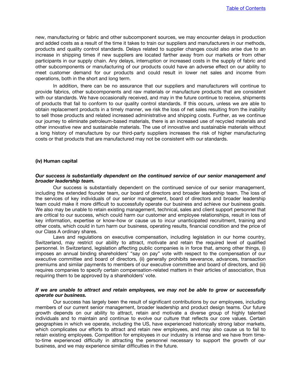 new, manufacturing or fabric and other subcomponent sources, we may encounter delays in production and added costs as a result of the time it takes to train our suppliers and manufacturers in our methods, products and quality control standards. Delays related to supplier changes could also arise due to an increase in shipping times if new suppliers are located farther away from our markets or from other participants in our supply chain. Any delays, interruption or increased costs in the supply of fabric and other subcomponents or manufacturing of our products could have an adverse effect on our ability to meet customer demand for our products and could result in lower net sales and income from operations, both in the short and long term. In addition, there can be no assurance that our suppliers and manufacturers will continue to provide fabrics, other subcomponents and raw materials or manufacture products that are consistent with our standards. We have occasionally received, and may in the future continue to receive, shipments of products that fail to conform to our quality control standards. If this occurs, unless we are able to obtain replacement products in a timely manner, we risk the loss of net sales resulting from the inability to sell those products and related increased administrative and shipping costs. Further, as we continue our journey to eliminate petroleum-based materials, there is an increased use of recycled materials and other innovative new and sustainable materials. The use of innovative and sustainable materials without a long history of manufacture by our third-party suppliers increases the risk of higher manufacturing costs or that products that are manufactured may not be consistent with our standards. (iv) Human capital Our success is substantially dependent on the continued service of our senior management and broader leadership team. Our success is substantially dependent on the continued service of our senior management, including the extended founder team, our board of directors and broader leadership team. The loss of the services of key individuals of our senior management, board of directors and broader leadership team could make it more difficult to successfully operate our business and achieve our business goals. We also may be unable to retain existing management, technical, sales and client support personnel that are critical to our success, which could harm our customer and employee relationships, result in loss of key information, expertise or know-how or cause us to incur unanticipated recruitment, training and other costs, which could in turn harm our business, operating results, financial condition and the price of our Class A ordinary shares. Laws and regulations on executive compensation, including legislation in our home country, Switzerland, may restrict our ability to attract, motivate and retain the required level of qualified personnel. In Switzerland, legislation affecting public companies is in force that, among other things, (i) imposes an annual binding shareholders’ “say on pay” vote with respect to the compensation of our executive committee and board of directors, (ii) generally prohibits severance, advances, transaction premiums and similar payments to members of our executive committee and board of directors, and (iii) requires companies to specify certain compensation-related matters in their articles of association, thus requiring them to be approved by a shareholders’ vote. If we are unable to attract and retain employees, we may not be able to grow or successfully operate our business. Our success has largely been the result of significant contributions by our employees, including members of our current senior management, broader leadership and product design teams. Our future growth depends on our ability to attract, retain and motivate a diverse group of highly talented individuals and to maintain and continue to evolve our culture that reflects our core values. Certain geographies in which we operate, including the US, have experienced historically strong labor markets, which complicates our efforts to attract and retain new employees, and may also cause us to fail to retain existing employees. Competition for employees in our industry is intense and we have from time- to-time experienced difficulty in attracting the personnel necessary to support the growth of our business, and we may experience similar difficulties in the future. Table of Contents