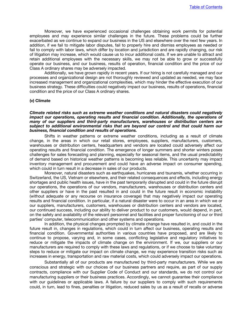 Moreover, we have experienced occasional challenges obtaining work permits for potential employees and may experience similar challenges in the future. These problems could be further exacerbated as we continue to expand our business in the US and elsewhere over the next few years. In addition, if we fail to mitigate labor disputes, fail to properly hire and dismiss employees as needed or fail to comply with labor laws, which differ by location and jurisdiction and are rapidly changing, our risk of litigation may increase, which would cause us to incur additional costs. If we are unable to attract and retain additional employees with the necessary skills, we may not be able to grow or successfully operate our business, and our business, results of operation, financial condition and the price of our Class A ordinary shares may be adversely impacted. Additionally, we have grown rapidly in recent years. If our hiring is not carefully managed and our processes and organizational design are not thoroughly reviewed and updated as needed, we may face increased management and organizational complexities, which may hinder the effective execution of our business strategy. These difficulties could negatively impact our business, results of operations, financial condition and the price of our Class A ordinary shares. (v) Climate Climate related risks such as extreme weather conditions and natural disasters could negatively impact our operations, operating results and financial condition. Additionally, the operations of many of our suppliers and third-party manufacturers, warehouses or distribution centers are subject to additional environmental risks that are beyond our control and that could harm our business, financial condition and results of operations. Shifts in weather patterns or extreme weather conditions, including as a result of climate change, in the areas in which our retail stores, employees, suppliers, manufacturers, customers, warehouses or distribution centers, headquarters and vendors are located could adversely affect our operating results and financial condition. The emergence of longer summers and shorter winters poses challenges for sales forecasting and planning, especially for seasonal items, and the usual predictability of demand based on historical weather patterns is becoming less reliable. This uncertainty may impact inventory management and procurement and could have an adverse impact on consumer spending, which could in turn result in a decrease in sales of our products. Moreover, natural disasters such as earthquakes, hurricanes and tsunamis, whether occurring in Switzerland, the US, Vietnam or elsewhere, and their related consequences and effects, including energy shortages and public health issues, have in the past temporarily disrupted and could in the future disrupt our operations, the operations of our vendors, manufacturers, warehouses or distribution centers and other suppliers or have in the past resulted in and could in the future result in economic instability (without adequate or any recourse on insurance coverage) that may negatively impact our operating results and financial condition. In particular, if a natural disaster were to occur in an area in which we or our suppliers, manufacturers, customers, warehouses or distribution centers and vendors are located, our continued success, including our ability to deliver product to our customers, would depend, in part, on the safety and availability of the relevant personnel and facilities and proper functioning of our or third parties’ computer, telecommunication and other systems and operations. In addition, the physical changes prompted by climate change have resulted in, and could in the future result in, changes in regulations, which could in turn affect our business, operating results and financial condition. Governmental authorities in various countries have proposed, and are likely to continue to propose, varying and, in some cases, conflicting legislative and regulatory initiatives to reduce or mitigate the impacts of climate change on the environment. If we, our suppliers or our manufacturers are required to comply with these laws and regulations, or if we choose to take voluntary steps to reduce or mitigate our impact on climate change, we may experience transition risks such as increases in energy, transportation and raw material costs, which could adversely impact our operations. Substantially all of our products are manufactured by third-party manufacturers. While we are conscious and strategic with our choices of our business partners and require, as part of our supply contracts, compliance with our Supplier Code of Conduct and our standards, we do not control our manufacturing suppliers or their business practices. Accordingly, we cannot guarantee their compliance with our guidelines or applicable laws. A failure by our suppliers to comply with such requirements could, in turn, lead to fines, penalties or litigation, reduced sales by us as a result of recalls or adverse Table of Contents