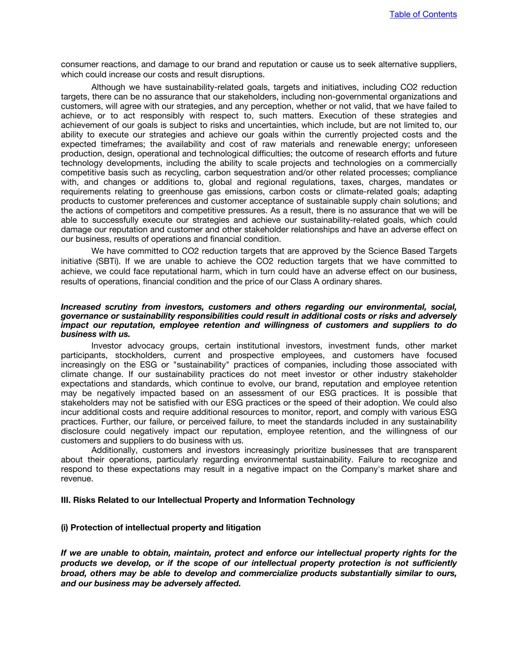 consumer reactions, and damage to our brand and reputation or cause us to seek alternative suppliers, which could increase our costs and result disruptions. Although we have sustainability-related goals, targets and initiatives, including CO2 reduction targets, there can be no assurance that our stakeholders, including non-governmental organizations and customers, will agree with our strategies, and any perception, whether or not valid, that we have failed to achieve, or to act responsibly with respect to, such matters. Execution of these strategies and achievement of our goals is subject to risks and uncertainties, which include, but are not limited to, our ability to execute our strategies and achieve our goals within the currently projected costs and the expected timeframes; the availability and cost of raw materials and renewable energy; unforeseen production, design, operational and technological difficulties; the outcome of research efforts and future technology developments, including the ability to scale projects and technologies on a commercially competitive basis such as recycling, carbon sequestration and/or other related processes; compliance with, and changes or additions to, global and regional regulations, taxes, charges, mandates or requirements relating to greenhouse gas emissions, carbon costs or climate-related goals; adapting products to customer preferences and customer acceptance of sustainable supply chain solutions; and the actions of competitors and competitive pressures. As a result, there is no assurance that we will be able to successfully execute our strategies and achieve our sustainability-related goals, which could damage our reputation and customer and other stakeholder relationships and have an adverse effect on our business, results of operations and financial condition. We have committed to CO2 reduction targets that are approved by the Science Based Targets initiative (SBTi). If we are unable to achieve the CO2 reduction targets that we have committed to achieve, we could face reputational harm, which in turn could have an adverse effect on our business, results of operations, financial condition and the price of our Class A ordinary shares. Increased scrutiny from investors, customers and others regarding our environmental, social, governance or sustainability responsibilities could result in additional costs or risks and adversely impact our reputation, employee retention and willingness of customers and suppliers to do business with us. Investor advocacy groups, certain institutional investors, investment funds, other market participants, stockholders, current and prospective employees, and customers have focused increasingly on the ESG or "sustainability" practices of companies, including those associated with climate change. If our sustainability practices do not meet investor or other industry stakeholder expectations and standards, which continue to evolve, our brand, reputation and employee retention may be negatively impacted based on an assessment of our ESG practices. It is possible that stakeholders may not be satisfied with our ESG practices or the speed of their adoption. We could also incur additional costs and require additional resources to monitor, report, and comply with various ESG practices. Further, our failure, or perceived failure, to meet the standards included in any sustainability disclosure could negatively impact our reputation, employee retention, and the willingness of our customers and suppliers to do business with us. Additionally, customers and investors increasingly prioritize businesses that are transparent about their operations, particularly regarding environmental sustainability. Failure to recognize and respond to these expectations may result in a negative impact on the Company's market share and revenue. III. Risks Related to our Intellectual Property and Information Technology (i) Protection of intellectual property and litigation If we are unable to obtain, maintain, protect and enforce our intellectual property rights for the products we develop, or if the scope of our intellectual property protection is not sufficiently broad, others may be able to develop and commercialize products substantially similar to ours, and our business may be adversely affected. Table of Contents