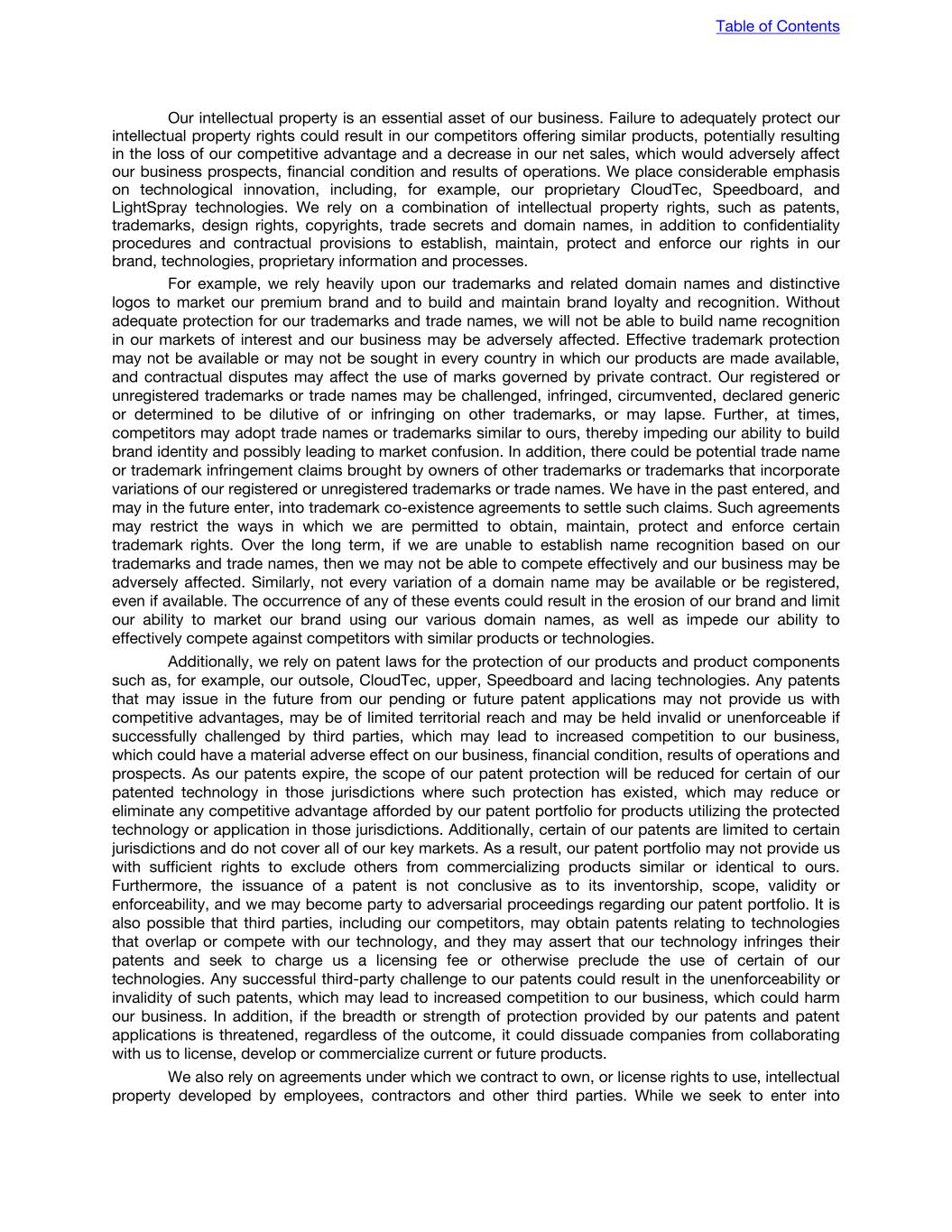 Our intellectual property is an essential asset of our business. Failure to adequately protect our intellectual property rights could result in our competitors offering similar products, potentially resulting in the loss of our competitive advantage and a decrease in our net sales, which would adversely affect our business prospects, financial condition and results of operations. We place considerable emphasis on technological innovation, including, for example, our proprietary CloudTec, Speedboard, and LightSpray technologies. We rely on a combination of intellectual property rights, such as patents, trademarks, design rights, copyrights, trade secrets and domain names, in addition to confidentiality procedures and contractual provisions to establish, maintain, protect and enforce our rights in our brand, technologies, proprietary information and processes. For example, we rely heavily upon our trademarks and related domain names and distinctive logos to market our premium brand and to build and maintain brand loyalty and recognition. Without adequate protection for our trademarks and trade names, we will not be able to build name recognition in our markets of interest and our business may be adversely affected. Effective trademark protection may not be available or may not be sought in every country in which our products are made available, and contractual disputes may affect the use of marks governed by private contract. Our registered or unregistered trademarks or trade names may be challenged, infringed, circumvented, declared generic or determined to be dilutive of or infringing on other trademarks, or may lapse. Further, at times, competitors may adopt trade names or trademarks similar to ours, thereby impeding our ability to build brand identity and possibly leading to market confusion. In addition, there could be potential trade name or trademark infringement claims brought by owners of other trademarks or trademarks that incorporate variations of our registered or unregistered trademarks or trade names. We have in the past entered, and may in the future enter, into trademark co-existence agreements to settle such claims. Such agreements may restrict the ways in which we are permitted to obtain, maintain, protect and enforce certain trademark rights. Over the long term, if we are unable to establish name recognition based on our trademarks and trade names, then we may not be able to compete effectively and our business may be adversely affected. Similarly, not every variation of a domain name may be available or be registered, even if available. The occurrence of any of these events could result in the erosion of our brand and limit our ability to market our brand using our various domain names, as well as impede our ability to effectively compete against competitors with similar products or technologies. Additionally, we rely on patent laws for the protection of our products and product components such as, for example, our outsole, CloudTec, upper, Speedboard and lacing technologies. Any patents that may issue in the future from our pending or future patent applications may not provide us with competitive advantages, may be of limited territorial reach and may be held invalid or unenforceable if successfully challenged by third parties, which may lead to increased competition to our business, which could have a material adverse effect on our business, financial condition, results of operations and prospects. As our patents expire, the scope of our patent protection will be reduced for certain of our patented technology in those jurisdictions where such protection has existed, which may reduce or eliminate any competitive advantage afforded by our patent portfolio for products utilizing the protected technology or application in those jurisdictions. Additionally, certain of our patents are limited to certain jurisdictions and do not cover all of our key markets. As a result, our patent portfolio may not provide us with sufficient rights to exclude others from commercializing products similar or identical to ours. Furthermore, the issuance of a patent is not conclusive as to its inventorship, scope, validity or enforceability, and we may become party to adversarial proceedings regarding our patent portfolio. It is also possible that third parties, including our competitors, may obtain patents relating to technologies that overlap or compete with our technology, and they may assert that our technology infringes their patents and seek to charge us a licensing fee or otherwise preclude the use of certain of our technologies. Any successful third-party challenge to our patents could result in the unenforceability or invalidity of such patents, which may lead to increased competition to our business, which could harm our business. In addition, if the breadth or strength of protection provided by our patents and patent applications is threatened, regardless of the outcome, it could dissuade companies from collaborating with us to license, develop or commercialize current or future products. We also rely on agreements under which we contract to own, or license rights to use, intellectual property developed by employees, contractors and other third parties. While we seek to enter into Table of Contents