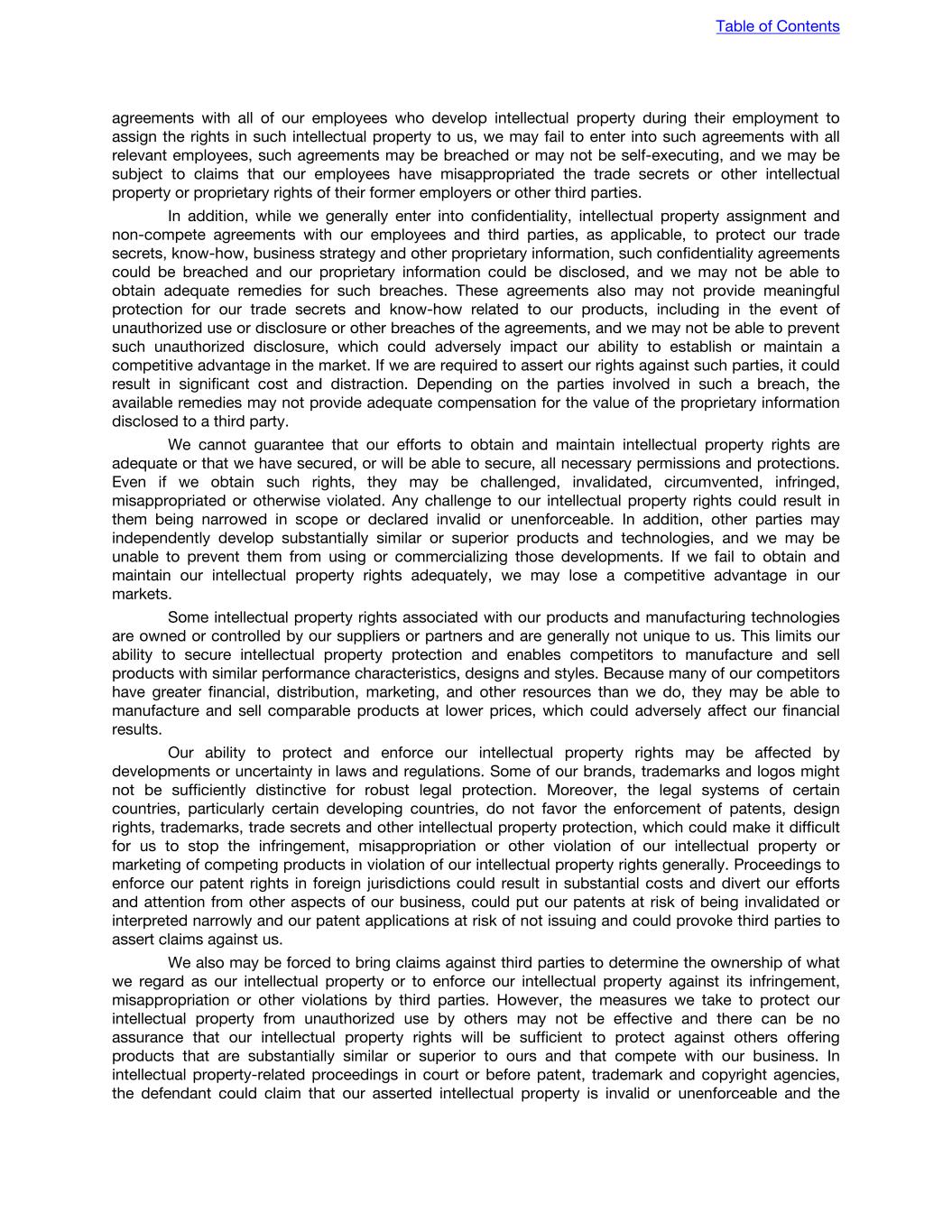 agreements with all of our employees who develop intellectual property during their employment to assign the rights in such intellectual property to us, we may fail to enter into such agreements with all relevant employees, such agreements may be breached or may not be self-executing, and we may be subject to claims that our employees have misappropriated the trade secrets or other intellectual property or proprietary rights of their former employers or other third parties. In addition, while we generally enter into confidentiality, intellectual property assignment and non-compete agreements with our employees and third parties, as applicable, to protect our trade secrets, know-how, business strategy and other proprietary information, such confidentiality agreements could be breached and our proprietary information could be disclosed, and we may not be able to obtain adequate remedies for such breaches. These agreements also may not provide meaningful protection for our trade secrets and know-how related to our products, including in the event of unauthorized use or disclosure or other breaches of the agreements, and we may not be able to prevent such unauthorized disclosure, which could adversely impact our ability to establish or maintain a competitive advantage in the market. If we are required to assert our rights against such parties, it could result in significant cost and distraction. Depending on the parties involved in such a breach, the available remedies may not provide adequate compensation for the value of the proprietary information disclosed to a third party. We cannot guarantee that our efforts to obtain and maintain intellectual property rights are adequate or that we have secured, or will be able to secure, all necessary permissions and protections. Even if we obtain such rights, they may be challenged, invalidated, circumvented, infringed, misappropriated or otherwise violated. Any challenge to our intellectual property rights could result in them being narrowed in scope or declared invalid or unenforceable. In addition, other parties may independently develop substantially similar or superior products and technologies, and we may be unable to prevent them from using or commercializing those developments. If we fail to obtain and maintain our intellectual property rights adequately, we may lose a competitive advantage in our markets. Some intellectual property rights associated with our products and manufacturing technologies are owned or controlled by our suppliers or partners and are generally not unique to us. This limits our ability to secure intellectual property protection and enables competitors to manufacture and sell products with similar performance characteristics, designs and styles. Because many of our competitors have greater financial, distribution, marketing, and other resources than we do, they may be able to manufacture and sell comparable products at lower prices, which could adversely affect our financial results. Our ability to protect and enforce our intellectual property rights may be affected by developments or uncertainty in laws and regulations. Some of our brands, trademarks and logos might not be sufficiently distinctive for robust legal protection. Moreover, the legal systems of certain countries, particularly certain developing countries, do not favor the enforcement of patents, design rights, trademarks, trade secrets and other intellectual property protection, which could make it difficult for us to stop the infringement, misappropriation or other violation of our intellectual property or marketing of competing products in violation of our intellectual property rights generally. Proceedings to enforce our patent rights in foreign jurisdictions could result in substantial costs and divert our efforts and attention from other aspects of our business, could put our patents at risk of being invalidated or interpreted narrowly and our patent applications at risk of not issuing and could provoke third parties to assert claims against us. We also may be forced to bring claims against third parties to determine the ownership of what we regard as our intellectual property or to enforce our intellectual property against its infringement, misappropriation or other violations by third parties. However, the measures we take to protect our intellectual property from unauthorized use by others may not be effective and there can be no assurance that our intellectual property rights will be sufficient to protect against others offering products that are substantially similar or superior to ours and that compete with our business. In intellectual property-related proceedings in court or before patent, trademark and copyright agencies, the defendant could claim that our asserted intellectual property is invalid or unenforceable and the Table of Contents
