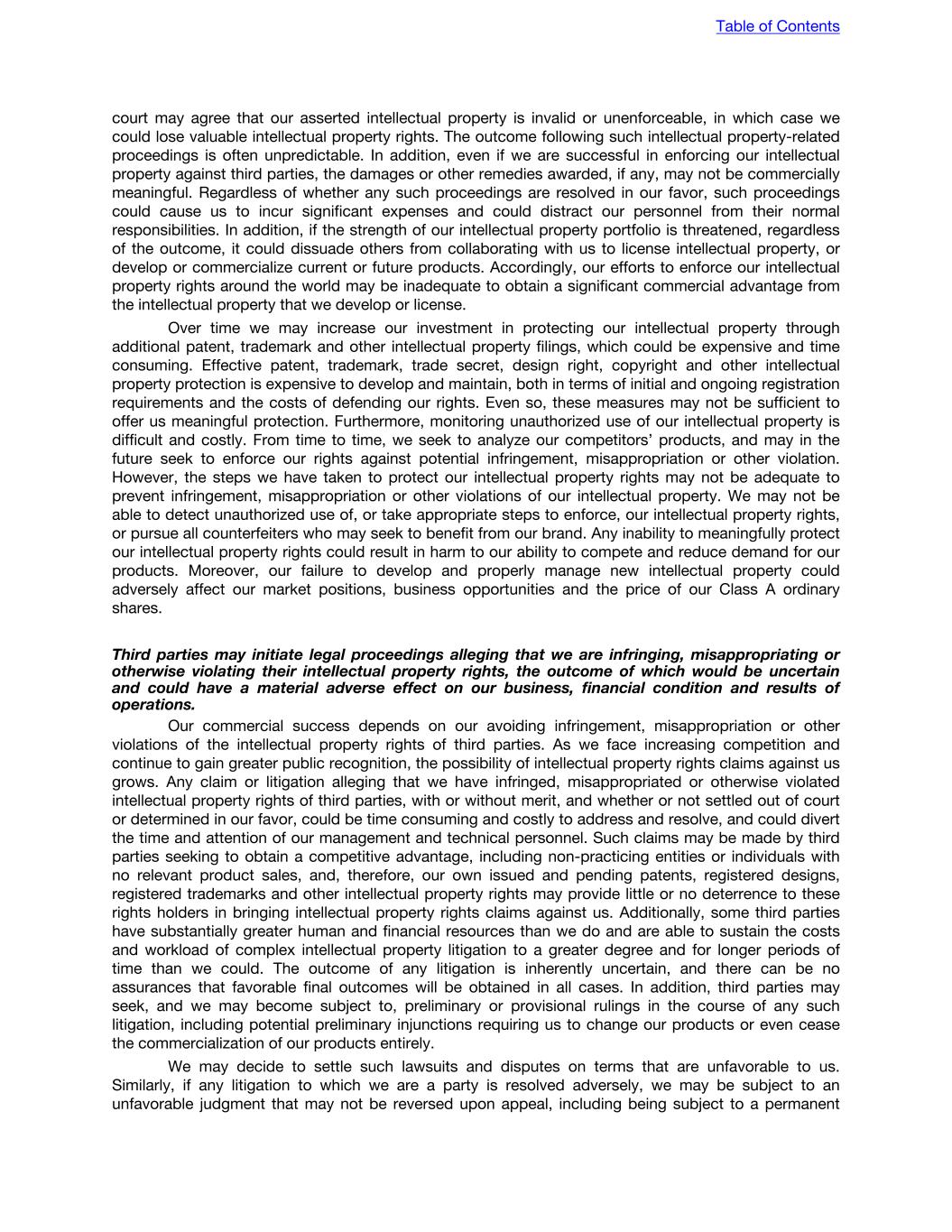 court may agree that our asserted intellectual property is invalid or unenforceable, in which case we could lose valuable intellectual property rights. The outcome following such intellectual property-related proceedings is often unpredictable. In addition, even if we are successful in enforcing our intellectual property against third parties, the damages or other remedies awarded, if any, may not be commercially meaningful. Regardless of whether any such proceedings are resolved in our favor, such proceedings could cause us to incur significant expenses and could distract our personnel from their normal responsibilities. In addition, if the strength of our intellectual property portfolio is threatened, regardless of the outcome, it could dissuade others from collaborating with us to license intellectual property, or develop or commercialize current or future products. Accordingly, our efforts to enforce our intellectual property rights around the world may be inadequate to obtain a significant commercial advantage from the intellectual property that we develop or license. Over time we may increase our investment in protecting our intellectual property through additional patent, trademark and other intellectual property filings, which could be expensive and time consuming. Effective patent, trademark, trade secret, design right, copyright and other intellectual property protection is expensive to develop and maintain, both in terms of initial and ongoing registration requirements and the costs of defending our rights. Even so, these measures may not be sufficient to offer us meaningful protection. Furthermore, monitoring unauthorized use of our intellectual property is difficult and costly. From time to time, we seek to analyze our competitors’ products, and may in the future seek to enforce our rights against potential infringement, misappropriation or other violation. However, the steps we have taken to protect our intellectual property rights may not be adequate to prevent infringement, misappropriation or other violations of our intellectual property. We may not be able to detect unauthorized use of, or take appropriate steps to enforce, our intellectual property rights, or pursue all counterfeiters who may seek to benefit from our brand. Any inability to meaningfully protect our intellectual property rights could result in harm to our ability to compete and reduce demand for our products. Moreover, our failure to develop and properly manage new intellectual property could adversely affect our market positions, business opportunities and the price of our Class A ordinary shares. Third parties may initiate legal proceedings alleging that we are infringing, misappropriating or otherwise violating their intellectual property rights, the outcome of which would be uncertain and could have a material adverse effect on our business, financial condition and results of operations. Our commercial success depends on our avoiding infringement, misappropriation or other violations of the intellectual property rights of third parties. As we face increasing competition and continue to gain greater public recognition, the possibility of intellectual property rights claims against us grows. Any claim or litigation alleging that we have infringed, misappropriated or otherwise violated intellectual property rights of third parties, with or without merit, and whether or not settled out of court or determined in our favor, could be time consuming and costly to address and resolve, and could divert the time and attention of our management and technical personnel. Such claims may be made by third parties seeking to obtain a competitive advantage, including non-practicing entities or individuals with no relevant product sales, and, therefore, our own issued and pending patents, registered designs, registered trademarks and other intellectual property rights may provide little or no deterrence to these rights holders in bringing intellectual property rights claims against us. Additionally, some third parties have substantially greater human and financial resources than we do and are able to sustain the costs and workload of complex intellectual property litigation to a greater degree and for longer periods of time than we could. The outcome of any litigation is inherently uncertain, and there can be no assurances that favorable final outcomes will be obtained in all cases. In addition, third parties may seek, and we may become subject to, preliminary or provisional rulings in the course of any such litigation, including potential preliminary injunctions requiring us to change our products or even cease the commercialization of our products entirely. We may decide to settle such lawsuits and disputes on terms that are unfavorable to us. Similarly, if any litigation to which we are a party is resolved adversely, we may be subject to an unfavorable judgment that may not be reversed upon appeal, including being subject to a permanent Table of Contents
