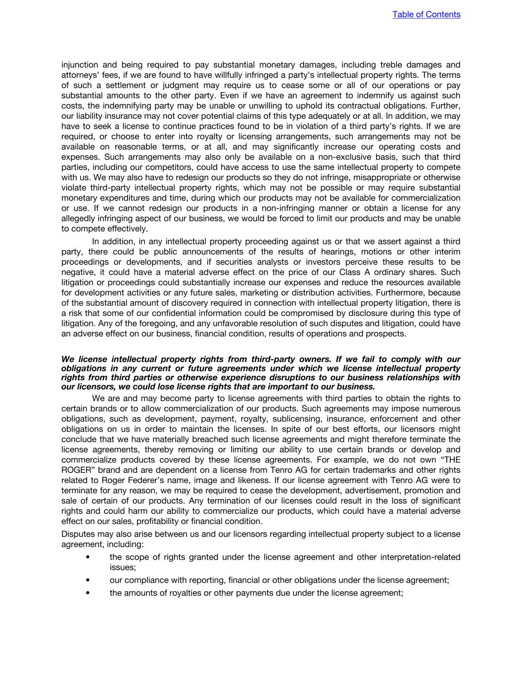 injunction and being required to pay substantial monetary damages, including treble damages and attorneys’ fees, if we are found to have willfully infringed a party’s intellectual property rights. The terms of such a settlement or judgment may require us to cease some or all of our operations or pay substantial amounts to the other party. Even if we have an agreement to indemnify us against such costs, the indemnifying party may be unable or unwilling to uphold its contractual obligations. Further, our liability insurance may not cover potential claims of this type adequately or at all. In addition, we may have to seek a license to continue practices found to be in violation of a third party’s rights. If we are required, or choose to enter into royalty or licensing arrangements, such arrangements may not be available on reasonable terms, or at all, and may significantly increase our operating costs and expenses. Such arrangements may also only be available on a non-exclusive basis, such that third parties, including our competitors, could have access to use the same intellectual property to compete with us. We may also have to redesign our products so they do not infringe, misappropriate or otherwise violate third-party intellectual property rights, which may not be possible or may require substantial monetary expenditures and time, during which our products may not be available for commercialization or use. If we cannot redesign our products in a non-infringing manner or obtain a license for any allegedly infringing aspect of our business, we would be forced to limit our products and may be unable to compete effectively. In addition, in any intellectual property proceeding against us or that we assert against a third party, there could be public announcements of the results of hearings, motions or other interim proceedings or developments, and if securities analysts or investors perceive these results to be negative, it could have a material adverse effect on the price of our Class A ordinary shares. Such litigation or proceedings could substantially increase our expenses and reduce the resources available for development activities or any future sales, marketing or distribution activities. Furthermore, because of the substantial amount of discovery required in connection with intellectual property litigation, there is a risk that some of our confidential information could be compromised by disclosure during this type of litigation. Any of the foregoing, and any unfavorable resolution of such disputes and litigation, could have an adverse effect on our business, financial condition, results of operations and prospects. We license intellectual property rights from third-party owners. If we fail to comply with our obligations in any current or future agreements under which we license intellectual property rights from third parties or otherwise experience disruptions to our business relationships with our licensors, we could lose license rights that are important to our business. We are and may become party to license agreements with third parties to obtain the rights to certain brands or to allow commercialization of our products. Such agreements may impose numerous obligations, such as development, payment, royalty, sublicensing, insurance, enforcement and other obligations on us in order to maintain the licenses. In spite of our best efforts, our licensors might conclude that we have materially breached such license agreements and might therefore terminate the license agreements, thereby removing or limiting our ability to use certain brands or develop and commercialize products covered by these license agreements. For example, we do not own “THE ROGER” brand and are dependent on a license from Tenro AG for certain trademarks and other rights related to Roger Federer’s name, image and likeness. If our license agreement with Tenro AG were to terminate for any reason, we may be required to cease the development, advertisement, promotion and sale of certain of our products. Any termination of our licenses could result in the loss of significant rights and could harm our ability to commercialize our products, which could have a material adverse effect on our sales, profitability or financial condition. Disputes may also arise between us and our licensors regarding intellectual property subject to a license agreement, including: • the scope of rights granted under the license agreement and other interpretation-related issues; • our compliance with reporting, financial or other obligations under the license agreement; • the amounts of royalties or other payments due under the license agreement; Table of Contents