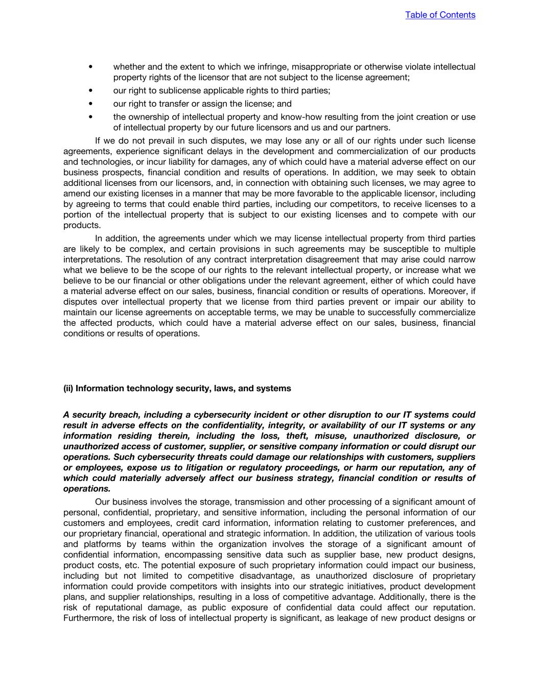 • whether and the extent to which we infringe, misappropriate or otherwise violate intellectual property rights of the licensor that are not subject to the license agreement; • our right to sublicense applicable rights to third parties; • our right to transfer or assign the license; and • the ownership of intellectual property and know-how resulting from the joint creation or use of intellectual property by our future licensors and us and our partners. If we do not prevail in such disputes, we may lose any or all of our rights under such license agreements, experience significant delays in the development and commercialization of our products and technologies, or incur liability for damages, any of which could have a material adverse effect on our business prospects, financial condition and results of operations. In addition, we may seek to obtain additional licenses from our licensors, and, in connection with obtaining such licenses, we may agree to amend our existing licenses in a manner that may be more favorable to the applicable licensor, including by agreeing to terms that could enable third parties, including our competitors, to receive licenses to a portion of the intellectual property that is subject to our existing licenses and to compete with our products. In addition, the agreements under which we may license intellectual property from third parties are likely to be complex, and certain provisions in such agreements may be susceptible to multiple interpretations. The resolution of any contract interpretation disagreement that may arise could narrow what we believe to be the scope of our rights to the relevant intellectual property, or increase what we believe to be our financial or other obligations under the relevant agreement, either of which could have a material adverse effect on our sales, business, financial condition or results of operations. Moreover, if disputes over intellectual property that we license from third parties prevent or impair our ability to maintain our license agreements on acceptable terms, we may be unable to successfully commercialize the affected products, which could have a material adverse effect on our sales, business, financial conditions or results of operations. (ii) Information technology security, laws, and systems A security breach, including a cybersecurity incident or other disruption to our IT systems could result in adverse effects on the confidentiality, integrity, or availability of our IT systems or any information residing therein, including the loss, theft, misuse, unauthorized disclosure, or unauthorized access of customer, supplier, or sensitive company information or could disrupt our operations. Such cybersecurity threats could damage our relationships with customers, suppliers or employees, expose us to litigation or regulatory proceedings, or harm our reputation, any of which could materially adversely affect our business strategy, financial condition or results of operations. Our business involves the storage, transmission and other processing of a significant amount of personal, confidential, proprietary, and sensitive information, including the personal information of our customers and employees, credit card information, information relating to customer preferences, and our proprietary financial, operational and strategic information. In addition, the utilization of various tools and platforms by teams within the organization involves the storage of a significant amount of confidential information, encompassing sensitive data such as supplier base, new product designs, product costs, etc. The potential exposure of such proprietary information could impact our business, including but not limited to competitive disadvantage, as unauthorized disclosure of proprietary information could provide competitors with insights into our strategic initiatives, product development plans, and supplier relationships, resulting in a loss of competitive advantage. Additionally, there is the risk of reputational damage, as public exposure of confidential data could affect our reputation. Furthermore, the risk of loss of intellectual property is significant, as leakage of new product designs or Table of Contents