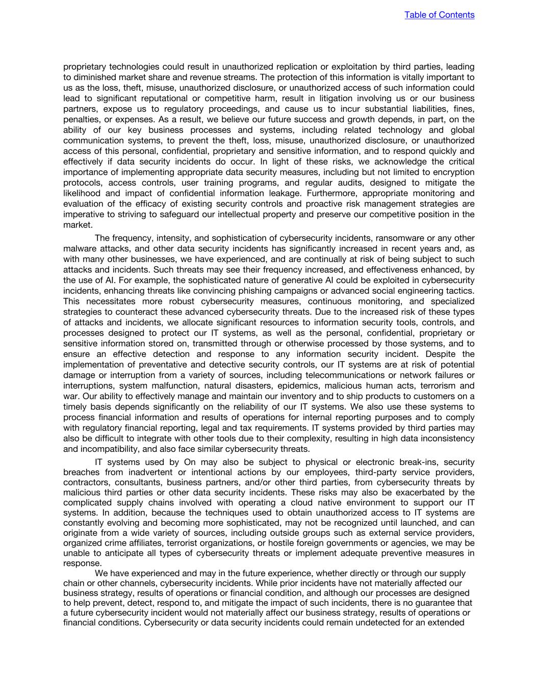 proprietary technologies could result in unauthorized replication or exploitation by third parties, leading to diminished market share and revenue streams. The protection of this information is vitally important to us as the loss, theft, misuse, unauthorized disclosure, or unauthorized access of such information could lead to significant reputational or competitive harm, result in litigation involving us or our business partners, expose us to regulatory proceedings, and cause us to incur substantial liabilities, fines, penalties, or expenses. As a result, we believe our future success and growth depends, in part, on the ability of our key business processes and systems, including related technology and global communication systems, to prevent the theft, loss, misuse, unauthorized disclosure, or unauthorized access of this personal, confidential, proprietary and sensitive information, and to respond quickly and effectively if data security incidents do occur. In light of these risks, we acknowledge the critical importance of implementing appropriate data security measures, including but not limited to encryption protocols, access controls, user training programs, and regular audits, designed to mitigate the likelihood and impact of confidential information leakage. Furthermore, appropriate monitoring and evaluation of the efficacy of existing security controls and proactive risk management strategies are imperative to striving to safeguard our intellectual property and preserve our competitive position in the market. The frequency, intensity, and sophistication of cybersecurity incidents, ransomware or any other malware attacks, and other data security incidents has significantly increased in recent years and, as with many other businesses, we have experienced, and are continually at risk of being subject to such attacks and incidents. Such threats may see their frequency increased, and effectiveness enhanced, by the use of AI. For example, the sophisticated nature of generative AI could be exploited in cybersecurity incidents, enhancing threats like convincing phishing campaigns or advanced social engineering tactics. This necessitates more robust cybersecurity measures, continuous monitoring, and specialized strategies to counteract these advanced cybersecurity threats. Due to the increased risk of these types of attacks and incidents, we allocate significant resources to information security tools, controls, and processes designed to protect our IT systems, as well as the personal, confidential, proprietary or sensitive information stored on, transmitted through or otherwise processed by those systems, and to ensure an effective detection and response to any information security incident. Despite the implementation of preventative and detective security controls, our IT systems are at risk of potential damage or interruption from a variety of sources, including telecommunications or network failures or interruptions, system malfunction, natural disasters, epidemics, malicious human acts, terrorism and war. Our ability to effectively manage and maintain our inventory and to ship products to customers on a timely basis depends significantly on the reliability of our IT systems. We also use these systems to process financial information and results of operations for internal reporting purposes and to comply with regulatory financial reporting, legal and tax requirements. IT systems provided by third parties may also be difficult to integrate with other tools due to their complexity, resulting in high data inconsistency and incompatibility, and also face similar cybersecurity threats. IT systems used by On may also be subject to physical or electronic break-ins, security breaches from inadvertent or intentional actions by our employees, third-party service providers, contractors, consultants, business partners, and/or other third parties, from cybersecurity threats by malicious third parties or other data security incidents. These risks may also be exacerbated by the complicated supply chains involved with operating a cloud native environment to support our IT systems. In addition, because the techniques used to obtain unauthorized access to IT systems are constantly evolving and becoming more sophisticated, may not be recognized until launched, and can originate from a wide variety of sources, including outside groups such as external service providers, organized crime affiliates, terrorist organizations, or hostile foreign governments or agencies, we may be unable to anticipate all types of cybersecurity threats or implement adequate preventive measures in response. We have experienced and may in the future experience, whether directly or through our supply chain or other channels, cybersecurity incidents. While prior incidents have not materially affected our business strategy, results of operations or financial condition, and although our processes are designed to help prevent, detect, respond to, and mitigate the impact of such incidents, there is no guarantee that a future cybersecurity incident would not materially affect our business strategy, results of operations or financial conditions. Cybersecurity or data security incidents could remain undetected for an extended Table of Contents