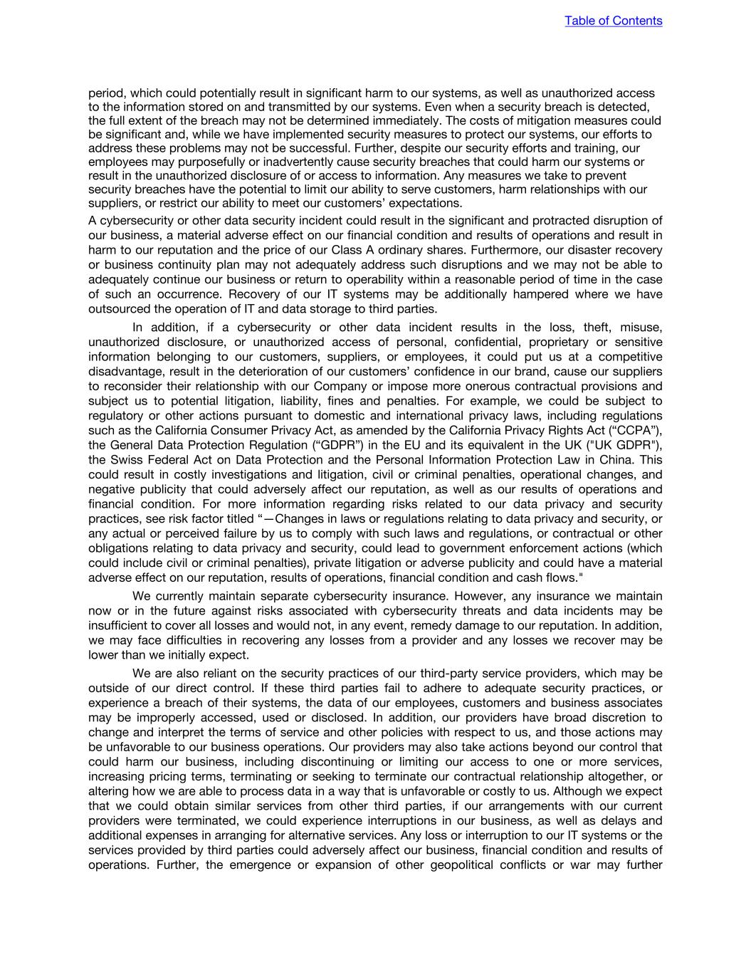period, which could potentially result in significant harm to our systems, as well as unauthorized access to the information stored on and transmitted by our systems. Even when a security breach is detected, the full extent of the breach may not be determined immediately. The costs of mitigation measures could be significant and, while we have implemented security measures to protect our systems, our efforts to address these problems may not be successful. Further, despite our security efforts and training, our employees may purposefully or inadvertently cause security breaches that could harm our systems or result in the unauthorized disclosure of or access to information. Any measures we take to prevent security breaches have the potential to limit our ability to serve customers, harm relationships with our suppliers, or restrict our ability to meet our customers’ expectations. A cybersecurity or other data security incident could result in the significant and protracted disruption of our business, a material adverse effect on our financial condition and results of operations and result in harm to our reputation and the price of our Class A ordinary shares. Furthermore, our disaster recovery or business continuity plan may not adequately address such disruptions and we may not be able to adequately continue our business or return to operability within a reasonable period of time in the case of such an occurrence. Recovery of our IT systems may be additionally hampered where we have outsourced the operation of IT and data storage to third parties. In addition, if a cybersecurity or other data incident results in the loss, theft, misuse, unauthorized disclosure, or unauthorized access of personal, confidential, proprietary or sensitive information belonging to our customers, suppliers, or employees, it could put us at a competitive disadvantage, result in the deterioration of our customers’ confidence in our brand, cause our suppliers to reconsider their relationship with our Company or impose more onerous contractual provisions and subject us to potential litigation, liability, fines and penalties. For example, we could be subject to regulatory or other actions pursuant to domestic and international privacy laws, including regulations such as the California Consumer Privacy Act, as amended by the California Privacy Rights Act (“CCPA”), the General Data Protection Regulation (“GDPR”) in the EU and its equivalent in the UK ("UK GDPR"), the Swiss Federal Act on Data Protection and the Personal Information Protection Law in China. This could result in costly investigations and litigation, civil or criminal penalties, operational changes, and negative publicity that could adversely affect our reputation, as well as our results of operations and financial condition. For more information regarding risks related to our data privacy and security practices, see risk factor titled “—Changes in laws or regulations relating to data privacy and security, or any actual or perceived failure by us to comply with such laws and regulations, or contractual or other obligations relating to data privacy and security, could lead to government enforcement actions (which could include civil or criminal penalties), private litigation or adverse publicity and could have a material adverse effect on our reputation, results of operations, financial condition and cash flows." We currently maintain separate cybersecurity insurance. However, any insurance we maintain now or in the future against risks associated with cybersecurity threats and data incidents may be insufficient to cover all losses and would not, in any event, remedy damage to our reputation. In addition, we may face difficulties in recovering any losses from a provider and any losses we recover may be lower than we initially expect. We are also reliant on the security practices of our third-party service providers, which may be outside of our direct control. If these third parties fail to adhere to adequate security practices, or experience a breach of their systems, the data of our employees, customers and business associates may be improperly accessed, used or disclosed. In addition, our providers have broad discretion to change and interpret the terms of service and other policies with respect to us, and those actions may be unfavorable to our business operations. Our providers may also take actions beyond our control that could harm our business, including discontinuing or limiting our access to one or more services, increasing pricing terms, terminating or seeking to terminate our contractual relationship altogether, or altering how we are able to process data in a way that is unfavorable or costly to us. Although we expect that we could obtain similar services from other third parties, if our arrangements with our current providers were terminated, we could experience interruptions in our business, as well as delays and additional expenses in arranging for alternative services. Any loss or interruption to our IT systems or the services provided by third parties could adversely affect our business, financial condition and results of operations. Further, the emergence or expansion of other geopolitical conflicts or war may further Table of Contents