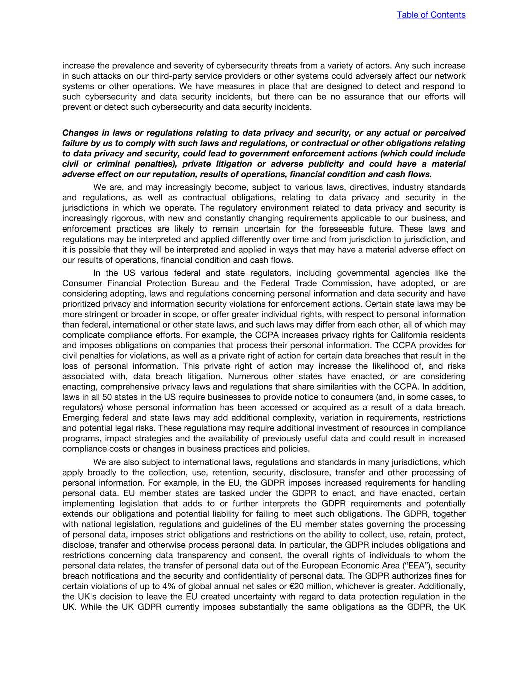 increase the prevalence and severity of cybersecurity threats from a variety of actors. Any such increase in such attacks on our third-party service providers or other systems could adversely affect our network systems or other operations. We have measures in place that are designed to detect and respond to such cybersecurity and data security incidents, but there can be no assurance that our efforts will prevent or detect such cybersecurity and data security incidents. Changes in laws or regulations relating to data privacy and security, or any actual or perceived failure by us to comply with such laws and regulations, or contractual or other obligations relating to data privacy and security, could lead to government enforcement actions (which could include civil or criminal penalties), private litigation or adverse publicity and could have a material adverse effect on our reputation, results of operations, financial condition and cash flows. We are, and may increasingly become, subject to various laws, directives, industry standards and regulations, as well as contractual obligations, relating to data privacy and security in the jurisdictions in which we operate. The regulatory environment related to data privacy and security is increasingly rigorous, with new and constantly changing requirements applicable to our business, and enforcement practices are likely to remain uncertain for the foreseeable future. These laws and regulations may be interpreted and applied differently over time and from jurisdiction to jurisdiction, and it is possible that they will be interpreted and applied in ways that may have a material adverse effect on our results of operations, financial condition and cash flows. In the US various federal and state regulators, including governmental agencies like the Consumer Financial Protection Bureau and the Federal Trade Commission, have adopted, or are considering adopting, laws and regulations concerning personal information and data security and have prioritized privacy and information security violations for enforcement actions. Certain state laws may be more stringent or broader in scope, or offer greater individual rights, with respect to personal information than federal, international or other state laws, and such laws may differ from each other, all of which may complicate compliance efforts. For example, the CCPA increases privacy rights for California residents and imposes obligations on companies that process their personal information. The CCPA provides for civil penalties for violations, as well as a private right of action for certain data breaches that result in the loss of personal information. This private right of action may increase the likelihood of, and risks associated with, data breach litigation. Numerous other states have enacted, or are considering enacting, comprehensive privacy laws and regulations that share similarities with the CCPA. In addition, laws in all 50 states in the US require businesses to provide notice to consumers (and, in some cases, to regulators) whose personal information has been accessed or acquired as a result of a data breach. Emerging federal and state laws may add additional complexity, variation in requirements, restrictions and potential legal risks. These regulations may require additional investment of resources in compliance programs, impact strategies and the availability of previously useful data and could result in increased compliance costs or changes in business practices and policies. We are also subject to international laws, regulations and standards in many jurisdictions, which apply broadly to the collection, use, retention, security, disclosure, transfer and other processing of personal information. For example, in the EU, the GDPR imposes increased requirements for handling personal data. EU member states are tasked under the GDPR to enact, and have enacted, certain implementing legislation that adds to or further interprets the GDPR requirements and potentially extends our obligations and potential liability for failing to meet such obligations. The GDPR, together with national legislation, regulations and guidelines of the EU member states governing the processing of personal data, imposes strict obligations and restrictions on the ability to collect, use, retain, protect, disclose, transfer and otherwise process personal data. In particular, the GDPR includes obligations and restrictions concerning data transparency and consent, the overall rights of individuals to whom the personal data relates, the transfer of personal data out of the European Economic Area (“EEA”), security breach notifications and the security and confidentiality of personal data. The GDPR authorizes fines for certain violations of up to 4% of global annual net sales or €20 million, whichever is greater. Additionally, the UK's decision to leave the EU created uncertainty with regard to data protection regulation in the UK. While the UK GDPR currently imposes substantially the same obligations as the GDPR, the UK Table of Contents