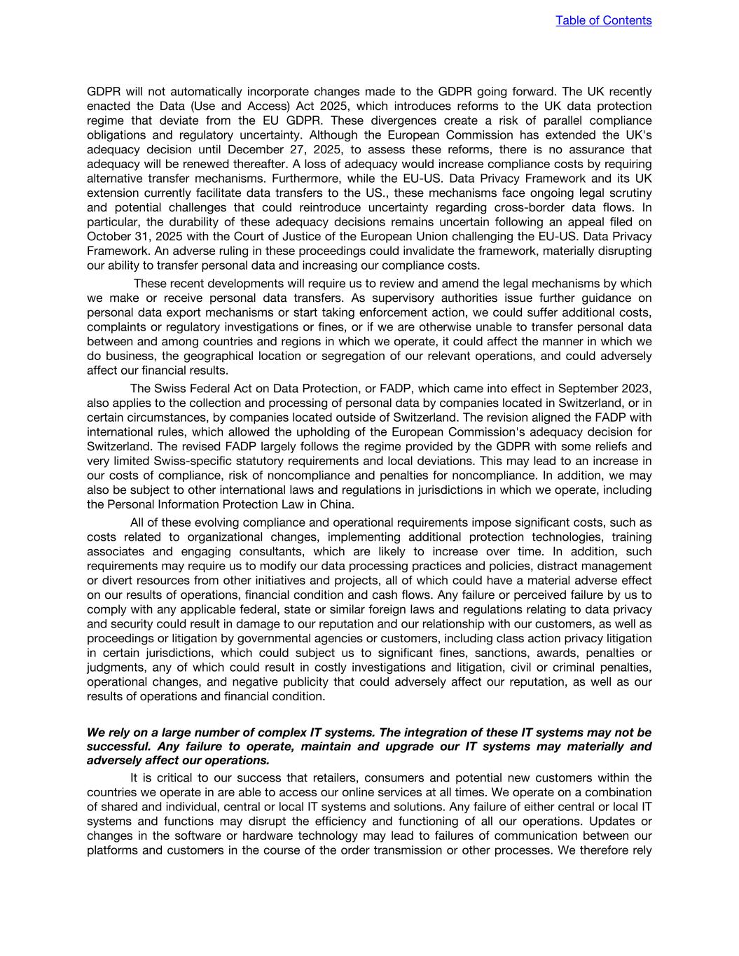 GDPR will not automatically incorporate changes made to the GDPR going forward. The UK recently enacted the Data (Use and Access) Act 2025, which introduces reforms to the UK data protection regime that deviate from the EU GDPR. These divergences create a risk of parallel compliance obligations and regulatory uncertainty. Although the European Commission has extended the UK's adequacy decision until December 27, 2025, to assess these reforms, there is no assurance that adequacy will be renewed thereafter. A loss of adequacy would increase compliance costs by requiring alternative transfer mechanisms. Furthermore, while the EU-US. Data Privacy Framework and its UK extension currently facilitate data transfers to the US., these mechanisms face ongoing legal scrutiny and potential challenges that could reintroduce uncertainty regarding cross-border data flows. In particular, the durability of these adequacy decisions remains uncertain following an appeal filed on October 31, 2025 with the Court of Justice of the European Union challenging the EU-US. Data Privacy Framework. An adverse ruling in these proceedings could invalidate the framework, materially disrupting our ability to transfer personal data and increasing our compliance costs. These recent developments will require us to review and amend the legal mechanisms by which we make or receive personal data transfers. As supervisory authorities issue further guidance on personal data export mechanisms or start taking enforcement action, we could suffer additional costs, complaints or regulatory investigations or fines, or if we are otherwise unable to transfer personal data between and among countries and regions in which we operate, it could affect the manner in which we do business, the geographical location or segregation of our relevant operations, and could adversely affect our financial results. The Swiss Federal Act on Data Protection, or FADP, which came into effect in September 2023, also applies to the collection and processing of personal data by companies located in Switzerland, or in certain circumstances, by companies located outside of Switzerland. The revision aligned the FADP with international rules, which allowed the upholding of the European Commission's adequacy decision for Switzerland. The revised FADP largely follows the regime provided by the GDPR with some reliefs and very limited Swiss-specific statutory requirements and local deviations. This may lead to an increase in our costs of compliance, risk of noncompliance and penalties for noncompliance. In addition, we may also be subject to other international laws and regulations in jurisdictions in which we operate, including the Personal Information Protection Law in China. All of these evolving compliance and operational requirements impose significant costs, such as costs related to organizational changes, implementing additional protection technologies, training associates and engaging consultants, which are likely to increase over time. In addition, such requirements may require us to modify our data processing practices and policies, distract management or divert resources from other initiatives and projects, all of which could have a material adverse effect on our results of operations, financial condition and cash flows. Any failure or perceived failure by us to comply with any applicable federal, state or similar foreign laws and regulations relating to data privacy and security could result in damage to our reputation and our relationship with our customers, as well as proceedings or litigation by governmental agencies or customers, including class action privacy litigation in certain jurisdictions, which could subject us to significant fines, sanctions, awards, penalties or judgments, any of which could result in costly investigations and litigation, civil or criminal penalties, operational changes, and negative publicity that could adversely affect our reputation, as well as our results of operations and financial condition. We rely on a large number of complex IT systems. The integration of these IT systems may not be successful. Any failure to operate, maintain and upgrade our IT systems may materially and adversely affect our operations. It is critical to our success that retailers, consumers and potential new customers within the countries we operate in are able to access our online services at all times. We operate on a combination of shared and individual, central or local IT systems and solutions. Any failure of either central or local IT systems and functions may disrupt the efficiency and functioning of all our operations. Updates or changes in the software or hardware technology may lead to failures of communication between our platforms and customers in the course of the order transmission or other processes. We therefore rely Table of Contents