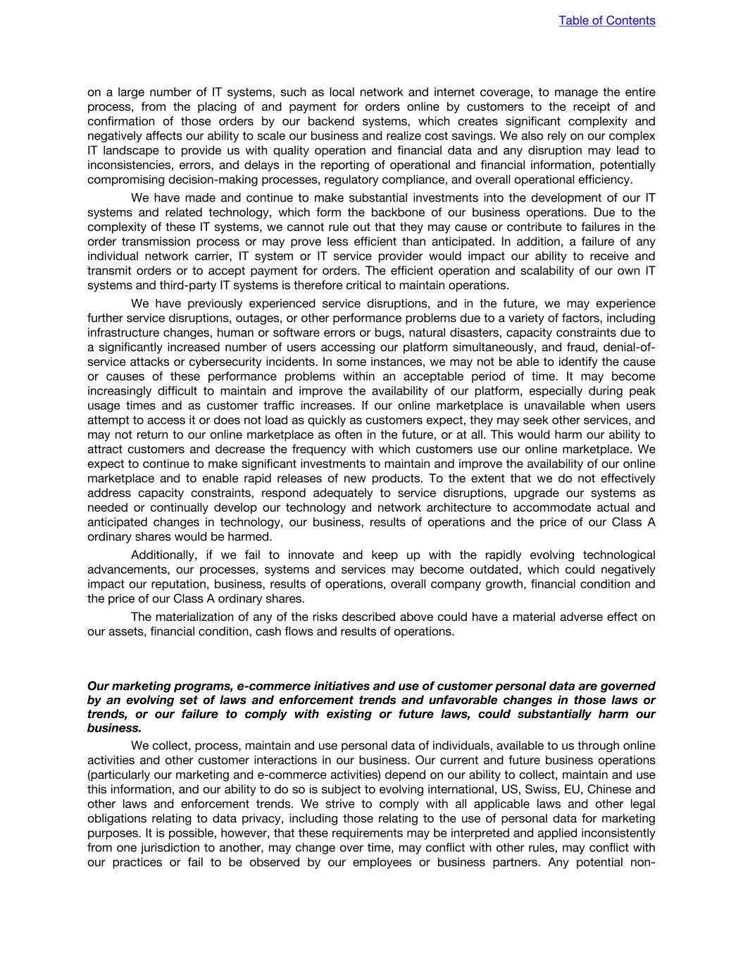 on a large number of IT systems, such as local network and internet coverage, to manage the entire process, from the placing of and payment for orders online by customers to the receipt of and confirmation of those orders by our backend systems, which creates significant complexity and negatively affects our ability to scale our business and realize cost savings. We also rely on our complex IT landscape to provide us with quality operation and financial data and any disruption may lead to inconsistencies, errors, and delays in the reporting of operational and financial information, potentially compromising decision-making processes, regulatory compliance, and overall operational efficiency. We have made and continue to make substantial investments into the development of our IT systems and related technology, which form the backbone of our business operations. Due to the complexity of these IT systems, we cannot rule out that they may cause or contribute to failures in the order transmission process or may prove less efficient than anticipated. In addition, a failure of any individual network carrier, IT system or IT service provider would impact our ability to receive and transmit orders or to accept payment for orders. The efficient operation and scalability of our own IT systems and third-party IT systems is therefore critical to maintain operations. We have previously experienced service disruptions, and in the future, we may experience further service disruptions, outages, or other performance problems due to a variety of factors, including infrastructure changes, human or software errors or bugs, natural disasters, capacity constraints due to a significantly increased number of users accessing our platform simultaneously, and fraud, denial-of- service attacks or cybersecurity incidents. In some instances, we may not be able to identify the cause or causes of these performance problems within an acceptable period of time. It may become increasingly difficult to maintain and improve the availability of our platform, especially during peak usage times and as customer traffic increases. If our online marketplace is unavailable when users attempt to access it or does not load as quickly as customers expect, they may seek other services, and may not return to our online marketplace as often in the future, or at all. This would harm our ability to attract customers and decrease the frequency with which customers use our online marketplace. We expect to continue to make significant investments to maintain and improve the availability of our online marketplace and to enable rapid releases of new products. To the extent that we do not effectively address capacity constraints, respond adequately to service disruptions, upgrade our systems as needed or continually develop our technology and network architecture to accommodate actual and anticipated changes in technology, our business, results of operations and the price of our Class A ordinary shares would be harmed. Additionally, if we fail to innovate and keep up with the rapidly evolving technological advancements, our processes, systems and services may become outdated, which could negatively impact our reputation, business, results of operations, overall company growth, financial condition and the price of our Class A ordinary shares. The materialization of any of the risks described above could have a material adverse effect on our assets, financial condition, cash flows and results of operations. Our marketing programs, e-commerce initiatives and use of customer personal data are governed by an evolving set of laws and enforcement trends and unfavorable changes in those laws or trends, or our failure to comply with existing or future laws, could substantially harm our business. We collect, process, maintain and use personal data of individuals, available to us through online activities and other customer interactions in our business. Our current and future business operations (particularly our marketing and e-commerce activities) depend on our ability to collect, maintain and use this information, and our ability to do so is subject to evolving international, US, Swiss, EU, Chinese and other laws and enforcement trends. We strive to comply with all applicable laws and other legal obligations relating to data privacy, including those relating to the use of personal data for marketing purposes. It is possible, however, that these requirements may be interpreted and applied inconsistently from one jurisdiction to another, may change over time, may conflict with other rules, may conflict with our practices or fail to be observed by our employees or business partners. Any potential non- Table of Contents