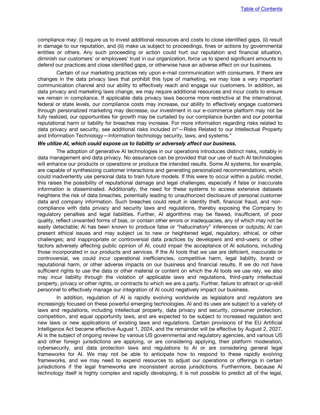 compliance may: (i) require us to invest additional resources and costs to close identified gaps, (ii) result in damage to our reputation, and (iii) make us subject to proceedings, fines or actions by governmental entities or others. Any such proceeding or action could hurt our reputation and financial situation, diminish our customers' or employees' trust in our organization, force us to spend significant amounts to defend our practices and close identified gaps, or otherwise have an adverse effect on our business. Certain of our marketing practices rely upon e-mail communication with consumers. If there are changes in the data privacy laws that prohibit this type of marketing, we may lose a very important communication channel and our ability to effectively reach and engage our customers. In addition, as data privacy and marketing laws change, we may require additional resources and incur costs to ensure we remain in compliance. If applicable data privacy laws become more restrictive at the international, federal or state levels, our compliance costs may increase, our ability to effectively engage customers through personalized marketing may decrease, our investment in our e-commerce platform may not be fully realized, our opportunities for growth may be curtailed by our compliance burden and our potential reputational harm or liability for breaches may increase. For more information regarding risks related to data privacy and security, see additional risks included in“—Risks Related to our Intellectual Property and Information Technology—Information technology security, laws, and systems." We utilize AI, which could expose us to liability or adversely affect our business. The adoption of generative AI technologies in our operations introduces distinct risks, notably in data management and data privacy. No assurance can be provided that our use of such AI technologies will enhance our products or operations or produce the intended results. Some AI systems, for example, are capable of synthesizing customer interactions and generating personalized recommendations, which could inadvertently use personal data to train future models. If this were to occur within a public model, this raises the possibility of reputational damage and legal challenges, especially if false or inaccurate information is disseminated. Additionally, the need for these systems to access extensive datasets heightens the risk of data breaches, potentially leading to unauthorized disclosure of personal customer data and company information. Such breaches could result in identity theft, financial fraud, and non- compliance with data privacy and security laws and regulations, thereby exposing the Company to regulatory penalties and legal liabilities. Further, AI algorithms may be flawed, insufficient, of poor quality, reflect unwanted forms of bias, or contain other errors or inadequacies, any of which may not be easily detectable; AI has been known to produce false or “hallucinatory” inferences or outputs; AI can present ethical issues and may subject us to new or heightened legal, regulatory, ethical, or other challenges; and inappropriate or controversial data practices by developers and end-users; or other factors adversely affecting public opinion of AI, could impair the acceptance of AI solutions, including those incorporated in our products and services. If the AI tools that we use are deficient, inaccurate or controversial, we could incur operational inefficiencies, competitive harm, legal liability, brand or reputational harm, or other adverse impacts on our business and financial results. If we do not have sufficient rights to use the data or other material or content on which the AI tools we use rely, we also may incur liability through the violation of applicable laws and regulations, third-party intellectual property, privacy or other rights, or contracts to which we are a party. Further, failure to attract or up-skill personnel to effectively manage our integration of AI could negatively impact our business. In addition, regulation of AI is rapidly evolving worldwide as legislators and regulators are increasingly focused on these powerful emerging technologies. AI and its uses are subject to a variety of laws and regulations, including intellectual property, data privacy and security, consumer protection, competition, and equal opportunity laws, and are expected to be subject to increased regulation and new laws or new applications of existing laws and regulations. Certain provisions of the EU Artificial Intelligence Act became effective August 1, 2024, and the remainder will be effective by August 2, 2027. AI is the subject of ongoing review by various US governmental and regulatory agencies, and various US and other foreign jurisdictions are applying, or are considering applying, their platform moderation, cybersecurity, and data protection laws and regulations to AI or are considering general legal frameworks for AI. We may not be able to anticipate how to respond to these rapidly evolving frameworks, and we may need to expend resources to adjust our operations or offerings in certain jurisdictions if the legal frameworks are inconsistent across jurisdictions. Furthermore, because AI technology itself is highly complex and rapidly developing, it is not possible to predict all of the legal, Table of Contents