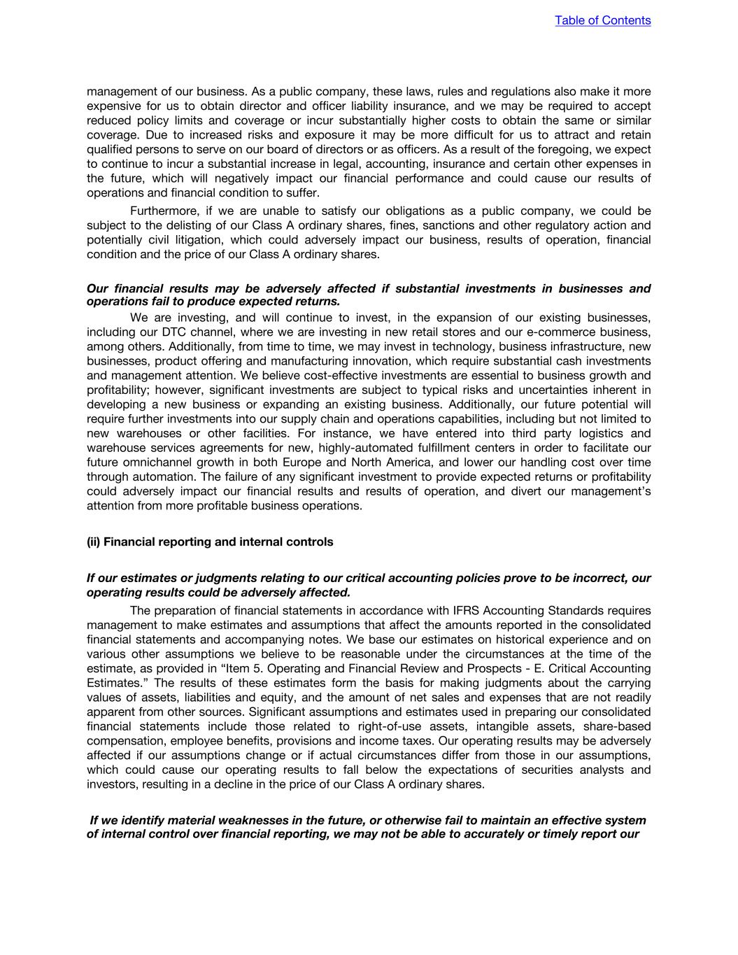 management of our business. As a public company, these laws, rules and regulations also make it more expensive for us to obtain director and officer liability insurance, and we may be required to accept reduced policy limits and coverage or incur substantially higher costs to obtain the same or similar coverage. Due to increased risks and exposure it may be more difficult for us to attract and retain qualified persons to serve on our board of directors or as officers. As a result of the foregoing, we expect to continue to incur a substantial increase in legal, accounting, insurance and certain other expenses in the future, which will negatively impact our financial performance and could cause our results of operations and financial condition to suffer. Furthermore, if we are unable to satisfy our obligations as a public company, we could be subject to the delisting of our Class A ordinary shares, fines, sanctions and other regulatory action and potentially civil litigation, which could adversely impact our business, results of operation, financial condition and the price of our Class A ordinary shares. Our financial results may be adversely affected if substantial investments in businesses and operations fail to produce expected returns. We are investing, and will continue to invest, in the expansion of our existing businesses, including our DTC channel, where we are investing in new retail stores and our e-commerce business, among others. Additionally, from time to time, we may invest in technology, business infrastructure, new businesses, product offering and manufacturing innovation, which require substantial cash investments and management attention. We believe cost-effective investments are essential to business growth and profitability; however, significant investments are subject to typical risks and uncertainties inherent in developing a new business or expanding an existing business. Additionally, our future potential will require further investments into our supply chain and operations capabilities, including but not limited to new warehouses or other facilities. For instance, we have entered into third party logistics and warehouse services agreements for new, highly-automated fulfillment centers in order to facilitate our future omnichannel growth in both Europe and North America, and lower our handling cost over time through automation. The failure of any significant investment to provide expected returns or profitability could adversely impact our financial results and results of operation, and divert our management’s attention from more profitable business operations. (ii) Financial reporting and internal controls If our estimates or judgments relating to our critical accounting policies prove to be incorrect, our operating results could be adversely affected. The preparation of financial statements in accordance with IFRS Accounting Standards requires management to make estimates and assumptions that affect the amounts reported in the consolidated financial statements and accompanying notes. We base our estimates on historical experience and on various other assumptions we believe to be reasonable under the circumstances at the time of the estimate, as provided in “Item 5. Operating and Financial Review and Prospects - E. Critical Accounting Estimates.” The results of these estimates form the basis for making judgments about the carrying values of assets, liabilities and equity, and the amount of net sales and expenses that are not readily apparent from other sources. Significant assumptions and estimates used in preparing our consolidated financial statements include those related to right-of-use assets, intangible assets, share-based compensation, employee benefits, provisions and income taxes. Our operating results may be adversely affected if our assumptions change or if actual circumstances differ from those in our assumptions, which could cause our operating results to fall below the expectations of securities analysts and investors, resulting in a decline in the price of our Class A ordinary shares. If we identify material weaknesses in the future, or otherwise fail to maintain an effective system of internal control over financial reporting, we may not be able to accurately or timely report our Table of Contents