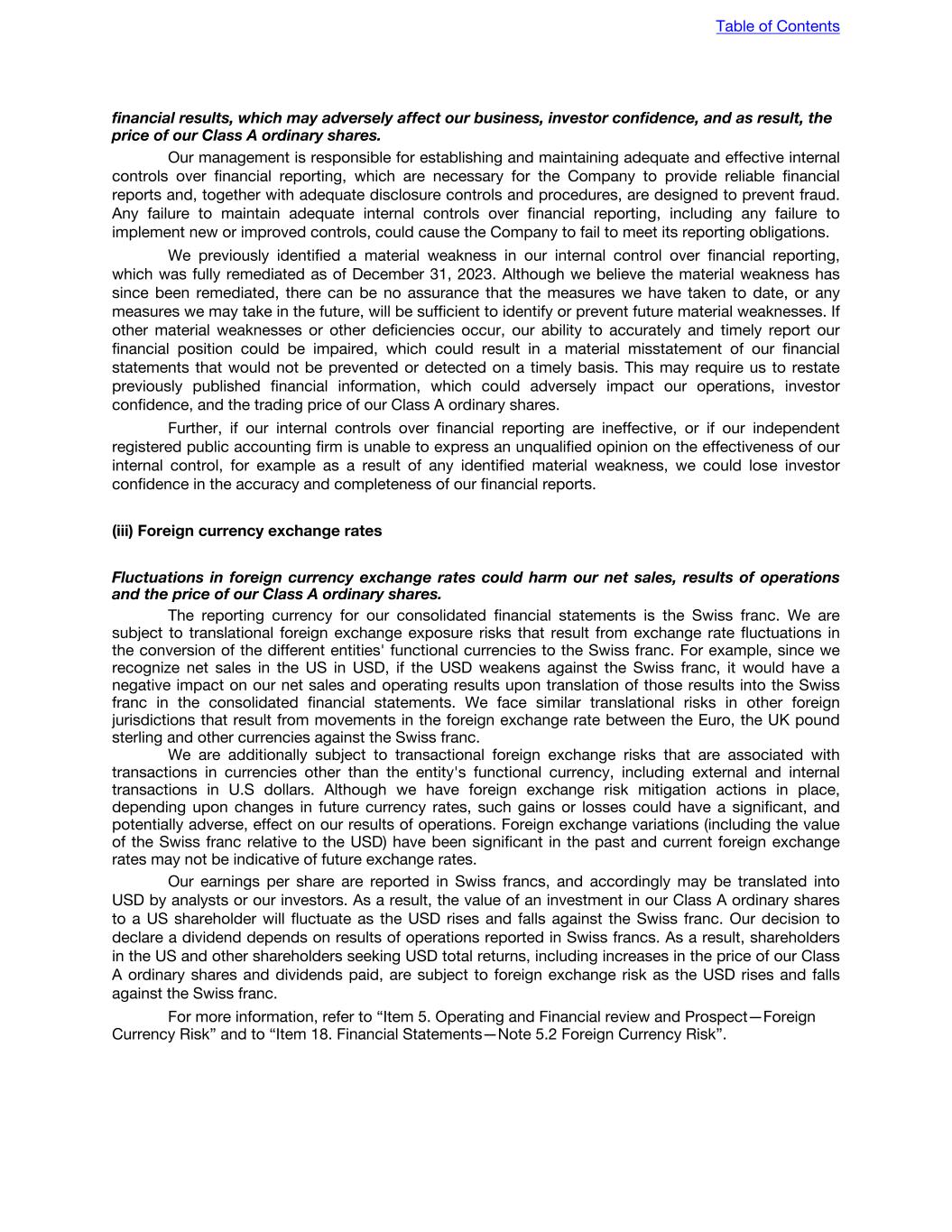 financial results, which may adversely affect our business, investor confidence, and as result, the price of our Class A ordinary shares. Our management is responsible for establishing and maintaining adequate and effective internal controls over financial reporting, which are necessary for the Company to provide reliable financial reports and, together with adequate disclosure controls and procedures, are designed to prevent fraud. Any failure to maintain adequate internal controls over financial reporting, including any failure to implement new or improved controls, could cause the Company to fail to meet its reporting obligations. We previously identified a material weakness in our internal control over financial reporting, which was fully remediated as of December 31, 2023. Although we believe the material weakness has since been remediated, there can be no assurance that the measures we have taken to date, or any measures we may take in the future, will be sufficient to identify or prevent future material weaknesses. If other material weaknesses or other deficiencies occur, our ability to accurately and timely report our financial position could be impaired, which could result in a material misstatement of our financial statements that would not be prevented or detected on a timely basis. This may require us to restate previously published financial information, which could adversely impact our operations, investor confidence, and the trading price of our Class A ordinary shares. Further, if our internal controls over financial reporting are ineffective, or if our independent registered public accounting firm is unable to express an unqualified opinion on the effectiveness of our internal control, for example as a result of any identified material weakness, we could lose investor confidence in the accuracy and completeness of our financial reports. (iii) Foreign currency exchange rates Fluctuations in foreign currency exchange rates could harm our net sales, results of operations and the price of our Class A ordinary shares. The reporting currency for our consolidated financial statements is the Swiss franc. We are subject to translational foreign exchange exposure risks that result from exchange rate fluctuations in the conversion of the different entities' functional currencies to the Swiss franc. For example, since we recognize net sales in the US in USD, if the USD weakens against the Swiss franc, it would have a negative impact on our net sales and operating results upon translation of those results into the Swiss franc in the consolidated financial statements. We face similar translational risks in other foreign jurisdictions that result from movements in the foreign exchange rate between the Euro, the UK pound sterling and other currencies against the Swiss franc. We are additionally subject to transactional foreign exchange risks that are associated with transactions in currencies other than the entity's functional currency, including external and internal transactions in U.S dollars. Although we have foreign exchange risk mitigation actions in place, depending upon changes in future currency rates, such gains or losses could have a significant, and potentially adverse, effect on our results of operations. Foreign exchange variations (including the value of the Swiss franc relative to the USD) have been significant in the past and current foreign exchange rates may not be indicative of future exchange rates. Our earnings per share are reported in Swiss francs, and accordingly may be translated into USD by analysts or our investors. As a result, the value of an investment in our Class A ordinary shares to a US shareholder will fluctuate as the USD rises and falls against the Swiss franc. Our decision to declare a dividend depends on results of operations reported in Swiss francs. As a result, shareholders in the US and other shareholders seeking USD total returns, including increases in the price of our Class A ordinary shares and dividends paid, are subject to foreign exchange risk as the USD rises and falls against the Swiss franc. For more information, refer to “Item 5. Operating and Financial review and Prospect—Foreign Currency Risk” and to “Item 18. Financial Statements—Note 5.2 Foreign Currency Risk”. Table of Contents