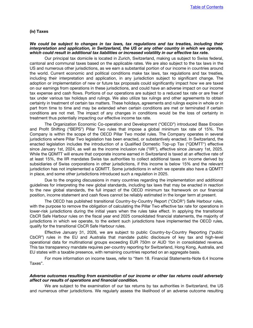 (iv) Taxes We could be subject to changes in tax laws, tax regulations and tax treaties, including their interpretation and application, in Switzerland, the US or any other country in which we operate, which could result in additional tax liabilities or increased volatility in our effective tax rate. Our principal tax domicile is located in Zurich, Switzerland, making us subject to Swiss federal, cantonal and communal taxes based on the applicable rates. We are also subject to the tax laws in the US and numerous other jurisdictions, as we earn a substantial portion of our income in countries around the world. Current economic and political conditions make tax laws, tax regulations and tax treaties, including their interpretation and application, in any jurisdiction subject to significant change. The adoption or implementation of new or future tax proposals could significantly impact how we are taxed on our earnings from operations in these jurisdictions, and could have an adverse impact on our income tax expense and cash flows. Portions of our operations are subject to a reduced tax rate or are free of tax under various tax holidays and rulings. We also utilize tax rulings and other agreements to obtain certainty in treatment of certain tax matters. These holidays, agreements and rulings expire in whole or in part from time to time and may be extended when certain conditions are met or terminated if certain conditions are not met. The impact of any changes in conditions would be the loss of certainty in treatment thus potentially impacting our effective income tax rate. The Organization Economic Co-operation and Development (“OECD”) introduced Base Erosion and Profit Shifting (“BEPS”) Pillar Two rules that impose a global minimum tax rate of 15%. The Company is within the scope of the OECD Pillar Two model rules. The Company operates in several jurisdictions where Pillar Two legislation has been enacted, or substantively enacted. In Switzerland, the enacted legislation includes the introduction of a Qualified Domestic Top-up Tax ("QDMTT") effective since January 1st, 2024, as well as the income inclusion rule ("IIR"), effective since January 1st, 2025. While the QDMTT will ensure that corporate income earned in Switzerland is taxed at an effective rate of at least 15%, the IIR mandates Swiss tax authorities to collect additional taxes on income derived by subsidiaries of Swiss corporations in other jurisdictions, if this income is below 15% and the relevant jurisdiction has not implemented a QDMTT. Some jurisdictions in which we operate also have a QDMTT in place, and some other jurisdictions introduced such a regulation in 2025. Due to the ongoing discussions in many countries regarding the implementation and additional guidelines for interpreting the new global standards, including tax laws that may be enacted in reaction to the new global standards, the full impact of the OECD minimum tax framework on our financial position, income statement and cash flows cannot be reliably estimated in the longer term at present. The OECD has published transitional Country-by-Country Report ("CbCR") Safe Harbour rules, with the purpose to remove the obligation of calculating the Pillar Two effective tax rate for operations in lower-risk jurisdictions during the initial years when the rules take effect. In applying the transitional CbCR Safe Harbour rules on the fiscal year end 2025 consolidated financial statements, the majority of jurisdictions in which we operate, to the extent such jurisdictions have implemented the OECD rules, qualify for the transitional CbCR Safe Harbour rules. Effective January 31, 2026, we are subject to public Country-by-Country Reporting (“public CbCR”) rules in the EU and Australia that mandate public disclosure of key tax and high-level operational data for multinational groups exceeding EUR 750m or AUD 1bn in consolidated revenue. This tax transparency mandate requires per-country reporting for Switzerland, Hong Kong, Australia, and EU states with a taxable presence, with remaining countries reported on an aggregate basis. For more information on income taxes, refer to “Item 18. Financial Statements-Note 6.4 Income Taxes”. Adverse outcomes resulting from examination of our income or other tax returns could adversely affect our results of operations and financial condition. We are subject to the examination of our tax returns by tax authorities in Switzerland, the US and numerous other jurisdictions. We regularly assess the likelihood of an adverse outcome resulting Table of Contents