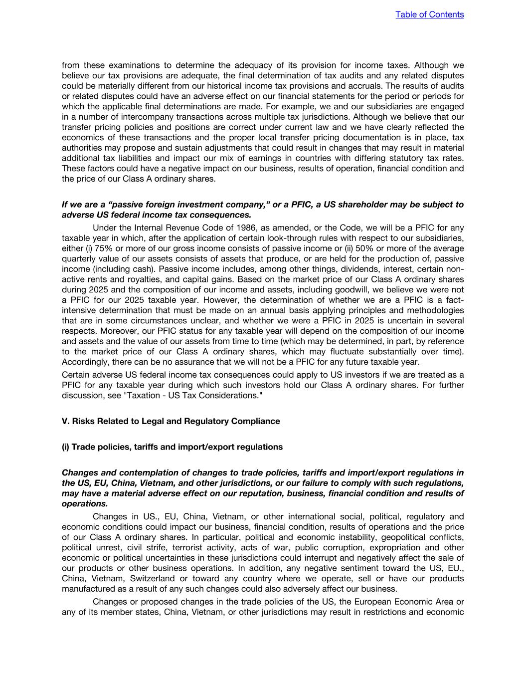 from these examinations to determine the adequacy of its provision for income taxes. Although we believe our tax provisions are adequate, the final determination of tax audits and any related disputes could be materially different from our historical income tax provisions and accruals. The results of audits or related disputes could have an adverse effect on our financial statements for the period or periods for which the applicable final determinations are made. For example, we and our subsidiaries are engaged in a number of intercompany transactions across multiple tax jurisdictions. Although we believe that our transfer pricing policies and positions are correct under current law and we have clearly reflected the economics of these transactions and the proper local transfer pricing documentation is in place, tax authorities may propose and sustain adjustments that could result in changes that may result in material additional tax liabilities and impact our mix of earnings in countries with differing statutory tax rates. These factors could have a negative impact on our business, results of operation, financial condition and the price of our Class A ordinary shares. If we are a “passive foreign investment company,” or a PFIC, a US shareholder may be subject to adverse US federal income tax consequences. Under the Internal Revenue Code of 1986, as amended, or the Code, we will be a PFIC for any taxable year in which, after the application of certain look-through rules with respect to our subsidiaries, either (i) 75% or more of our gross income consists of passive income or (ii) 50% or more of the average quarterly value of our assets consists of assets that produce, or are held for the production of, passive income (including cash). Passive income includes, among other things, dividends, interest, certain non- active rents and royalties, and capital gains. Based on the market price of our Class A ordinary shares during 2025 and the composition of our income and assets, including goodwill, we believe we were not a PFIC for our 2025 taxable year. However, the determination of whether we are a PFIC is a fact- intensive determination that must be made on an annual basis applying principles and methodologies that are in some circumstances unclear, and whether we were a PFIC in 2025 is uncertain in several respects. Moreover, our PFIC status for any taxable year will depend on the composition of our income and assets and the value of our assets from time to time (which may be determined, in part, by reference to the market price of our Class A ordinary shares, which may fluctuate substantially over time). Accordingly, there can be no assurance that we will not be a PFIC for any future taxable year. Certain adverse US federal income tax consequences could apply to US investors if we are treated as a PFIC for any taxable year during which such investors hold our Class A ordinary shares. For further discussion, see "Taxation - US Tax Considerations." V. Risks Related to Legal and Regulatory Compliance (i) Trade policies, tariffs and import/export regulations Changes and contemplation of changes to trade policies, tariffs and import/export regulations in the US, EU, China, Vietnam, and other jurisdictions, or our failure to comply with such regulations, may have a material adverse effect on our reputation, business, financial condition and results of operations. Changes in US., EU, China, Vietnam, or other international social, political, regulatory and economic conditions could impact our business, financial condition, results of operations and the price of our Class A ordinary shares. In particular, political and economic instability, geopolitical conflicts, political unrest, civil strife, terrorist activity, acts of war, public corruption, expropriation and other economic or political uncertainties in these jurisdictions could interrupt and negatively affect the sale of our products or other business operations. In addition, any negative sentiment toward the US, EU., China, Vietnam, Switzerland or toward any country where we operate, sell or have our products manufactured as a result of any such changes could also adversely affect our business. Changes or proposed changes in the trade policies of the US, the European Economic Area or any of its member states, China, Vietnam, or other jurisdictions may result in restrictions and economic Table of Contents