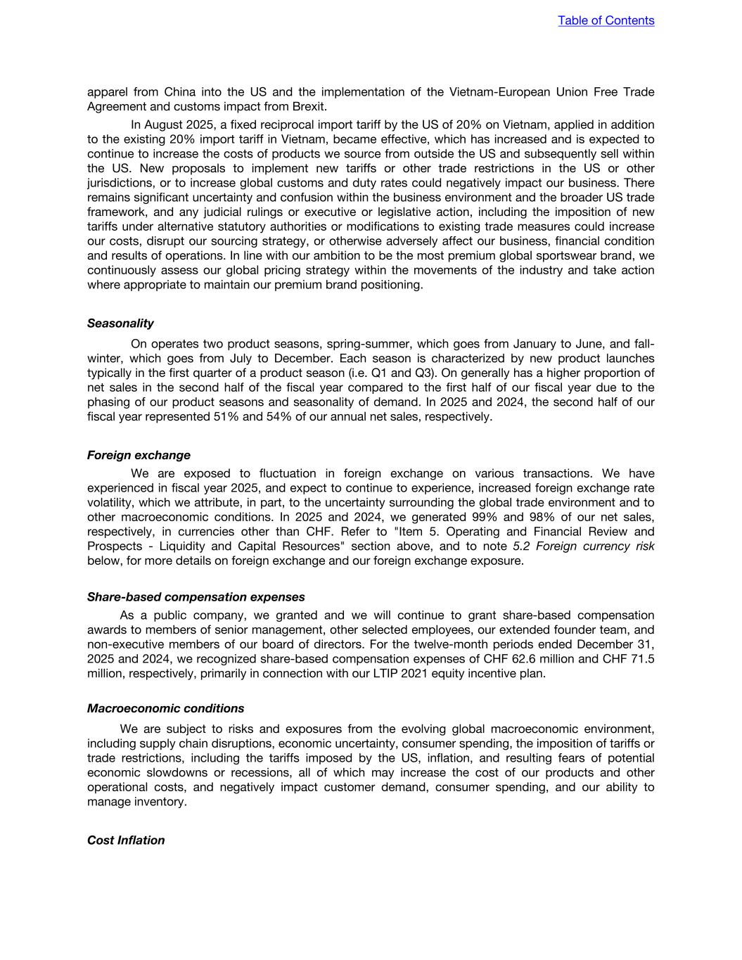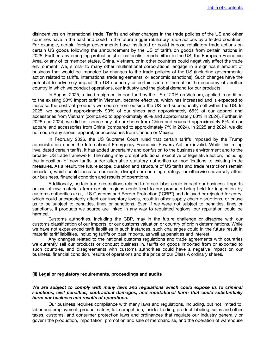 disincentives on international trade. Tariffs and other changes in the trade policies of the US and other countries have in the past and could in the future trigger retaliatory trade actions by affected countries. For example, certain foreign governments have instituted or could impose retaliatory trade actions on certain US goods following the announcement by the US of tariffs on goods from certain nations in 2025. Further, any emerging protectionist or nationalist trends either in the US, the European Economic Area, or any of its member states, China, Vietnam, or in other countries could negatively affect the trade environment. We, similar to many other multinational corporations, engage in a significant amount of business that would be impacted by changes to the trade policies of the US (including governmental action related to tariffs, international trade agreements, or economic sanctions). Such changes have the potential to adversely impact the US economy or certain sectors thereof or the economy of another country in which we conduct operations, our industry and the global demand for our products. In August 2025, a fixed reciprocal import tariff by the US of 20% on Vietnam, applied in addition to the existing 20% import tariff in Vietnam, became effective, which has increased and is expected to increase the costs of products we source from outside the US and subsequently sell within the US. In 2025, we sourced approximately 90% of our shoes and approximately 65% of our apparel and accessories from Vietnam (compared to approximately 90% and approximately 60% in 2024). Further, in 2025 and 2024, we did not source any of our shoes from China and sourced approximately 6% of our apparel and accessories from China (compared to approximately 7% in 2024). In 2025 and 2024, we did not source any shoes, apparel, or accessories from Canada or Mexico. In February 2026, the US Supreme Court ruled that certain tariffs imposed by the Trump administration under the International Emergency Economic Powers Act are invalid. While this ruling invalidated certain tariffs, it has added uncertainty and confusion to the business environment and to the broader US trade framework. The ruling may prompt additional executive or legislative action, including the imposition of new tariffs under alternative statutory authorities or modifications to existing trade measures. As a result, the future scope, duration and structure of US tariffs and trade restrictions remain uncertain, which could increase our costs, disrupt our sourcing strategy, or otherwise adversely affect our business, financial condition and results of operations. Additionally, certain trade restrictions related to forced labor could impact our business. Imports or use of raw materials from certain regions could lead to our products being held for inspection by customs authorities (e.g., U.S Customs and Border Protection ("CBP") and delayed or rejected for entry, which could unexpectedly affect our inventory levels, result in other supply chain disruptions, or cause us to be subject to penalties, fines or sanctions. Even if we were not subject to penalties, fines or sanctions, if products we source are linked in any way to regulated regions, our reputation could be harmed. Customs authorities, including the CBP, may in the future challenge or disagree with our customs classification of our imports, or our customs valuation or country of origin determinations. While we have not experienced tariff liabilities in such instances, such challenges could in the future result in material tariff liabilities, including tariffs on past imports, as well as penalties and interest. Any changes related to the national customs regulations and trade agreements with countries we currently sell our products or conduct business in, tariffs on goods imported from or exported to such countries, and disagreements with customs authorities could have a negative impact on our business, financial condition, results of operations and the price of our Class A ordinary shares. (ii) Legal or regulatory requirements, proceedings and audits We are subject to comply with many laws and regulations which could expose us to criminal sanctions, civil penalties, contractual damages, and reputational harm that could substantially harm our business and results of operations. Our business requires compliance with many laws and regulations, including, but not limited to, labor and employment, product safety, fair competition, insider trading, product labeling, sales and other taxes, customs, and consumer protection laws and ordinances that regulate our industry generally or govern the production, importation, promotion and sale of merchandise, and the operation of warehouse Table of Contents