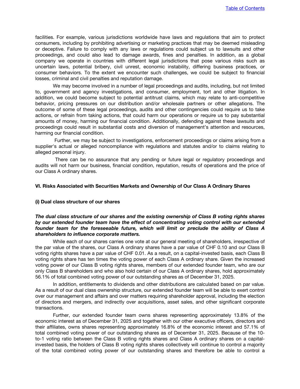 facilities. For example, various jurisdictions worldwide have laws and regulations that aim to protect consumers, including by prohibiting advertising or marketing practices that may be deemed misleading or deceptive. Failure to comply with any laws or regulations could subject us to lawsuits and other proceedings, and could also lead to damage awards, fines and penalties. In addition, as a global company we operate in countries with different legal jurisdictions that pose various risks such as uncertain laws, potential bribery, civil unrest, economic instability, differing business practices, or consumer behaviors. To the extent we encounter such challenges, we could be subject to financial losses, criminal and civil penalties and reputation damage. We may become involved in a number of legal proceedings and audits, including, but not limited to, government and agency investigations, and consumer, employment, tort and other litigation. In addition, we could become subject to potential antitrust claims, which may relate to anti-competitive behavior, pricing pressures on our distribution and/or wholesale partners or other allegations. The outcome of some of these legal proceedings, audits and other contingencies could require us to take actions, or refrain from taking actions, that could harm our operations or require us to pay substantial amounts of money, harming our financial condition. Additionally, defending against these lawsuits and proceedings could result in substantial costs and diversion of management’s attention and resources, harming our financial condition. Further, we may be subject to investigations, enforcement proceedings or claims arising from a supplier's actual or alleged noncompliance with regulations and statutes and/or to claims relating to alleged personal injury. There can be no assurance that any pending or future legal or regulatory proceedings and audits will not harm our business, financial condition, reputation, results of operations and the price of our Class A ordinary shares. VI. Risks Associated with Securities Markets and Ownership of Our Class A Ordinary Shares (i) Dual class structure of our shares The dual class structure of our shares and the existing ownership of Class B voting rights shares by our extended founder team have the effect of concentrating voting control with our extended founder team for the foreseeable future, which will limit or preclude the ability of Class A shareholders to influence corporate matters. While each of our shares carries one vote at our general meeting of shareholders, irrespective of the par value of the shares, our Class A ordinary shares have a par value of CHF 0.10 and our Class B voting rights shares have a par value of CHF 0.01. As a result, on a capital-invested basis, each Class B voting rights share has ten times the voting power of each Class A ordinary share. Given the increased voting power of our Class B voting rights shares, members of our extended founder team, who are our only Class B shareholders and who also hold certain of our Class A ordinary shares, hold approximately 56.1% of total combined voting power of our outstanding shares as of December 31, 2025. In addition, entitlements to dividends and other distributions are calculated based on par value. As a result of our dual class ownership structure, our extended founder team will be able to exert control over our management and affairs and over matters requiring shareholder approval, including the election of directors and mergers, and indirectly over acquisitions, asset sales, and other significant corporate transactions. Further, our extended founder team owns shares representing approximately 13.8% of the economic interest as of December 31, 2025 and together with our other executive officers, directors and their affiliates, owns shares representing approximately 16.8% of the economic interest and 57.1% of total combined voting power of our outstanding shares as of December 31, 2025. Because of the 10- to-1 voting ratio between the Class B voting rights shares and Class A ordinary shares on a capital- invested basis, the holders of Class B voting rights shares collectively will continue to control a majority of the total combined voting power of our outstanding shares and therefore be able to control a Table of Contents