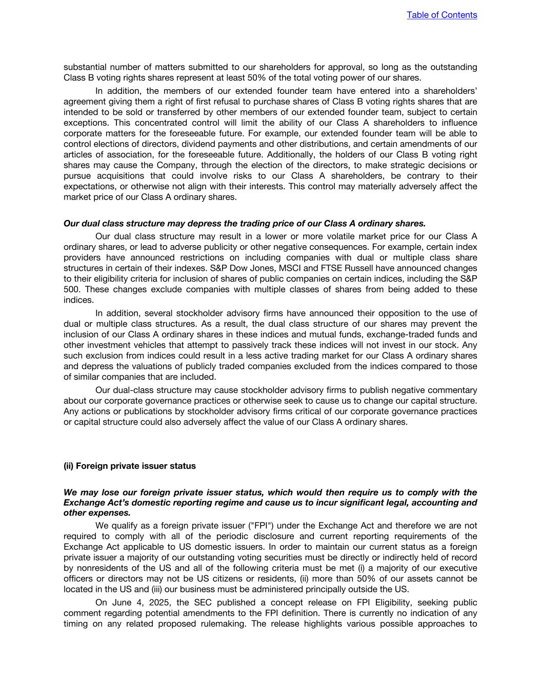 substantial number of matters submitted to our shareholders for approval, so long as the outstanding Class B voting rights shares represent at least 50% of the total voting power of our shares. In addition, the members of our extended founder team have entered into a shareholders’ agreement giving them a right of first refusal to purchase shares of Class B voting rights shares that are intended to be sold or transferred by other members of our extended founder team, subject to certain exceptions. This concentrated control will limit the ability of our Class A shareholders to influence corporate matters for the foreseeable future. For example, our extended founder team will be able to control elections of directors, dividend payments and other distributions, and certain amendments of our articles of association, for the foreseeable future. Additionally, the holders of our Class B voting right shares may cause the Company, through the election of the directors, to make strategic decisions or pursue acquisitions that could involve risks to our Class A shareholders, be contrary to their expectations, or otherwise not align with their interests. This control may materially adversely affect the market price of our Class A ordinary shares. Our dual class structure may depress the trading price of our Class A ordinary shares. Our dual class structure may result in a lower or more volatile market price for our Class A ordinary shares, or lead to adverse publicity or other negative consequences. For example, certain index providers have announced restrictions on including companies with dual or multiple class share structures in certain of their indexes. S&P Dow Jones, MSCI and FTSE Russell have announced changes to their eligibility criteria for inclusion of shares of public companies on certain indices, including the S&P 500. These changes exclude companies with multiple classes of shares from being added to these indices. In addition, several stockholder advisory firms have announced their opposition to the use of dual or multiple class structures. As a result, the dual class structure of our shares may prevent the inclusion of our Class A ordinary shares in these indices and mutual funds, exchange-traded funds and other investment vehicles that attempt to passively track these indices will not invest in our stock. Any such exclusion from indices could result in a less active trading market for our Class A ordinary shares and depress the valuations of publicly traded companies excluded from the indices compared to those of similar companies that are included. Our dual-class structure may cause stockholder advisory firms to publish negative commentary about our corporate governance practices or otherwise seek to cause us to change our capital structure. Any actions or publications by stockholder advisory firms critical of our corporate governance practices or capital structure could also adversely affect the value of our Class A ordinary shares. (ii) Foreign private issuer status We may lose our foreign private issuer status, which would then require us to comply with the Exchange Act’s domestic reporting regime and cause us to incur significant legal, accounting and other expenses. We qualify as a foreign private issuer ("FPI") under the Exchange Act and therefore we are not required to comply with all of the periodic disclosure and current reporting requirements of the Exchange Act applicable to US domestic issuers. In order to maintain our current status as a foreign private issuer a majority of our outstanding voting securities must be directly or indirectly held of record by nonresidents of the US and all of the following criteria must be met (i) a majority of our executive officers or directors may not be US citizens or residents, (ii) more than 50% of our assets cannot be located in the US and (iii) our business must be administered principally outside the US. On June 4, 2025, the SEC published a concept release on FPI Eligibility, seeking public comment regarding potential amendments to the FPI definition. There is currently no indication of any timing on any related proposed rulemaking. The release highlights various possible approaches to Table of Contents