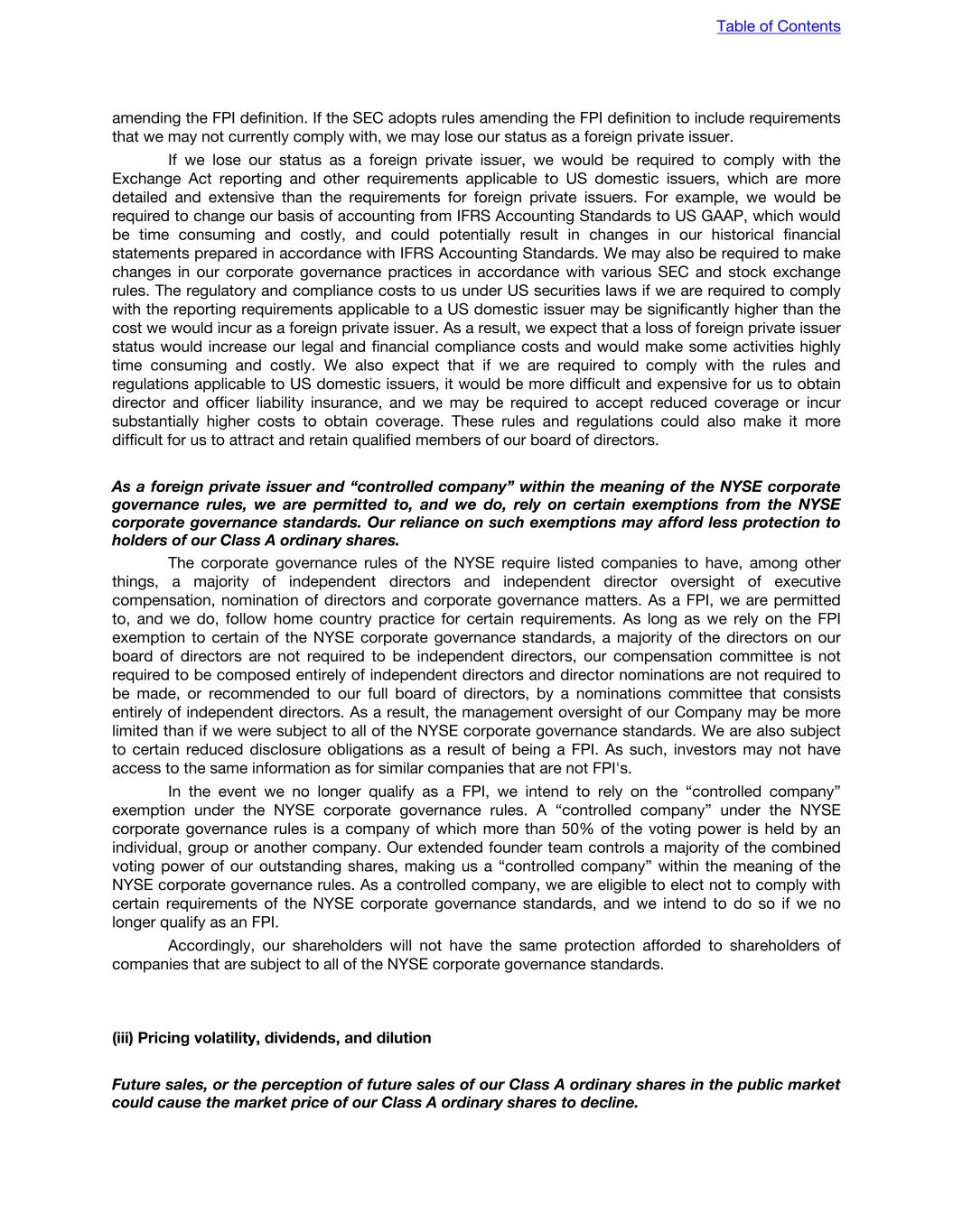 amending the FPI definition. If the SEC adopts rules amending the FPI definition to include requirements that we may not currently comply with, we may lose our status as a foreign private issuer. If we lose our status as a foreign private issuer, we would be required to comply with the Exchange Act reporting and other requirements applicable to US domestic issuers, which are more detailed and extensive than the requirements for foreign private issuers. For example, we would be required to change our basis of accounting from IFRS Accounting Standards to US GAAP, which would be time consuming and costly, and could potentially result in changes in our historical financial statements prepared in accordance with IFRS Accounting Standards. We may also be required to make changes in our corporate governance practices in accordance with various SEC and stock exchange rules. The regulatory and compliance costs to us under US securities laws if we are required to comply with the reporting requirements applicable to a US domestic issuer may be significantly higher than the cost we would incur as a foreign private issuer. As a result, we expect that a loss of foreign private issuer status would increase our legal and financial compliance costs and would make some activities highly time consuming and costly. We also expect that if we are required to comply with the rules and regulations applicable to US domestic issuers, it would be more difficult and expensive for us to obtain director and officer liability insurance, and we may be required to accept reduced coverage or incur substantially higher costs to obtain coverage. These rules and regulations could also make it more difficult for us to attract and retain qualified members of our board of directors. As a foreign private issuer and “controlled company” within the meaning of the NYSE corporate governance rules, we are permitted to, and we do, rely on certain exemptions from the NYSE corporate governance standards. Our reliance on such exemptions may afford less protection to holders of our Class A ordinary shares. The corporate governance rules of the NYSE require listed companies to have, among other things, a majority of independent directors and independent director oversight of executive compensation, nomination of directors and corporate governance matters. As a FPI, we are permitted to, and we do, follow home country practice for certain requirements. As long as we rely on the FPI exemption to certain of the NYSE corporate governance standards, a majority of the directors on our board of directors are not required to be independent directors, our compensation committee is not required to be composed entirely of independent directors and director nominations are not required to be made, or recommended to our full board of directors, by a nominations committee that consists entirely of independent directors. As a result, the management oversight of our Company may be more limited than if we were subject to all of the NYSE corporate governance standards. We are also subject to certain reduced disclosure obligations as a result of being a FPI. As such, investors may not have access to the same information as for similar companies that are not FPI's. In the event we no longer qualify as a FPI, we intend to rely on the “controlled company” exemption under the NYSE corporate governance rules. A “controlled company” under the NYSE corporate governance rules is a company of which more than 50% of the voting power is held by an individual, group or another company. Our extended founder team controls a majority of the combined voting power of our outstanding shares, making us a “controlled company” within the meaning of the NYSE corporate governance rules. As a controlled company, we are eligible to elect not to comply with certain requirements of the NYSE corporate governance standards, and we intend to do so if we no longer qualify as an FPI. Accordingly, our shareholders will not have the same protection afforded to shareholders of companies that are subject to all of the NYSE corporate governance standards. (iii) Pricing volatility, dividends, and dilution Future sales, or the perception of future sales of our Class A ordinary shares in the public market could cause the market price of our Class A ordinary shares to decline. Table of Contents