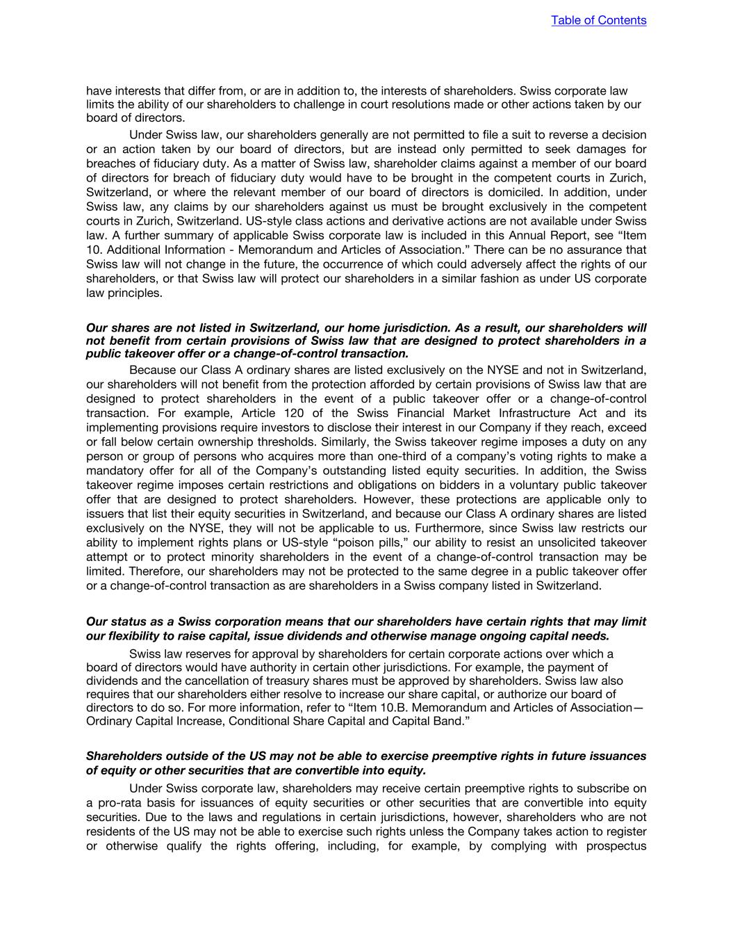 have interests that differ from, or are in addition to, the interests of shareholders. Swiss corporate law limits the ability of our shareholders to challenge in court resolutions made or other actions taken by our board of directors. Under Swiss law, our shareholders generally are not permitted to file a suit to reverse a decision or an action taken by our board of directors, but are instead only permitted to seek damages for breaches of fiduciary duty. As a matter of Swiss law, shareholder claims against a member of our board of directors for breach of fiduciary duty would have to be brought in the competent courts in Zurich, Switzerland, or where the relevant member of our board of directors is domiciled. In addition, under Swiss law, any claims by our shareholders against us must be brought exclusively in the competent courts in Zurich, Switzerland. US-style class actions and derivative actions are not available under Swiss law. A further summary of applicable Swiss corporate law is included in this Annual Report, see “Item 10. Additional Information - Memorandum and Articles of Association.” There can be no assurance that Swiss law will not change in the future, the occurrence of which could adversely affect the rights of our shareholders, or that Swiss law will protect our shareholders in a similar fashion as under US corporate law principles. Our shares are not listed in Switzerland, our home jurisdiction. As a result, our shareholders will not benefit from certain provisions of Swiss law that are designed to protect shareholders in a public takeover offer or a change-of-control transaction. Because our Class A ordinary shares are listed exclusively on the NYSE and not in Switzerland, our shareholders will not benefit from the protection afforded by certain provisions of Swiss law that are designed to protect shareholders in the event of a public takeover offer or a change-of-control transaction. For example, Article 120 of the Swiss Financial Market Infrastructure Act and its implementing provisions require investors to disclose their interest in our Company if they reach, exceed or fall below certain ownership thresholds. Similarly, the Swiss takeover regime imposes a duty on any person or group of persons who acquires more than one-third of a company’s voting rights to make a mandatory offer for all of the Company’s outstanding listed equity securities. In addition, the Swiss takeover regime imposes certain restrictions and obligations on bidders in a voluntary public takeover offer that are designed to protect shareholders. However, these protections are applicable only to issuers that list their equity securities in Switzerland, and because our Class A ordinary shares are listed exclusively on the NYSE, they will not be applicable to us. Furthermore, since Swiss law restricts our ability to implement rights plans or US-style “poison pills,” our ability to resist an unsolicited takeover attempt or to protect minority shareholders in the event of a change-of-control transaction may be limited. Therefore, our shareholders may not be protected to the same degree in a public takeover offer or a change-of-control transaction as are shareholders in a Swiss company listed in Switzerland. Our status as a Swiss corporation means that our shareholders have certain rights that may limit our flexibility to raise capital, issue dividends and otherwise manage ongoing capital needs. Swiss law reserves for approval by shareholders for certain corporate actions over which a board of directors would have authority in certain other jurisdictions. For example, the payment of dividends and the cancellation of treasury shares must be approved by shareholders. Swiss law also requires that our shareholders either resolve to increase our share capital, or authorize our board of directors to do so. For more information, refer to “Item 10.B. Memorandum and Articles of Association— Ordinary Capital Increase, Conditional Share Capital and Capital Band.” Shareholders outside of the US may not be able to exercise preemptive rights in future issuances of equity or other securities that are convertible into equity. Under Swiss corporate law, shareholders may receive certain preemptive rights to subscribe on a pro-rata basis for issuances of equity securities or other securities that are convertible into equity securities. Due to the laws and regulations in certain jurisdictions, however, shareholders who are not residents of the US may not be able to exercise such rights unless the Company takes action to register or otherwise qualify the rights offering, including, for example, by complying with prospectus Table of Contents
