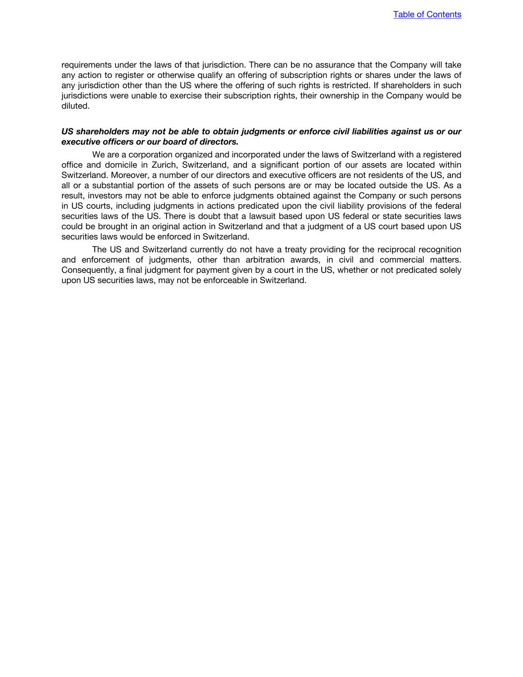 requirements under the laws of that jurisdiction. There can be no assurance that the Company will take any action to register or otherwise qualify an offering of subscription rights or shares under the laws of any jurisdiction other than the US where the offering of such rights is restricted. If shareholders in such jurisdictions were unable to exercise their subscription rights, their ownership in the Company would be diluted. US shareholders may not be able to obtain judgments or enforce civil liabilities against us or our executive officers or our board of directors. We are a corporation organized and incorporated under the laws of Switzerland with a registered office and domicile in Zurich, Switzerland, and a significant portion of our assets are located within Switzerland. Moreover, a number of our directors and executive officers are not residents of the US, and all or a substantial portion of the assets of such persons are or may be located outside the US. As a result, investors may not be able to enforce judgments obtained against the Company or such persons in US courts, including judgments in actions predicated upon the civil liability provisions of the federal securities laws of the US. There is doubt that a lawsuit based upon US federal or state securities laws could be brought in an original action in Switzerland and that a judgment of a US court based upon US securities laws would be enforced in Switzerland. The US and Switzerland currently do not have a treaty providing for the reciprocal recognition and enforcement of judgments, other than arbitration awards, in civil and commercial matters. Consequently, a final judgment for payment given by a court in the US, whether or not predicated solely upon US securities laws, may not be enforceable in Switzerland. Table of Contents