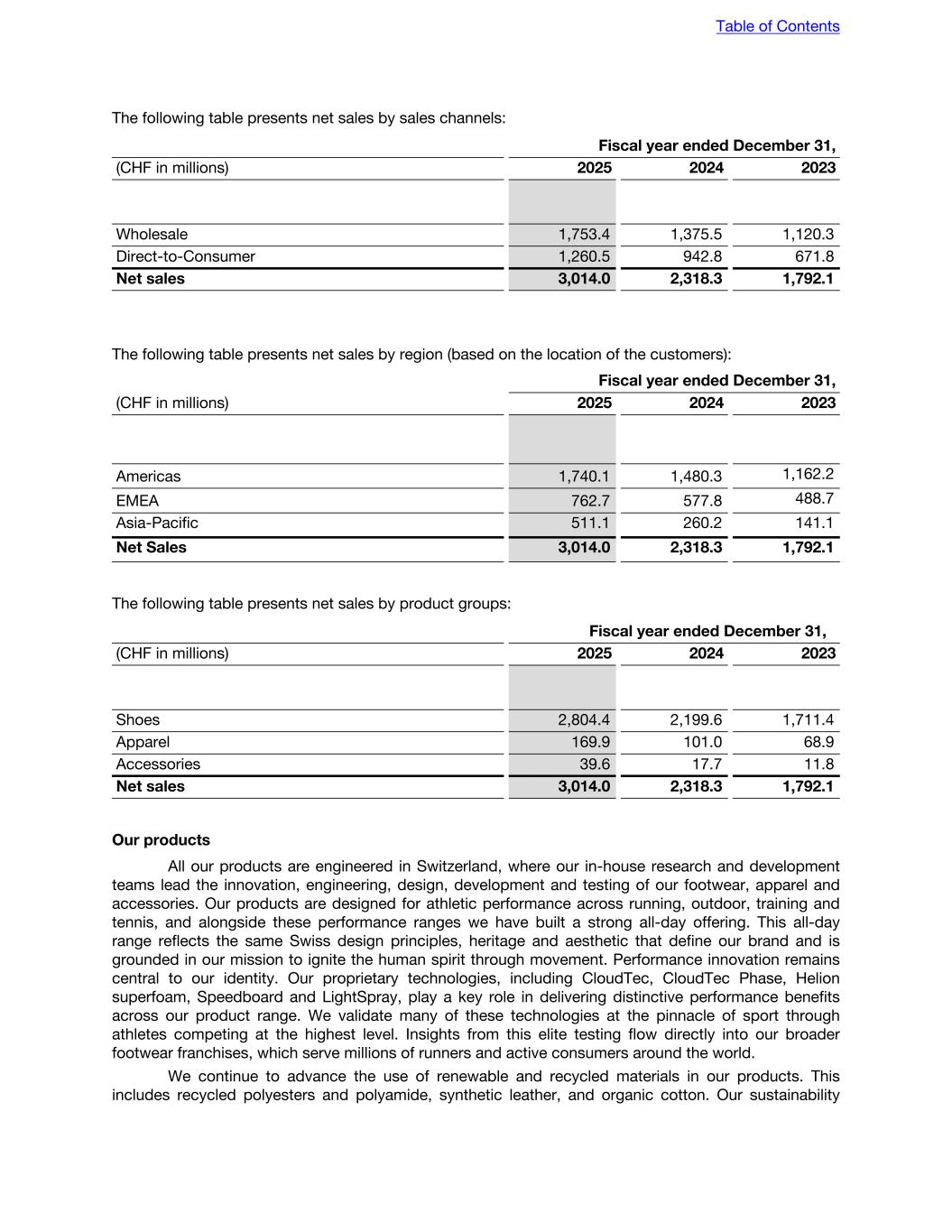 The following table presents net sales by sales channels: Fiscal year ended December 31, (CHF in millions) 2025 2024 2023 Wholesale 1,753.4 1,375.5 1,120.3 Direct-to-Consumer 1,260.5 942.8 671.8 Net sales 3,014.0 2,318.3 1,792.1 The following table presents net sales by region (based on the location of the customers): Fiscal year ended December 31, (CHF in millions) 2025 2024 2023 Americas 1,740.1 1,480.3 1,162.2 EMEA 762.7 577.8 488.7 Asia-Pacific 511.1 260.2 141.1 Net Sales 3,014.0 2,318.3 1,792.1 The following table presents net sales by product groups: Fiscal year ended December 31, (CHF in millions) 2025 2024 2023 Shoes 2,804.4 2,199.6 1,711.4 Apparel 169.9 101.0 68.9 Accessories 39.6 17.7 11.8 Net sales 3,014.0 2,318.3 1,792.1 Our products All our products are engineered in Switzerland, where our in-house research and development teams lead the innovation, engineering, design, development and testing of our footwear, apparel and accessories. Our products are designed for athletic performance across running, outdoor, training and tennis, and alongside these performance ranges we have built a strong all-day offering. This all-day range reflects the same Swiss design principles, heritage and aesthetic that define our brand and is grounded in our mission to ignite the human spirit through movement. Performance innovation remains central to our identity. Our proprietary technologies, including CloudTec, CloudTec Phase, Helion superfoam, Speedboard and LightSpray, play a key role in delivering distinctive performance benefits across our product range. We validate many of these technologies at the pinnacle of sport through athletes competing at the highest level. Insights from this elite testing flow directly into our broader footwear franchises, which serve millions of runners and active consumers around the world. We continue to advance the use of renewable and recycled materials in our products. This includes recycled polyesters and polyamide, synthetic leather, and organic cotton. Our sustainability Table of Contents