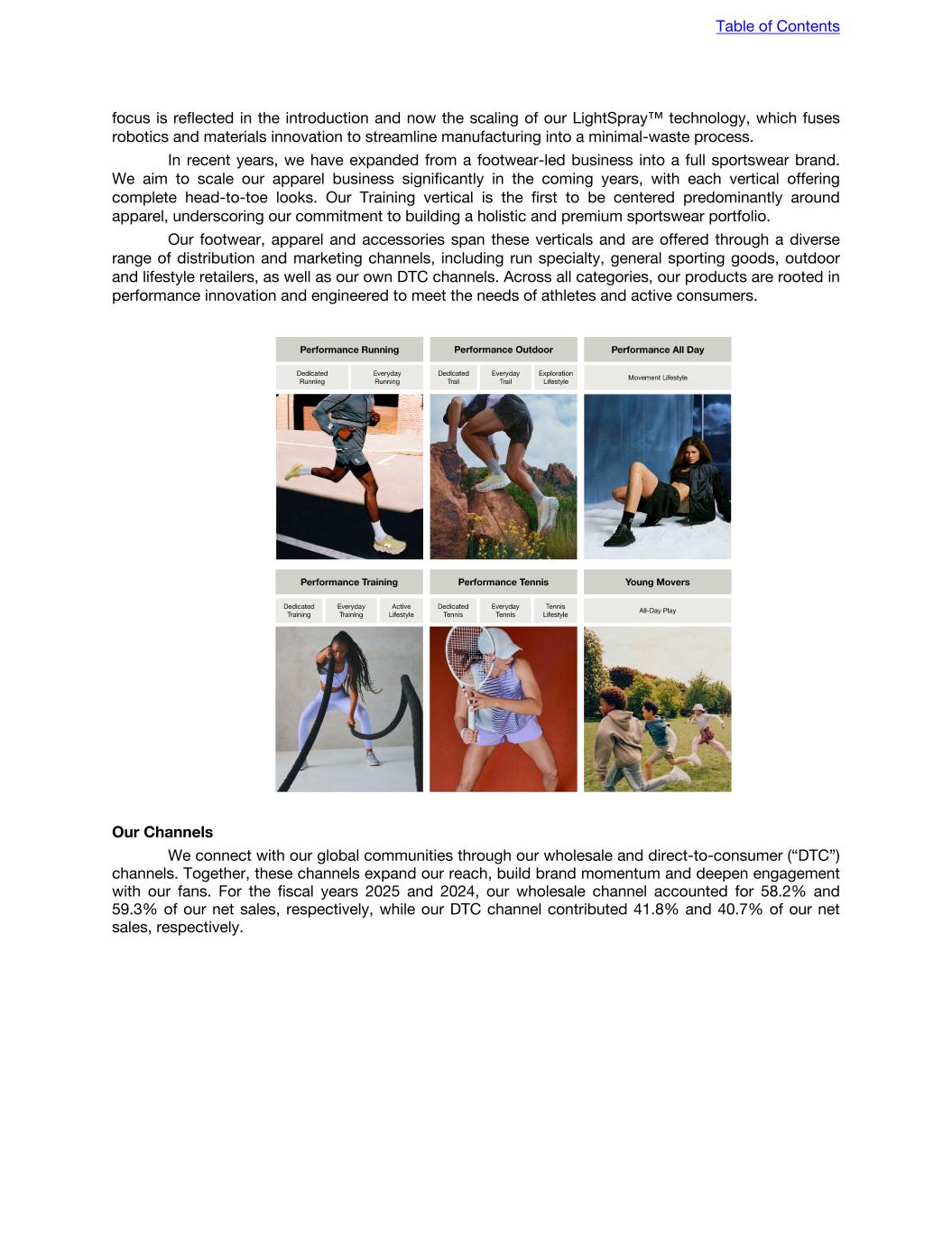 focus is reflected in the introduction and now the scaling of our LightSpray™ technology, which fuses robotics and materials innovation to streamline manufacturing into a minimal-waste process. In recent years, we have expanded from a footwear-led business into a full sportswear brand. We aim to scale our apparel business significantly in the coming years, with each vertical offering complete head-to-toe looks. Our Training vertical is the first to be centered predominantly around apparel, underscoring our commitment to building a holistic and premium sportswear portfolio. Our footwear, apparel and accessories span these verticals and are offered through a diverse range of distribution and marketing channels, including run specialty, general sporting goods, outdoor and lifestyle retailers, as well as our own DTC channels. Across all categories, our products are rooted in performance innovation and engineered to meet the needs of athletes and active consumers. Our Channels We connect with our global communities through our wholesale and direct-to-consumer (“DTC”) channels. Together, these channels expand our reach, build brand momentum and deepen engagement with our fans. For the fiscal years 2025 and 2024, our wholesale channel accounted for 58.2% and 59.3% of our net sales, respectively, while our DTC channel contributed 41.8% and 40.7% of our net sales, respectively. Table of Contents