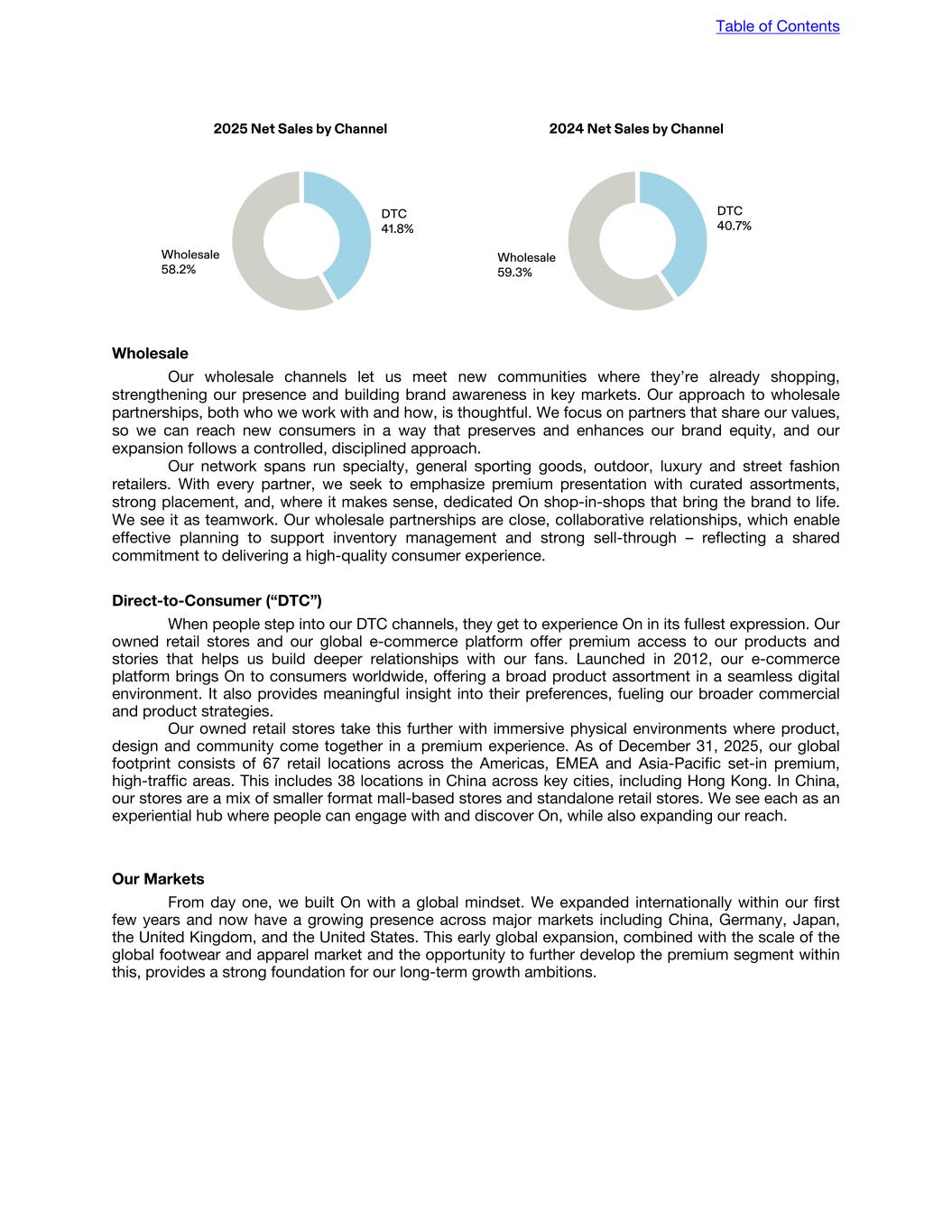 2025 Net Sales by Channel DTC 41.8% Wholesale 58.2% 2024 Net Sales by Channel DTC 40.7% Wholesale 59.3% Wholesale Our wholesale channels let us meet new communities where they’re already shopping, strengthening our presence and building brand awareness in key markets. Our approach to wholesale partnerships, both who we work with and how, is thoughtful. We focus on partners that share our values, so we can reach new consumers in a way that preserves and enhances our brand equity, and our expansion follows a controlled, disciplined approach. Our network spans run specialty, general sporting goods, outdoor, luxury and street fashion retailers. With every partner, we seek to emphasize premium presentation with curated assortments, strong placement, and, where it makes sense, dedicated On shop-in-shops that bring the brand to life. We see it as teamwork. Our wholesale partnerships are close, collaborative relationships, which enable effective planning to support inventory management and strong sell-through – reflecting a shared commitment to delivering a high-quality consumer experience. Direct-to-Consumer (“DTC”) When people step into our DTC channels, they get to experience On in its fullest expression. Our owned retail stores and our global e-commerce platform offer premium access to our products and stories that helps us build deeper relationships with our fans. Launched in 2012, our e-commerce platform brings On to consumers worldwide, offering a broad product assortment in a seamless digital environment. It also provides meaningful insight into their preferences, fueling our broader commercial and product strategies. Our owned retail stores take this further with immersive physical environments where product, design and community come together in a premium experience. As of December 31, 2025, our global footprint consists of 67 retail locations across the Americas, EMEA and Asia-Pacific set-in premium, high-traffic areas. This includes 38 locations in China across key cities, including Hong Kong. In China, our stores are a mix of smaller format mall-based stores and standalone retail stores. We see each as an experiential hub where people can engage with and discover On, while also expanding our reach. Our Markets From day one, we built On with a global mindset. We expanded internationally within our first few years and now have a growing presence across major markets including China, Germany, Japan, the United Kingdom, and the United States. This early global expansion, combined with the scale of the global footwear and apparel market and the opportunity to further develop the premium segment within this, provides a strong foundation for our long-term growth ambitions. Table of Contents
