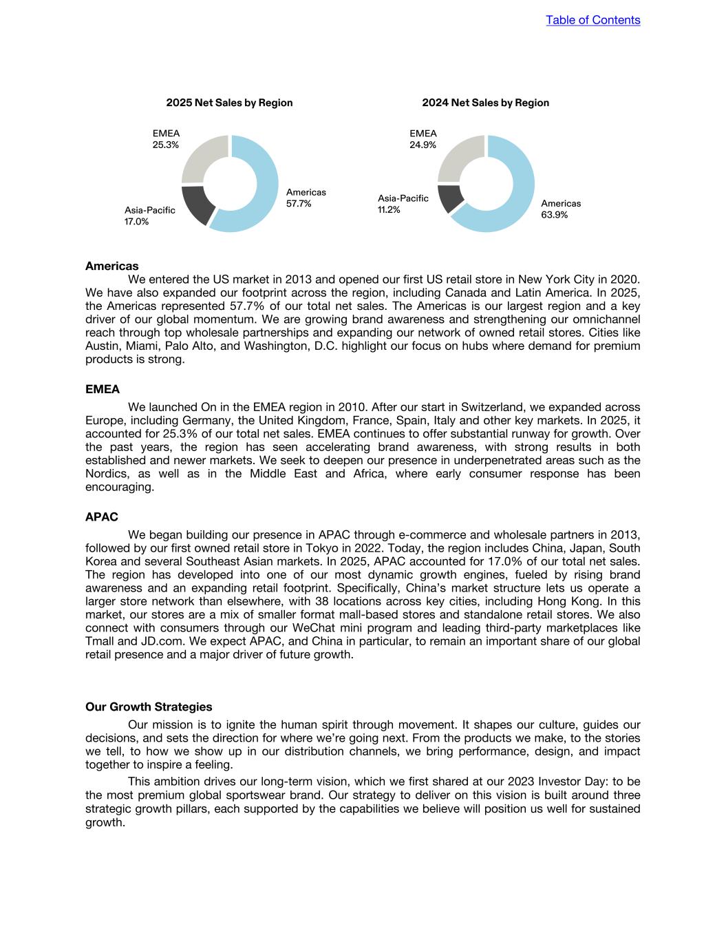 2025 Net Sales by Region Americas 57.7%Asia-Pacific 17.0% EMEA 25.3% 2024 Net Sales by Region Americas 63.9% Asia-Pacific 11.2% EMEA 24.9% Americas We entered the US market in 2013 and opened our first US retail store in New York City in 2020. We have also expanded our footprint across the region, including Canada and Latin America. In 2025, the Americas represented 57.7% of our total net sales. The Americas is our largest region and a key driver of our global momentum. We are growing brand awareness and strengthening our omnichannel reach through top wholesale partnerships and expanding our network of owned retail stores. Cities like Austin, Miami, Palo Alto, and Washington, D.C. highlight our focus on hubs where demand for premium products is strong. EMEA We launched On in the EMEA region in 2010. After our start in Switzerland, we expanded across Europe, including Germany, the United Kingdom, France, Spain, Italy and other key markets. In 2025, it accounted for 25.3% of our total net sales. EMEA continues to offer substantial runway for growth. Over the past years, the region has seen accelerating brand awareness, with strong results in both established and newer markets. We seek to deepen our presence in underpenetrated areas such as the Nordics, as well as in the Middle East and Africa, where early consumer response has been encouraging. APAC We began building our presence in APAC through e-commerce and wholesale partners in 2013, followed by our first owned retail store in Tokyo in 2022. Today, the region includes China, Japan, South Korea and several Southeast Asian markets. In 2025, APAC accounted for 17.0% of our total net sales. The region has developed into one of our most dynamic growth engines, fueled by rising brand awareness and an expanding retail footprint. Specifically, China’s market structure lets us operate a larger store network than elsewhere, with 38 locations across key cities, including Hong Kong. In this market, our stores are a mix of smaller format mall-based stores and standalone retail stores. We also connect with consumers through our WeChat mini program and leading third-party marketplaces like Tmall and JD.com. We expect APAC, and China in particular, to remain an important share of our global retail presence and a major driver of future growth. Our Growth Strategies Our mission is to ignite the human spirit through movement. It shapes our culture, guides our decisions, and sets the direction for where we’re going next. From the products we make, to the stories we tell, to how we show up in our distribution channels, we bring performance, design, and impact together to inspire a feeling. This ambition drives our long-term vision, which we first shared at our 2023 Investor Day: to be the most premium global sportswear brand. Our strategy to deliver on this vision is built around three strategic growth pillars, each supported by the capabilities we believe will position us well for sustained growth. Table of Contents