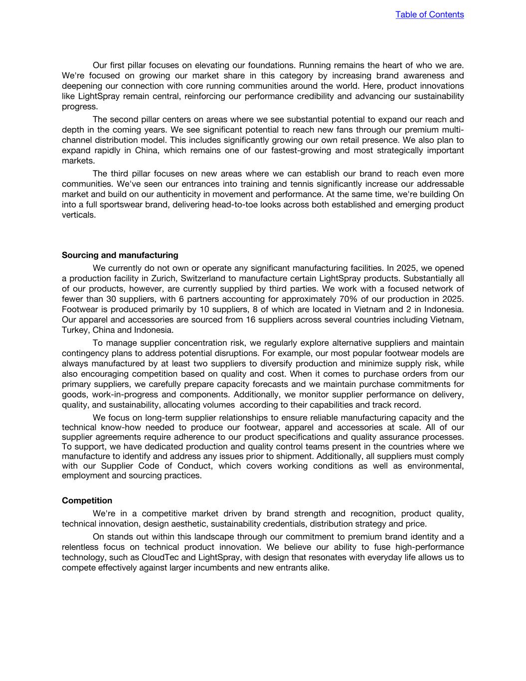 Our first pillar focuses on elevating our foundations. Running remains the heart of who we are. We're focused on growing our market share in this category by increasing brand awareness and deepening our connection with core running communities around the world. Here, product innovations like LightSpray remain central, reinforcing our performance credibility and advancing our sustainability progress. The second pillar centers on areas where we see substantial potential to expand our reach and depth in the coming years. We see significant potential to reach new fans through our premium multi- channel distribution model. This includes significantly growing our own retail presence. We also plan to expand rapidly in China, which remains one of our fastest-growing and most strategically important markets. The third pillar focuses on new areas where we can establish our brand to reach even more communities. We've seen our entrances into training and tennis significantly increase our addressable market and build on our authenticity in movement and performance. At the same time, we're building On into a full sportswear brand, delivering head-to-toe looks across both established and emerging product verticals. Sourcing and manufacturing We currently do not own or operate any significant manufacturing facilities. In 2025, we opened a production facility in Zurich, Switzerland to manufacture certain LightSpray products. Substantially all of our products, however, are currently supplied by third parties. We work with a focused network of fewer than 30 suppliers, with 6 partners accounting for approximately 70% of our production in 2025. Footwear is produced primarily by 10 suppliers, 8 of which are located in Vietnam and 2 in Indonesia. Our apparel and accessories are sourced from 16 suppliers across several countries including Vietnam, Turkey, China and Indonesia. To manage supplier concentration risk, we regularly explore alternative suppliers and maintain contingency plans to address potential disruptions. For example, our most popular footwear models are always manufactured by at least two suppliers to diversify production and minimize supply risk, while also encouraging competition based on quality and cost. When it comes to purchase orders from our primary suppliers, we carefully prepare capacity forecasts and we maintain purchase commitments for goods, work-in-progress and components. Additionally, we monitor supplier performance on delivery, quality, and sustainability, allocating volumes according to their capabilities and track record. We focus on long-term supplier relationships to ensure reliable manufacturing capacity and the technical know-how needed to produce our footwear, apparel and accessories at scale. All of our supplier agreements require adherence to our product specifications and quality assurance processes. To support, we have dedicated production and quality control teams present in the countries where we manufacture to identify and address any issues prior to shipment. Additionally, all suppliers must comply with our Supplier Code of Conduct, which covers working conditions as well as environmental, employment and sourcing practices. Competition We're in a competitive market driven by brand strength and recognition, product quality, technical innovation, design aesthetic, sustainability credentials, distribution strategy and price. On stands out within this landscape through our commitment to premium brand identity and a relentless focus on technical product innovation. We believe our ability to fuse high-performance technology, such as CloudTec and LightSpray, with design that resonates with everyday life allows us to compete effectively against larger incumbents and new entrants alike. Table of Contents
