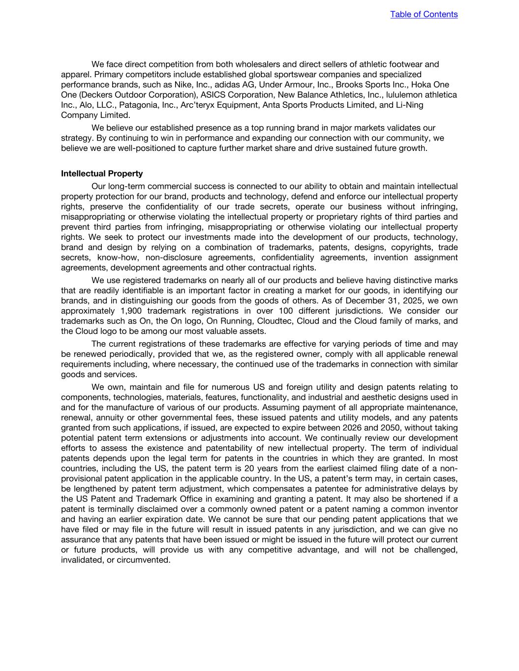 We face direct competition from both wholesalers and direct sellers of athletic footwear and apparel. Primary competitors include established global sportswear companies and specialized performance brands, such as Nike, Inc., adidas AG, Under Armour, Inc., Brooks Sports Inc., Hoka One One (Deckers Outdoor Corporation), ASICS Corporation, New Balance Athletics, Inc., lululemon athletica Inc., Alo, LLC., Patagonia, Inc., Arc’teryx Equipment, Anta Sports Products Limited, and Li-Ning Company Limited. We believe our established presence as a top running brand in major markets validates our strategy. By continuing to win in performance and expanding our connection with our community, we believe we are well-positioned to capture further market share and drive sustained future growth. Intellectual Property Our long-term commercial success is connected to our ability to obtain and maintain intellectual property protection for our brand, products and technology, defend and enforce our intellectual property rights, preserve the confidentiality of our trade secrets, operate our business without infringing, misappropriating or otherwise violating the intellectual property or proprietary rights of third parties and prevent third parties from infringing, misappropriating or otherwise violating our intellectual property rights. We seek to protect our investments made into the development of our products, technology, brand and design by relying on a combination of trademarks, patents, designs, copyrights, trade secrets, know-how, non-disclosure agreements, confidentiality agreements, invention assignment agreements, development agreements and other contractual rights. We use registered trademarks on nearly all of our products and believe having distinctive marks that are readily identifiable is an important factor in creating a market for our goods, in identifying our brands, and in distinguishing our goods from the goods of others. As of December 31, 2025, we own approximately 1,900 trademark registrations in over 100 different jurisdictions. We consider our trademarks such as On, the On logo, On Running, Cloudtec, Cloud and the Cloud family of marks, and the Cloud logo to be among our most valuable assets. The current registrations of these trademarks are effective for varying periods of time and may be renewed periodically, provided that we, as the registered owner, comply with all applicable renewal requirements including, where necessary, the continued use of the trademarks in connection with similar goods and services. We own, maintain and file for numerous US and foreign utility and design patents relating to components, technologies, materials, features, functionality, and industrial and aesthetic designs used in and for the manufacture of various of our products. Assuming payment of all appropriate maintenance, renewal, annuity or other governmental fees, these issued patents and utility models, and any patents granted from such applications, if issued, are expected to expire between 2026 and 2050, without taking potential patent term extensions or adjustments into account. We continually review our development efforts to assess the existence and patentability of new intellectual property. The term of individual patents depends upon the legal term for patents in the countries in which they are granted. In most countries, including the US, the patent term is 20 years from the earliest claimed filing date of a non- provisional patent application in the applicable country. In the US, a patent’s term may, in certain cases, be lengthened by patent term adjustment, which compensates a patentee for administrative delays by the US Patent and Trademark Office in examining and granting a patent. It may also be shortened if a patent is terminally disclaimed over a commonly owned patent or a patent naming a common inventor and having an earlier expiration date. We cannot be sure that our pending patent applications that we have filed or may file in the future will result in issued patents in any jurisdiction, and we can give no assurance that any patents that have been issued or might be issued in the future will protect our current or future products, will provide us with any competitive advantage, and will not be challenged, invalidated, or circumvented. Table of Contents