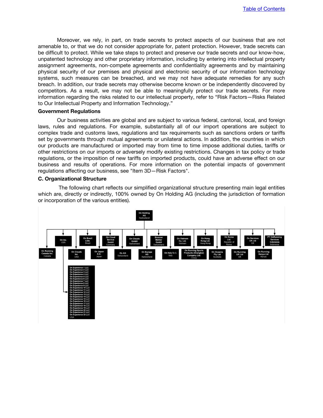 Moreover, we rely, in part, on trade secrets to protect aspects of our business that are not amenable to, or that we do not consider appropriate for, patent protection. However, trade secrets can be difficult to protect. While we take steps to protect and preserve our trade secrets and our know-how, unpatented technology and other proprietary information, including by entering into intellectual property assignment agreements, non-compete agreements and confidentiality agreements and by maintaining physical security of our premises and physical and electronic security of our information technology systems, such measures can be breached, and we may not have adequate remedies for any such breach. In addition, our trade secrets may otherwise become known or be independently discovered by competitors. As a result, we may not be able to meaningfully protect our trade secrets. For more information regarding the risks related to our intellectual property, refer to “Risk Factors—Risks Related to Our Intellectual Property and Information Technology.” Government Regulations Our business activities are global and are subject to various federal, cantonal, local, and foreign laws, rules and regulations. For example, substantially all of our import operations are subject to complex trade and customs laws, regulations and tax requirements such as sanctions orders or tariffs set by governments through mutual agreements or unilateral actions. In addition, the countries in which our products are manufactured or imported may from time to time impose additional duties, tariffs or other restrictions on our imports or adversely modify existing restrictions. Changes in tax policy or trade regulations, or the imposition of new tariffs on imported products, could have an adverse effect on our business and results of operations. For more information on the potential impacts of government regulations affecting our business, see "Item 3D—Risk Factors". C. Organizational Structure The following chart reflects our simplified organizational structure presenting main legal entities which are, directly or indirectly, 100% owned by On Holding AG (including the jurisdiction of formation or incorporation of the various entities). Table of Contents