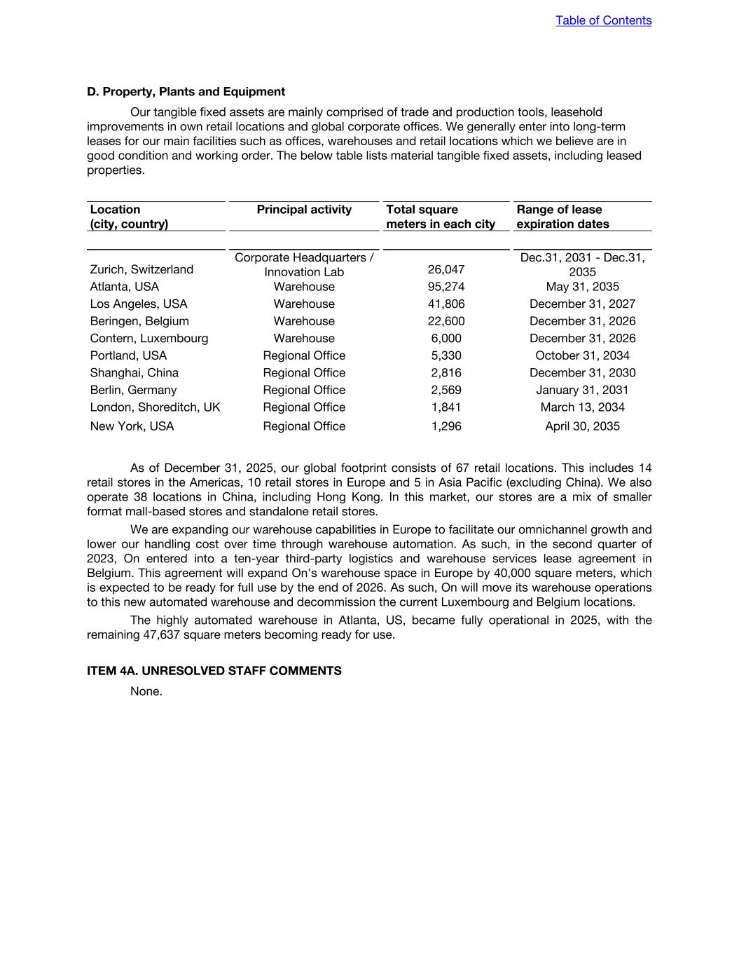 D. Property, Plants and Equipment Our tangible fixed assets are mainly comprised of trade and production tools, leasehold improvements in own retail locations and global corporate offices. We generally enter into long-term leases for our main facilities such as offices, warehouses and retail locations which we believe are in good condition and working order. The below table lists material tangible fixed assets, including leased properties. Location (city, country) Principal activity Total square meters in each city Range of lease expiration dates Zurich, Switzerland Corporate Headquarters / Innovation Lab 26,047 Dec.31, 2031 - Dec.31, 2035 Atlanta, USA Warehouse 95,274 May 31, 2035 Los Angeles, USA Warehouse 41,806 December 31, 2027 Beringen, Belgium Warehouse 22,600 December 31, 2026 Contern, Luxembourg Warehouse 6,000 December 31, 2026 Portland, USA Regional Office 5,330 October 31, 2034 Shanghai, China Regional Office 2,816 December 31, 2030 Berlin, Germany Regional Office 2,569 January 31, 2031 London, Shoreditch, UK Regional Office 1,841 March 13, 2034 New York, USA Regional Office 1,296 April 30, 2035 As of December 31, 2025, our global footprint consists of 67 retail locations. This includes 14 retail stores in the Americas, 10 retail stores in Europe and 5 in Asia Pacific (excluding China). We also operate 38 locations in China, including Hong Kong. In this market, our stores are a mix of smaller format mall-based stores and standalone retail stores. We are expanding our warehouse capabilities in Europe to facilitate our omnichannel growth and lower our handling cost over time through warehouse automation. As such, in the second quarter of 2023, On entered into a ten-year third-party logistics and warehouse services lease agreement in Belgium. This agreement will expand On's warehouse space in Europe by 40,000 square meters, which is expected to be ready for full use by the end of 2026. As such, On will move its warehouse operations to this new automated warehouse and decommission the current Luxembourg and Belgium locations. The highly automated warehouse in Atlanta, US, became fully operational in 2025, with the remaining 47,637 square meters becoming ready for use. ITEM 4A. UNRESOLVED STAFF COMMENTS None. Table of Contents