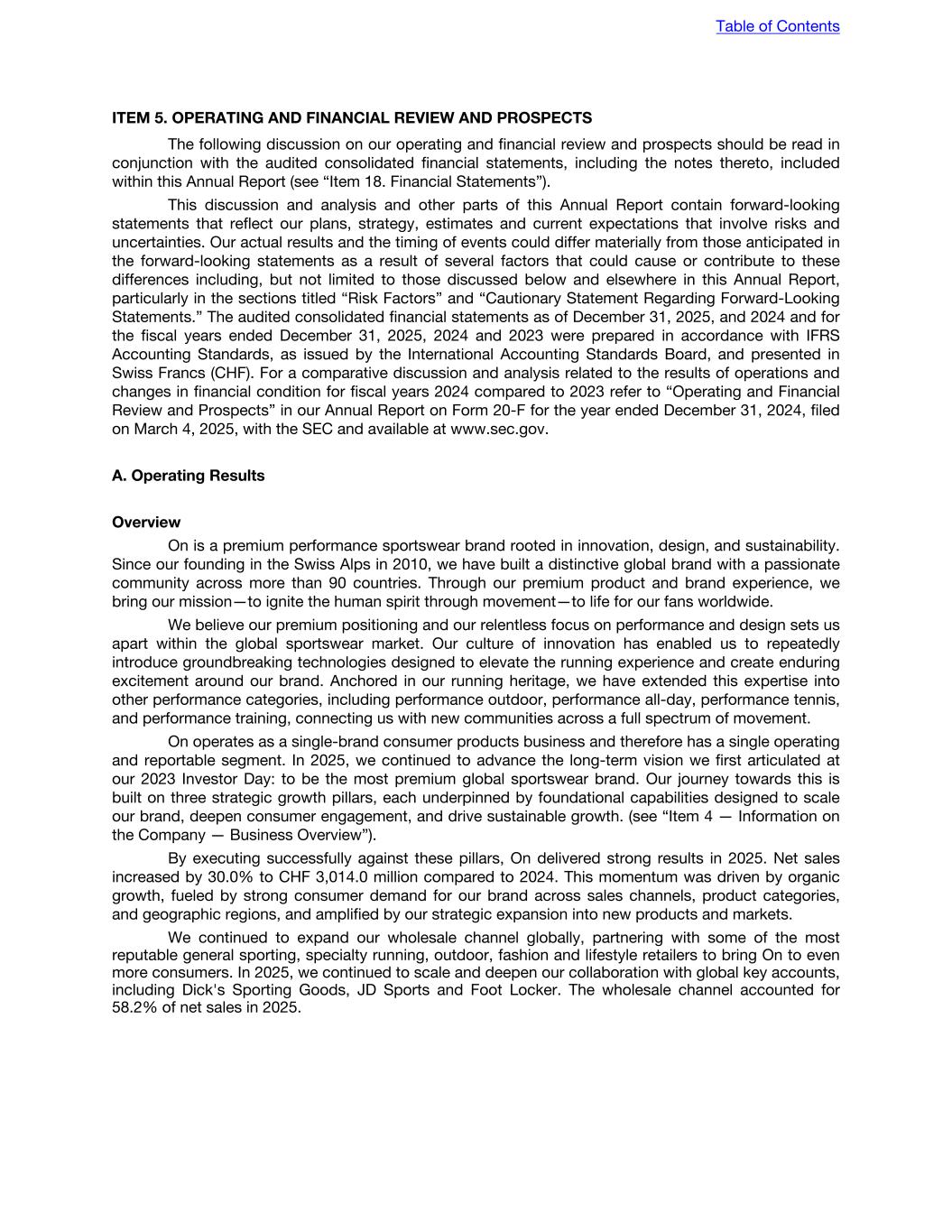 ITEM 5. OPERATING AND FINANCIAL REVIEW AND PROSPECTS The following discussion on our operating and financial review and prospects should be read in conjunction with the audited consolidated financial statements, including the notes thereto, included within this Annual Report (see “Item 18. Financial Statements”). This discussion and analysis and other parts of this Annual Report contain forward-looking statements that reflect our plans, strategy, estimates and current expectations that involve risks and uncertainties. Our actual results and the timing of events could differ materially from those anticipated in the forward-looking statements as a result of several factors that could cause or contribute to these differences including, but not limited to those discussed below and elsewhere in this Annual Report, particularly in the sections titled “Risk Factors” and “Cautionary Statement Regarding Forward-Looking Statements.” The audited consolidated financial statements as of December 31, 2025, and 2024 and for the fiscal years ended December 31, 2025, 2024 and 2023 were prepared in accordance with IFRS Accounting Standards, as issued by the International Accounting Standards Board, and presented in Swiss Francs (CHF). For a comparative discussion and analysis related to the results of operations and changes in financial condition for fiscal years 2024 compared to 2023 refer to “Operating and Financial Review and Prospects” in our Annual Report on Form 20-F for the year ended December 31, 2024, filed on March 4, 2025, with the SEC and available at www.sec.gov. A. Operating Results Overview On is a premium performance sportswear brand rooted in innovation, design, and sustainability. Since our founding in the Swiss Alps in 2010, we have built a distinctive global brand with a passionate community across more than 90 countries. Through our premium product and brand experience, we bring our mission—to ignite the human spirit through movement—to life for our fans worldwide. We believe our premium positioning and our relentless focus on performance and design sets us apart within the global sportswear market. Our culture of innovation has enabled us to repeatedly introduce groundbreaking technologies designed to elevate the running experience and create enduring excitement around our brand. Anchored in our running heritage, we have extended this expertise into other performance categories, including performance outdoor, performance all-day, performance tennis, and performance training, connecting us with new communities across a full spectrum of movement. On operates as a single-brand consumer products business and therefore has a single operating and reportable segment. In 2025, we continued to advance the long-term vision we first articulated at our 2023 Investor Day: to be the most premium global sportswear brand. Our journey towards this is built on three strategic growth pillars, each underpinned by foundational capabilities designed to scale our brand, deepen consumer engagement, and drive sustainable growth. (see “Item 4 — Information on the Company — Business Overview”). By executing successfully against these pillars, On delivered strong results in 2025. Net sales increased by 30.0% to CHF 3,014.0 million compared to 2024. This momentum was driven by organic growth, fueled by strong consumer demand for our brand across sales channels, product categories, and geographic regions, and amplified by our strategic expansion into new products and markets. We continued to expand our wholesale channel globally, partnering with some of the most reputable general sporting, specialty running, outdoor, fashion and lifestyle retailers to bring On to even more consumers. In 2025, we continued to scale and deepen our collaboration with global key accounts, including Dick's Sporting Goods, JD Sports and Foot Locker. The wholesale channel accounted for 58.2% of net sales in 2025. Table of Contents