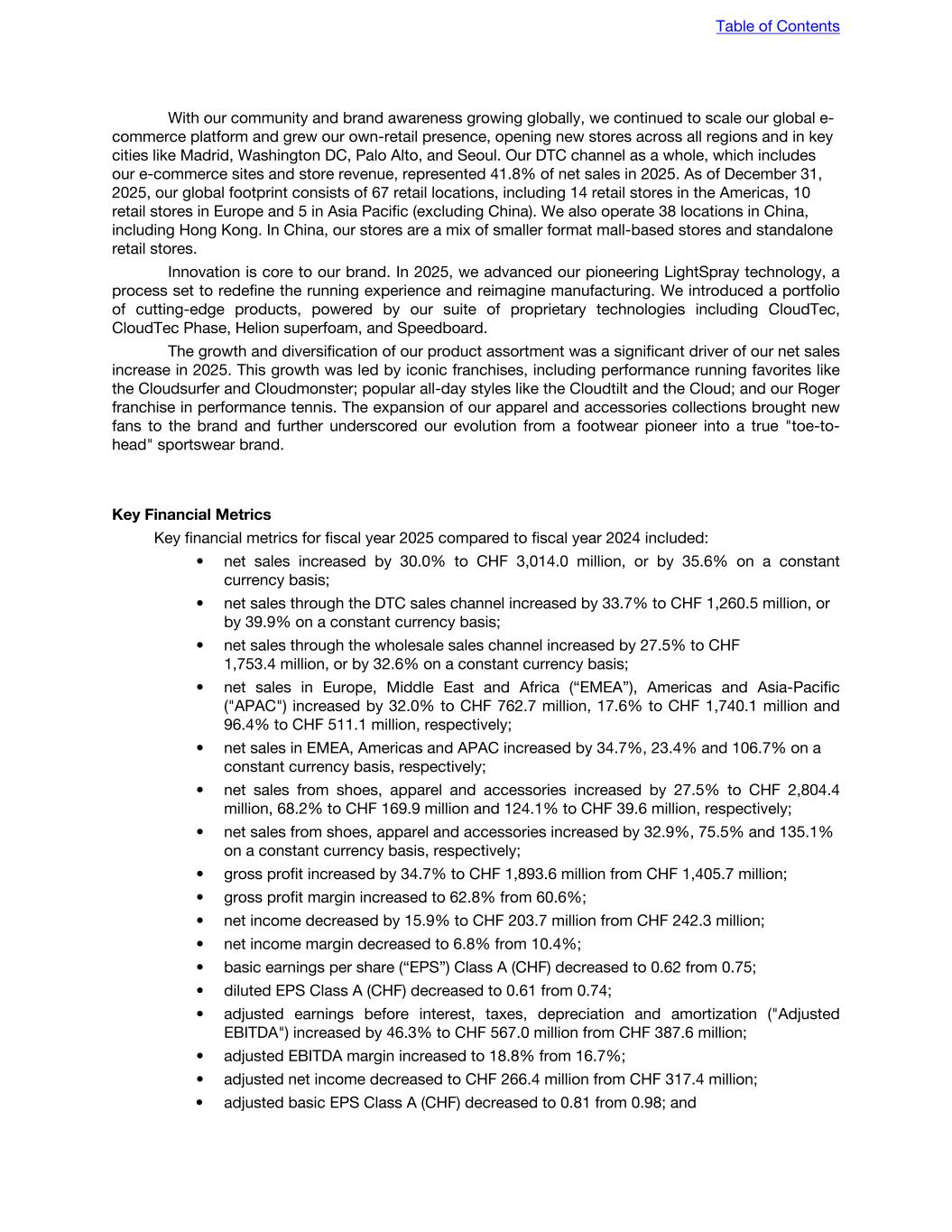 With our community and brand awareness growing globally, we continued to scale our global e- commerce platform and grew our own-retail presence, opening new stores across all regions and in key cities like Madrid, Washington DC, Palo Alto, and Seoul. Our DTC channel as a whole, which includes our e-commerce sites and store revenue, represented 41.8% of net sales in 2025. As of December 31, 2025, our global footprint consists of 67 retail locations, including 14 retail stores in the Americas, 10 retail stores in Europe and 5 in Asia Pacific (excluding China). We also operate 38 locations in China, including Hong Kong. In China, our stores are a mix of smaller format mall-based stores and standalone retail stores. Innovation is core to our brand. In 2025, we advanced our pioneering LightSpray technology, a process set to redefine the running experience and reimagine manufacturing. We introduced a portfolio of cutting-edge products, powered by our suite of proprietary technologies including CloudTec, CloudTec Phase, Helion superfoam, and Speedboard. The growth and diversification of our product assortment was a significant driver of our net sales increase in 2025. This growth was led by iconic franchises, including performance running favorites like the Cloudsurfer and Cloudmonster; popular all-day styles like the Cloudtilt and the Cloud; and our Roger franchise in performance tennis. The expansion of our apparel and accessories collections brought new fans to the brand and further underscored our evolution from a footwear pioneer into a true "toe-to- head" sportswear brand. Key Financial Metrics Key financial metrics for fiscal year 2025 compared to fiscal year 2024 included: • net sales increased by 30.0% to CHF 3,014.0 million, or by 35.6% on a constant currency basis; • net sales through the DTC sales channel increased by 33.7% to CHF 1,260.5 million, or by 39.9% on a constant currency basis; • net sales through the wholesale sales channel increased by 27.5% to CHF 1,753.4 million, or by 32.6% on a constant currency basis; • net sales in Europe, Middle East and Africa (“EMEA”), Americas and Asia-Pacific ("APAC") increased by 32.0% to CHF 762.7 million, 17.6% to CHF 1,740.1 million and 96.4% to CHF 511.1 million, respectively; • net sales in EMEA, Americas and APAC increased by 34.7%, 23.4% and 106.7% on a constant currency basis, respectively; • net sales from shoes, apparel and accessories increased by 27.5% to CHF 2,804.4 million, 68.2% to CHF 169.9 million and 124.1% to CHF 39.6 million, respectively; • net sales from shoes, apparel and accessories increased by 32.9%, 75.5% and 135.1% on a constant currency basis, respectively; • gross profit increased by 34.7% to CHF 1,893.6 million from CHF 1,405.7 million; • gross profit margin increased to 62.8% from 60.6%; • net income decreased by 15.9% to CHF 203.7 million from CHF 242.3 million; • net income margin decreased to 6.8% from 10.4%; • basic earnings per share (“EPS”) Class A (CHF) decreased to 0.62 from 0.75; • diluted EPS Class A (CHF) decreased to 0.61 from 0.74; • adjusted earnings before interest, taxes, depreciation and amortization ("Adjusted EBITDA") increased by 46.3% to CHF 567.0 million from CHF 387.6 million; • adjusted EBITDA margin increased to 18.8% from 16.7%; • adjusted net income decreased to CHF 266.4 million from CHF 317.4 million; • adjusted basic EPS Class A (CHF) decreased to 0.81 from 0.98; and Table of Contents