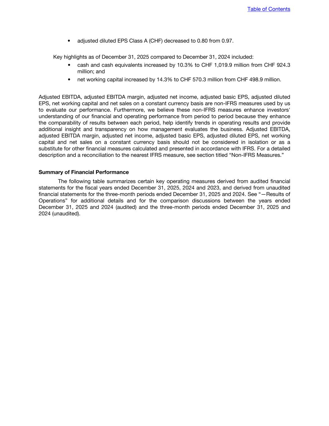 • adjusted diluted EPS Class A (CHF) decreased to 0.80 from 0.97. Key highlights as of December 31, 2025 compared to December 31, 2024 included: • cash and cash equivalents increased by 10.3% to CHF 1,019.9 million from CHF 924.3 million; and • net working capital increased by 14.3% to CHF 570.3 million from CHF 498.9 million. Adjusted EBITDA, adjusted EBITDA margin, adjusted net income, adjusted basic EPS, adjusted diluted EPS, net working capital and net sales on a constant currency basis are non-IFRS measures used by us to evaluate our performance. Furthermore, we believe these non-IFRS measures enhance investors' understanding of our financial and operating performance from period to period because they enhance the comparability of results between each period, help identify trends in operating results and provide additional insight and transparency on how management evaluates the business. Adjusted EBITDA, adjusted EBITDA margin, adjusted net income, adjusted basic EPS, adjusted diluted EPS, net working capital and net sales on a constant currency basis should not be considered in isolation or as a substitute for other financial measures calculated and presented in accordance with IFRS. For a detailed description and a reconciliation to the nearest IFRS measure, see section titled “Non-IFRS Measures.” Summary of Financial Performance The following table summarizes certain key operating measures derived from audited financial statements for the fiscal years ended December 31, 2025, 2024 and 2023, and derived from unaudited financial statements for the three-month periods ended December 31, 2025 and 2024. See “—Results of Operations” for additional details and for the comparison discussions between the years ended December 31, 2025 and 2024 (audited) and the three-month periods ended December 31, 2025 and 2024 (unaudited). Table of Contents