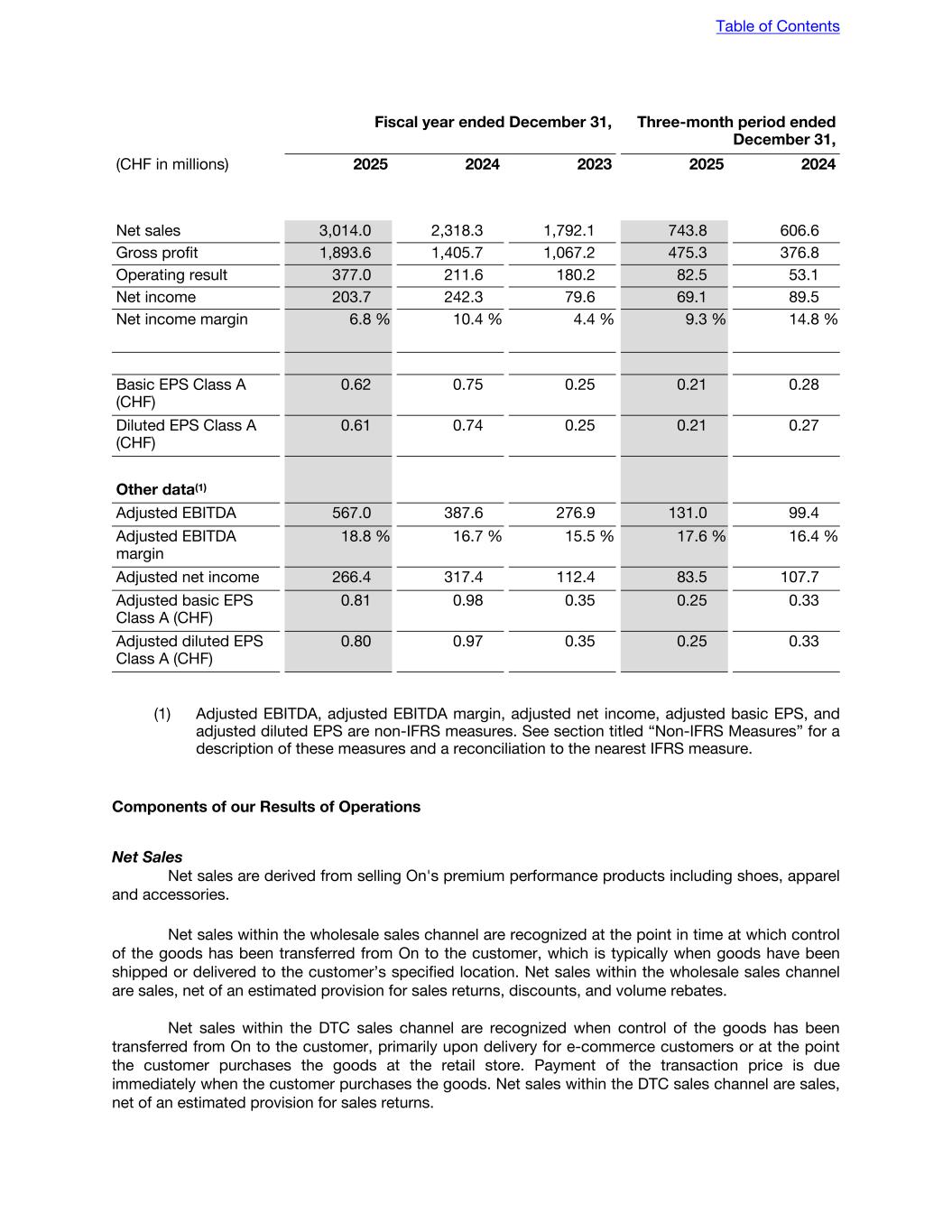Fiscal year ended December 31, Three-month period ended December 31, (CHF in millions) 2025 2024 2023 2025 2024 Net sales 3,014.0 2,318.3 1,792.1 743.8 606.6 Gross profit 1,893.6 1,405.7 1,067.2 475.3 376.8 Operating result 377.0 211.6 180.2 82.5 53.1 Net income 203.7 242.3 79.6 69.1 89.5 Net income margin 6.8 % 10.4 % 4.4 % 9.3 % 14.8 % Basic EPS Class A (CHF) 0.62 0.75 0.25 0.21 0.28 Diluted EPS Class A (CHF) 0.61 0.74 0.25 0.21 0.27 Other data(1) Adjusted EBITDA 567.0 387.6 276.9 131.0 99.4 Adjusted EBITDA margin 18.8 % 16.7 % 15.5 % 17.6 % 16.4 % Adjusted net income 266.4 317.4 112.4 83.5 107.7 Adjusted basic EPS Class A (CHF) 0.81 0.98 0.35 0.25 0.33 Adjusted diluted EPS Class A (CHF) 0.80 0.97 0.35 0.25 0.33 (1) Adjusted EBITDA, adjusted EBITDA margin, adjusted net income, adjusted basic EPS, and adjusted diluted EPS are non-IFRS measures. See section titled “Non-IFRS Measures” for a description of these measures and a reconciliation to the nearest IFRS measure. Components of our Results of Operations Net Sales Net sales are derived from selling On's premium performance products including shoes, apparel and accessories. Net sales within the wholesale sales channel are recognized at the point in time at which control of the goods has been transferred from On to the customer, which is typically when goods have been shipped or delivered to the customer’s specified location. Net sales within the wholesale sales channel are sales, net of an estimated provision for sales returns, discounts, and volume rebates. Net sales within the DTC sales channel are recognized when control of the goods has been transferred from On to the customer, primarily upon delivery for e-commerce customers or at the point the customer purchases the goods at the retail store. Payment of the transaction price is due immediately when the customer purchases the goods. Net sales within the DTC sales channel are sales, net of an estimated provision for sales returns. Table of Contents