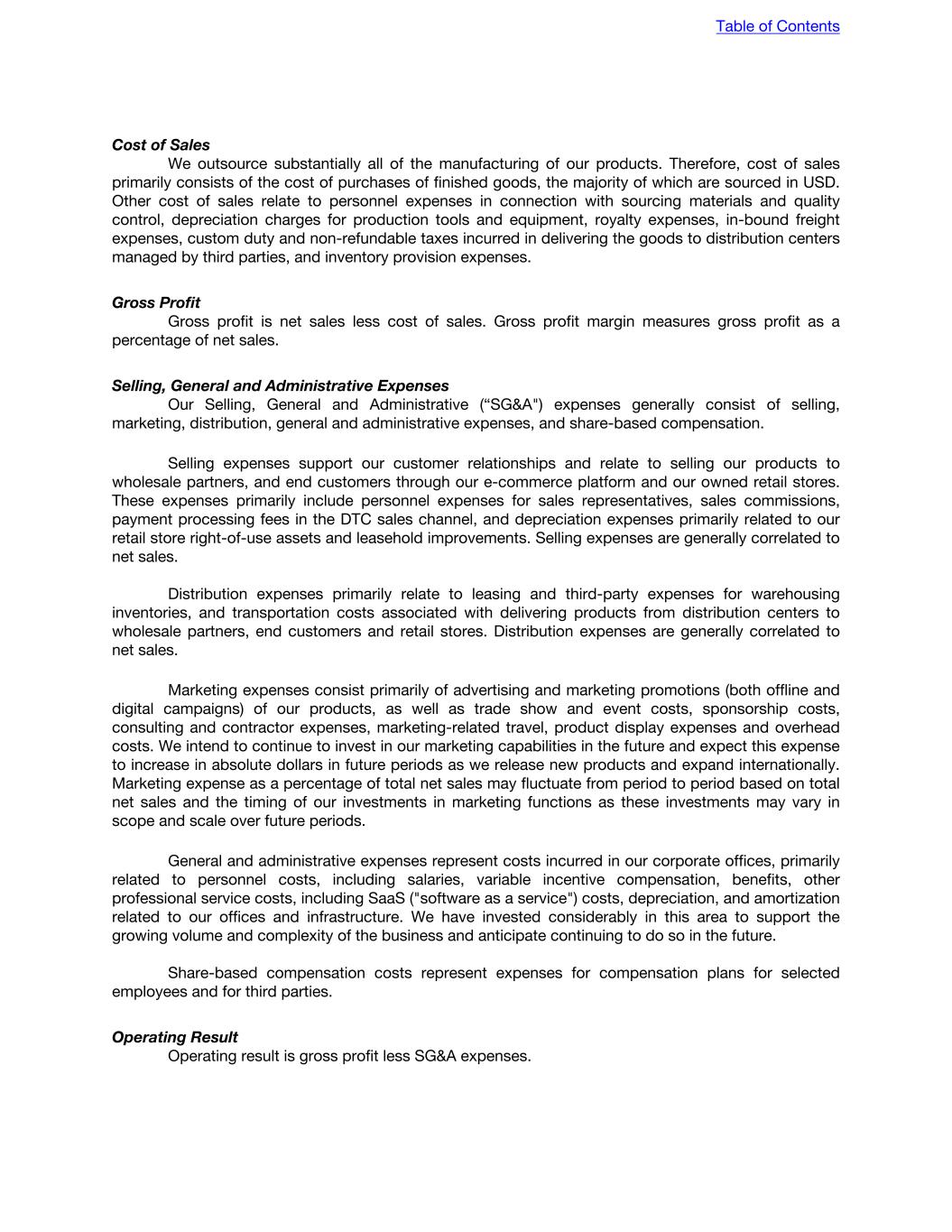 Cost of Sales We outsource substantially all of the manufacturing of our products. Therefore, cost of sales primarily consists of the cost of purchases of finished goods, the majority of which are sourced in USD. Other cost of sales relate to personnel expenses in connection with sourcing materials and quality control, depreciation charges for production tools and equipment, royalty expenses, in-bound freight expenses, custom duty and non-refundable taxes incurred in delivering the goods to distribution centers managed by third parties, and inventory provision expenses. Gross Profit Gross profit is net sales less cost of sales. Gross profit margin measures gross profit as a percentage of net sales. Selling, General and Administrative Expenses Our Selling, General and Administrative (“SG&A") expenses generally consist of selling, marketing, distribution, general and administrative expenses, and share-based compensation. Selling expenses support our customer relationships and relate to selling our products to wholesale partners, and end customers through our e-commerce platform and our owned retail stores. These expenses primarily include personnel expenses for sales representatives, sales commissions, payment processing fees in the DTC sales channel, and depreciation expenses primarily related to our retail store right-of-use assets and leasehold improvements. Selling expenses are generally correlated to net sales. Distribution expenses primarily relate to leasing and third-party expenses for warehousing inventories, and transportation costs associated with delivering products from distribution centers to wholesale partners, end customers and retail stores. Distribution expenses are generally correlated to net sales. Marketing expenses consist primarily of advertising and marketing promotions (both offline and digital campaigns) of our products, as well as trade show and event costs, sponsorship costs, consulting and contractor expenses, marketing-related travel, product display expenses and overhead costs. We intend to continue to invest in our marketing capabilities in the future and expect this expense to increase in absolute dollars in future periods as we release new products and expand internationally. Marketing expense as a percentage of total net sales may fluctuate from period to period based on total net sales and the timing of our investments in marketing functions as these investments may vary in scope and scale over future periods. General and administrative expenses represent costs incurred in our corporate offices, primarily related to personnel costs, including salaries, variable incentive compensation, benefits, other professional service costs, including SaaS ("software as a service") costs, depreciation, and amortization related to our offices and infrastructure. We have invested considerably in this area to support the growing volume and complexity of the business and anticipate continuing to do so in the future. Share-based compensation costs represent expenses for compensation plans for selected employees and for third parties. Operating Result Operating result is gross profit less SG&A expenses. Table of Contents