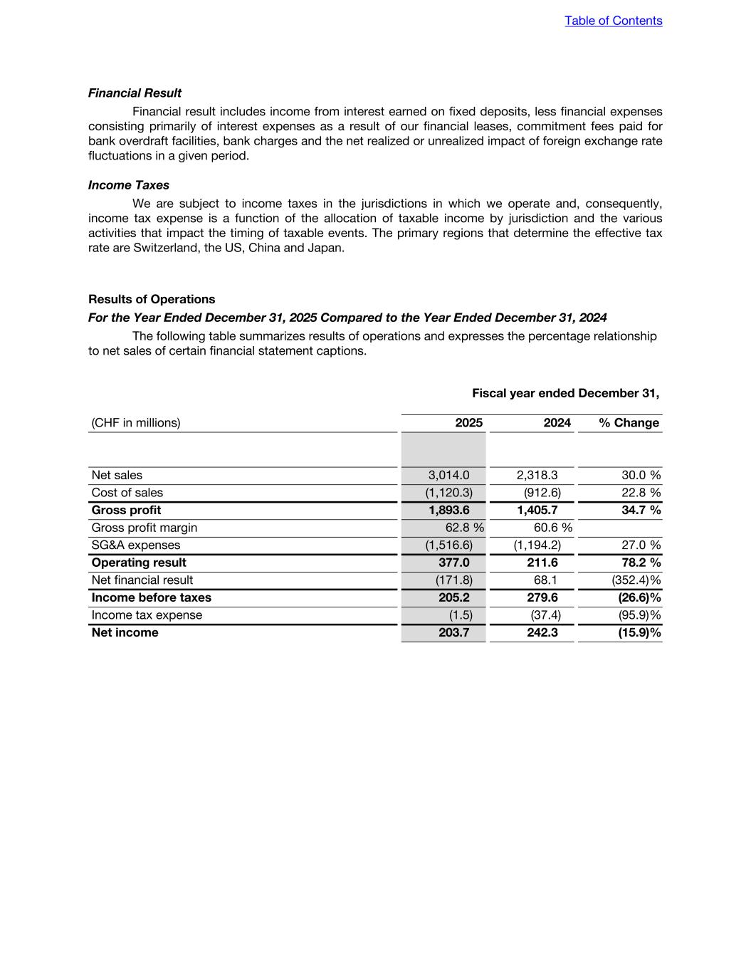 Financial Result Financial result includes income from interest earned on fixed deposits, less financial expenses consisting primarily of interest expenses as a result of our financial leases, commitment fees paid for bank overdraft facilities, bank charges and the net realized or unrealized impact of foreign exchange rate fluctuations in a given period. Income Taxes We are subject to income taxes in the jurisdictions in which we operate and, consequently, income tax expense is a function of the allocation of taxable income by jurisdiction and the various activities that impact the timing of taxable events. The primary regions that determine the effective tax rate are Switzerland, the US, China and Japan. Results of Operations For the Year Ended December 31, 2025 Compared to the Year Ended December 31, 2024 The following table summarizes results of operations and expresses the percentage relationship to net sales of certain financial statement captions. Fiscal year ended December 31, (CHF in millions) 2025 2024 % Change Net sales 3,014.0 2,318.3 30.0 % Cost of sales (1,120.3) (912.6) 22.8 % Gross profit 1,893.6 1,405.7 34.7 % Gross profit margin 62.8 % 60.6 % SG&A expenses (1,516.6) (1,194.2) 27.0 % Operating result 377.0 211.6 78.2 % Net financial result (171.8) 68.1 (352.4) % Income before taxes 205.2 279.6 (26.6) % Income tax expense (1.5) (37.4) (95.9) % Net income 203.7 242.3 (15.9) % Table of Contents