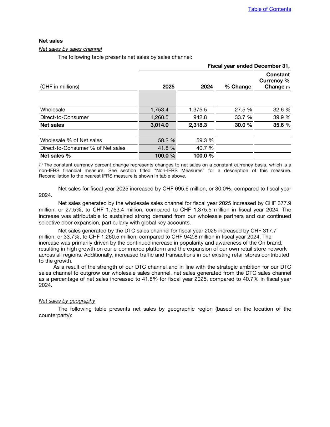 Net sales Net sales by sales channel The following table presents net sales by sales channel: Fiscal year ended December 31, (CHF in millions) 2025 2024 % Change Constant Currency % Change (1) Wholesale 1,753.4 1,375.5 27.5 % 32.6 % Direct-to-Consumer 1,260.5 942.8 33.7 % 39.9 % Net sales 3,014.0 2,318.3 30.0 % 35.6 % Wholesale % of Net sales 58.2 % 59.3 % Direct-to-Consumer % of Net sales 41.8 % 40.7 % Net sales % 100.0 % 100.0 % (1) The constant currency percent change represents changes to net sales on a constant currency basis, which is a non-IFRS financial measure. See section titled "Non-IFRS Measures" for a description of this measure. Reconciliation to the nearest IFRS measure is shown in table above. Net sales for fiscal year 2025 increased by CHF 695.6 million, or 30.0%, compared to fiscal year 2024. Net sales generated by the wholesale sales channel for fiscal year 2025 increased by CHF 377.9 million, or 27.5%, to CHF 1,753.4 million, compared to CHF 1,375.5 million in fiscal year 2024. The increase was attributable to sustained strong demand from our wholesale partners and our continued selective door expansion, particularly with global key accounts. Net sales generated by the DTC sales channel for fiscal year 2025 increased by CHF 317.7 million, or 33.7%, to CHF 1,260.5 million, compared to CHF 942.8 million in fiscal year 2024. The increase was primarily driven by the continued increase in popularity and awareness of the On brand, resulting in high growth on our e-commerce platform and the expansion of our own retail store network across all regions. Additionally, increased traffic and transactions in our existing retail stores contributed to the growth. As a result of the strength of our DTC channel and in line with the strategic ambition for our DTC sales channel to outgrow our wholesale sales channel, net sales generated from the DTC sales channel as a percentage of net sales increased to 41.8% for fiscal year 2025, compared to 40.7% in fiscal year 2024. Net sales by geography The following table presents net sales by geographic region (based on the location of the counterparty): Table of Contents