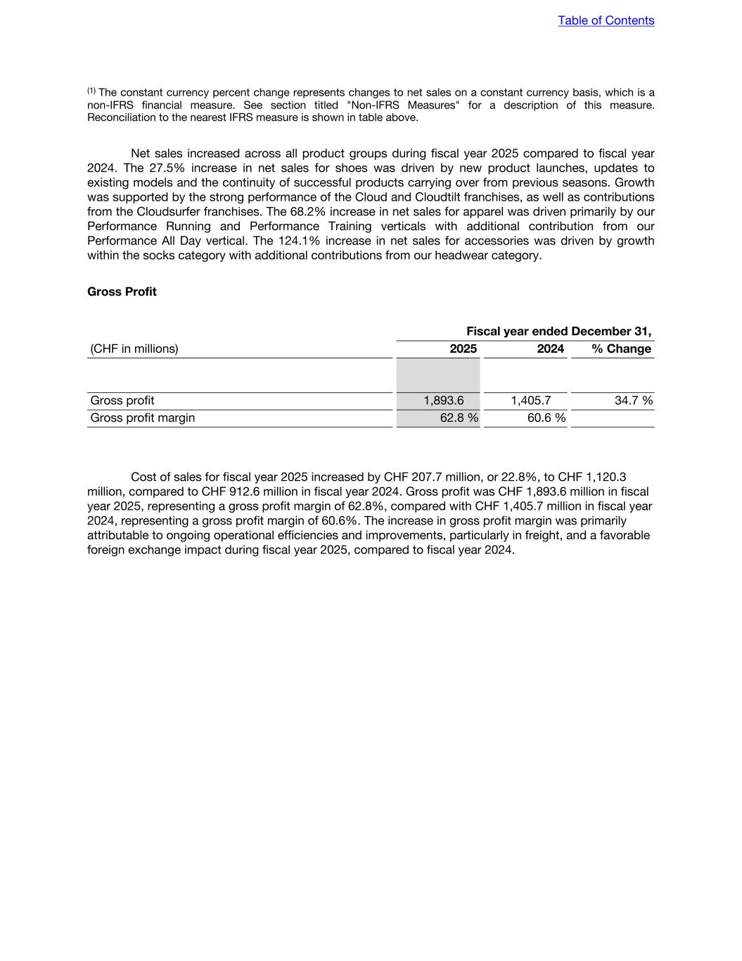 (1) The constant currency percent change represents changes to net sales on a constant currency basis, which is a non-IFRS financial measure. See section titled "Non-IFRS Measures" for a description of this measure. Reconciliation to the nearest IFRS measure is shown in table above. Net sales increased across all product groups during fiscal year 2025 compared to fiscal year 2024. The 27.5% increase in net sales for shoes was driven by new product launches, updates to existing models and the continuity of successful products carrying over from previous seasons. Growth was supported by the strong performance of the Cloud and Cloudtilt franchises, as well as contributions from the Cloudsurfer franchises. The 68.2% increase in net sales for apparel was driven primarily by our Performance Running and Performance Training verticals with additional contribution from our Performance All Day vertical. The 124.1% increase in net sales for accessories was driven by growth within the socks category with additional contributions from our headwear category. Gross Profit Fiscal year ended December 31, (CHF in millions) 2025 2024 % Change Gross profit 1,893.6 1,405.7 34.7 % Gross profit margin 62.8 % 60.6 % Cost of sales for fiscal year 2025 increased by CHF 207.7 million, or 22.8%, to CHF 1,120.3 million, compared to CHF 912.6 million in fiscal year 2024. Gross profit was CHF 1,893.6 million in fiscal year 2025, representing a gross profit margin of 62.8%, compared with CHF 1,405.7 million in fiscal year 2024, representing a gross profit margin of 60.6%. The increase in gross profit margin was primarily attributable to ongoing operational efficiencies and improvements, particularly in freight, and a favorable foreign exchange impact during fiscal year 2025, compared to fiscal year 2024. Table of Contents
