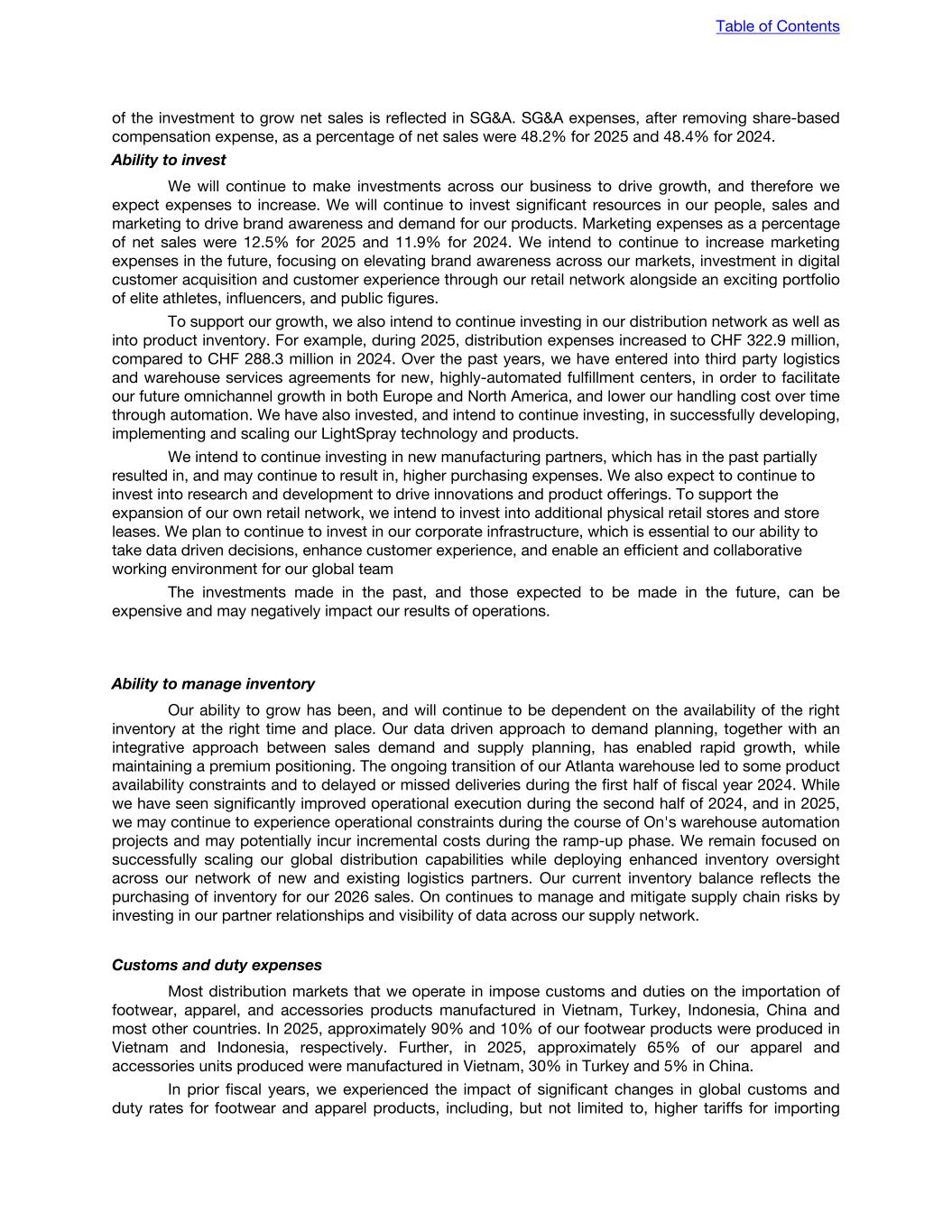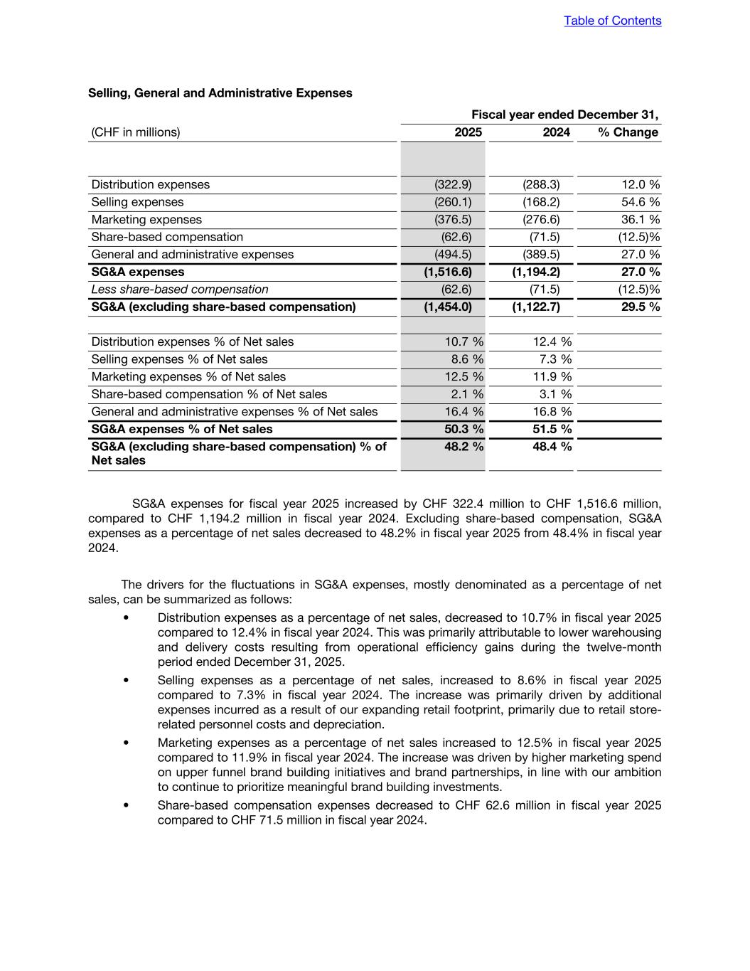 Selling, General and Administrative Expenses Fiscal year ended December 31, (CHF in millions) 2025 2024 % Change Distribution expenses (322.9) (288.3) 12.0 % Selling expenses (260.1) (168.2) 54.6 % Marketing expenses (376.5) (276.6) 36.1 % Share-based compensation (62.6) (71.5) (12.5) % General and administrative expenses (494.5) (389.5) 27.0 % SG&A expenses (1,516.6) (1,194.2) 27.0 % Less share-based compensation (62.6) (71.5) (12.5) % SG&A (excluding share-based compensation) (1,454.0) (1,122.7) 29.5 % Distribution expenses % of Net sales 10.7 % 12.4 % Selling expenses % of Net sales 8.6 % 7.3 % Marketing expenses % of Net sales 12.5 % 11.9 % Share-based compensation % of Net sales 2.1 % 3.1 % General and administrative expenses % of Net sales 16.4 % 16.8 % SG&A expenses % of Net sales 50.3 % 51.5 % SG&A (excluding share-based compensation) % of Net sales 48.2 % 48.4 % SG&A expenses for fiscal year 2025 increased by CHF 322.4 million to CHF 1,516.6 million, compared to CHF 1,194.2 million in fiscal year 2024. Excluding share-based compensation, SG&A expenses as a percentage of net sales decreased to 48.2% in fiscal year 2025 from 48.4% in fiscal year 2024. The drivers for the fluctuations in SG&A expenses, mostly denominated as a percentage of net sales, can be summarized as follows: • Distribution expenses as a percentage of net sales, decreased to 10.7% in fiscal year 2025 compared to 12.4% in fiscal year 2024. This was primarily attributable to lower warehousing and delivery costs resulting from operational efficiency gains during the twelve-month period ended December 31, 2025. • Selling expenses as a percentage of net sales, increased to 8.6% in fiscal year 2025 compared to 7.3% in fiscal year 2024. The increase was primarily driven by additional expenses incurred as a result of our expanding retail footprint, primarily due to retail store- related personnel costs and depreciation. • Marketing expenses as a percentage of net sales increased to 12.5% in fiscal year 2025 compared to 11.9% in fiscal year 2024. The increase was driven by higher marketing spend on upper funnel brand building initiatives and brand partnerships, in line with our ambition to continue to prioritize meaningful brand building investments. • Share-based compensation expenses decreased to CHF 62.6 million in fiscal year 2025 compared to CHF 71.5 million in fiscal year 2024. Table of Contents