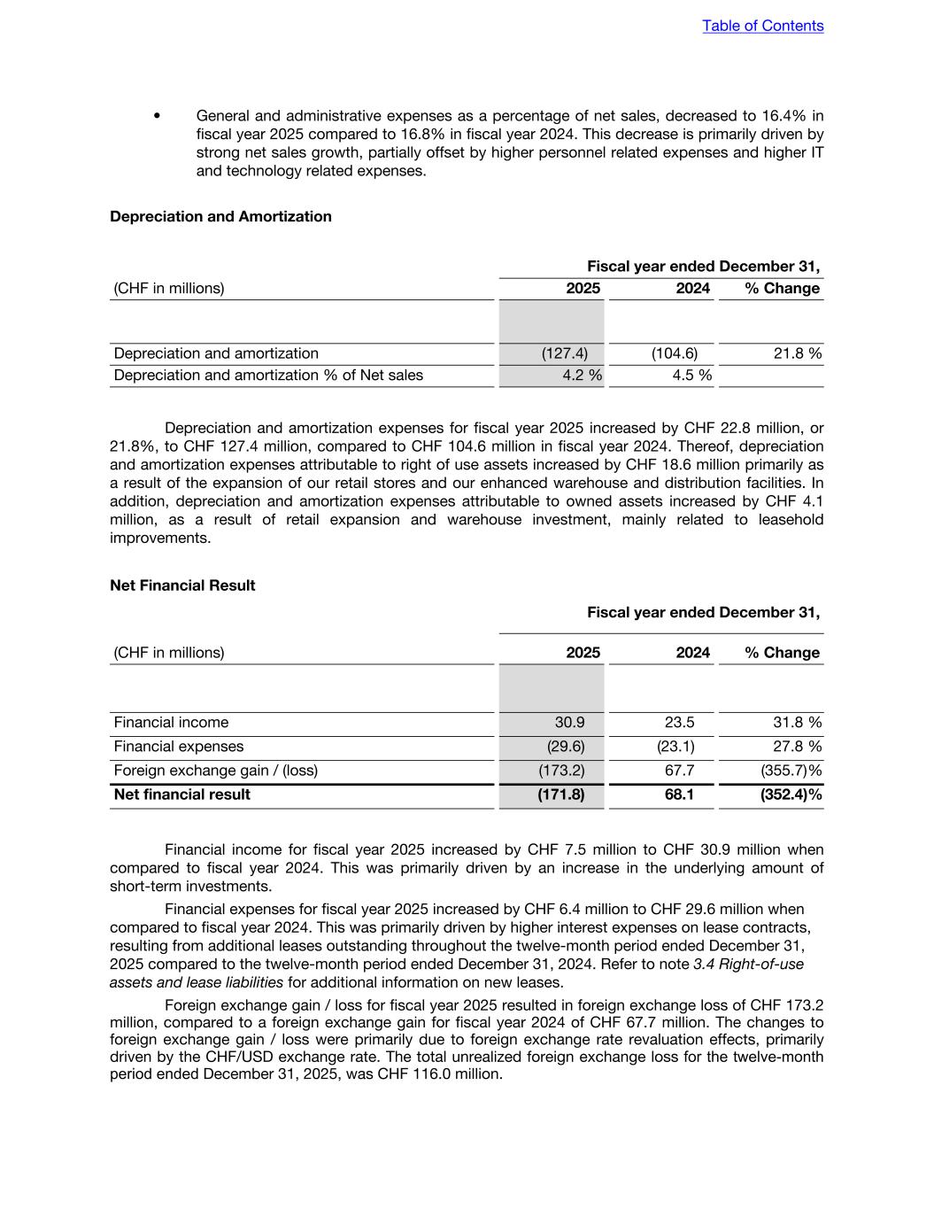 • General and administrative expenses as a percentage of net sales, decreased to 16.4% in fiscal year 2025 compared to 16.8% in fiscal year 2024. This decrease is primarily driven by strong net sales growth, partially offset by higher personnel related expenses and higher IT and technology related expenses. Depreciation and Amortization Fiscal year ended December 31, (CHF in millions) 2025 2024 % Change Depreciation and amortization (127.4) (104.6) 21.8 % Depreciation and amortization % of Net sales 4.2 % 4.5 % Depreciation and amortization expenses for fiscal year 2025 increased by CHF 22.8 million, or 21.8%, to CHF 127.4 million, compared to CHF 104.6 million in fiscal year 2024. Thereof, depreciation and amortization expenses attributable to right of use assets increased by CHF 18.6 million primarily as a result of the expansion of our retail stores and our enhanced warehouse and distribution facilities. In addition, depreciation and amortization expenses attributable to owned assets increased by CHF 4.1 million, as a result of retail expansion and warehouse investment, mainly related to leasehold improvements. Net Financial Result Fiscal year ended December 31, (CHF in millions) 2025 2024 % Change Financial income 30.9 23.5 31.8 % Financial expenses (29.6) (23.1) 27.8 % Foreign exchange gain / (loss) (173.2) 67.7 (355.7) % Net financial result (171.8) 68.1 (352.4) % Financial income for fiscal year 2025 increased by CHF 7.5 million to CHF 30.9 million when compared to fiscal year 2024. This was primarily driven by an increase in the underlying amount of short-term investments. Financial expenses for fiscal year 2025 increased by CHF 6.4 million to CHF 29.6 million when compared to fiscal year 2024. This was primarily driven by higher interest expenses on lease contracts, resulting from additional leases outstanding throughout the twelve-month period ended December 31, 2025 compared to the twelve-month period ended December 31, 2024. Refer to note 3.4 Right-of-use assets and lease liabilities for additional information on new leases. Foreign exchange gain / loss for fiscal year 2025 resulted in foreign exchange loss of CHF 173.2 million, compared to a foreign exchange gain for fiscal year 2024 of CHF 67.7 million. The changes to foreign exchange gain / loss were primarily due to foreign exchange rate revaluation effects, primarily driven by the CHF/USD exchange rate. The total unrealized foreign exchange loss for the twelve-month period ended December 31, 2025, was CHF 116.0 million. Table of Contents